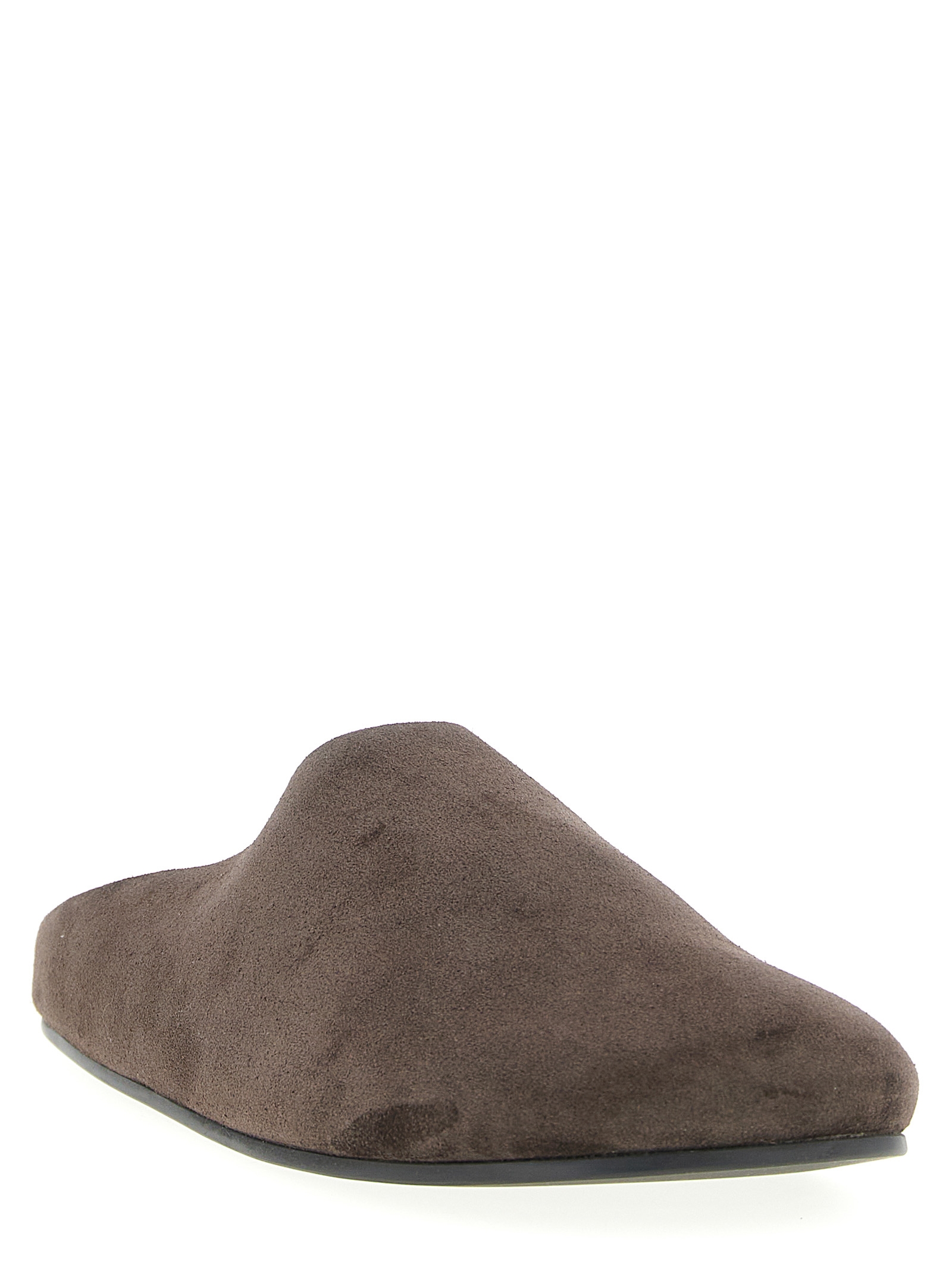 ‘Hudson’ suede sabots with round toe, shaped footbed, rubber sole.