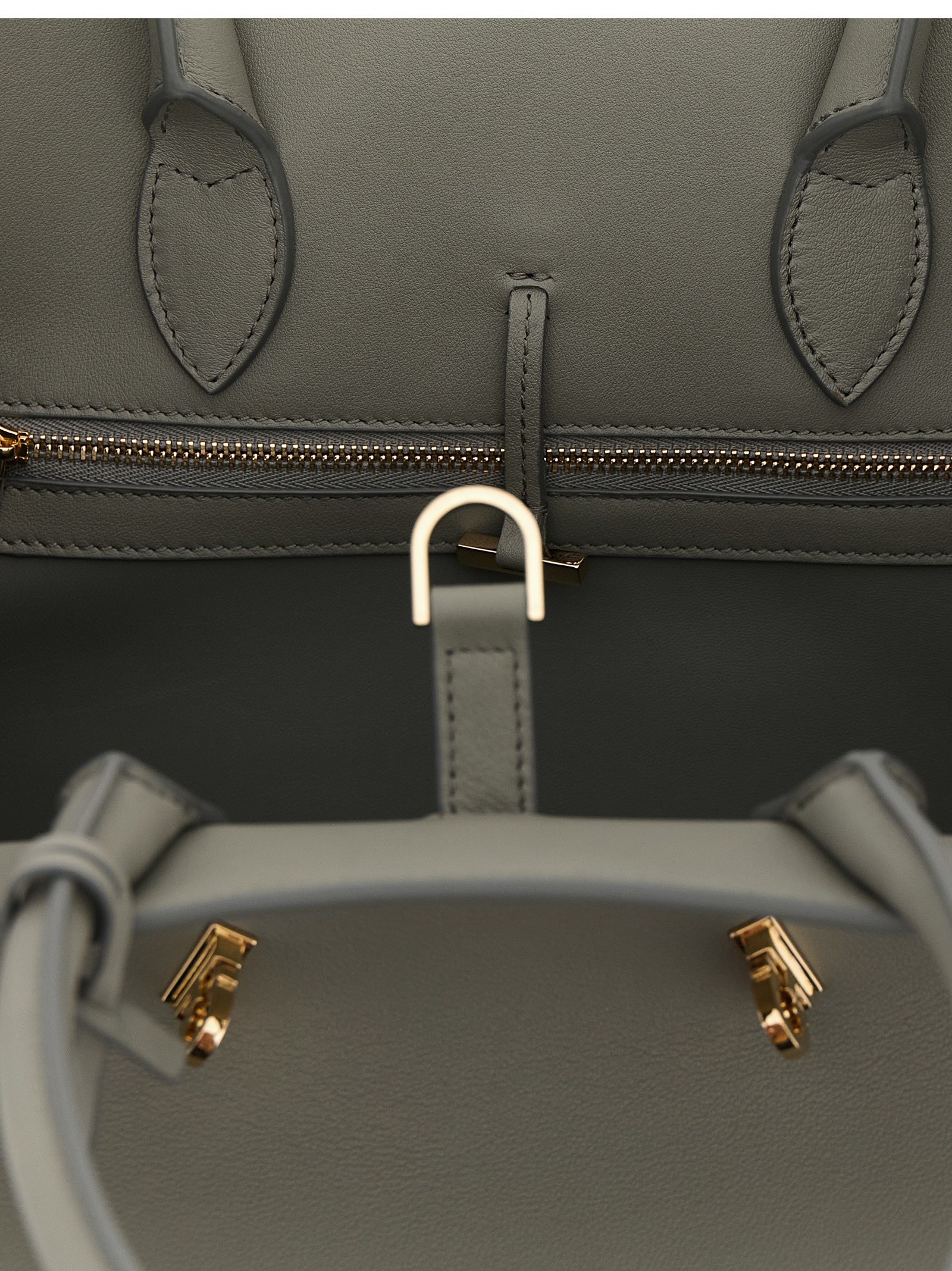 ‘Hug (M)’ handbag in calf leather treated with vegetable anilines, front embossed logo, side gussets with metal ‘Gancini’ decoration, inner bitter closure, double fixed tubular handle, rigid base with metal feet, adjustable and removable shoulder strap, removable keyring.