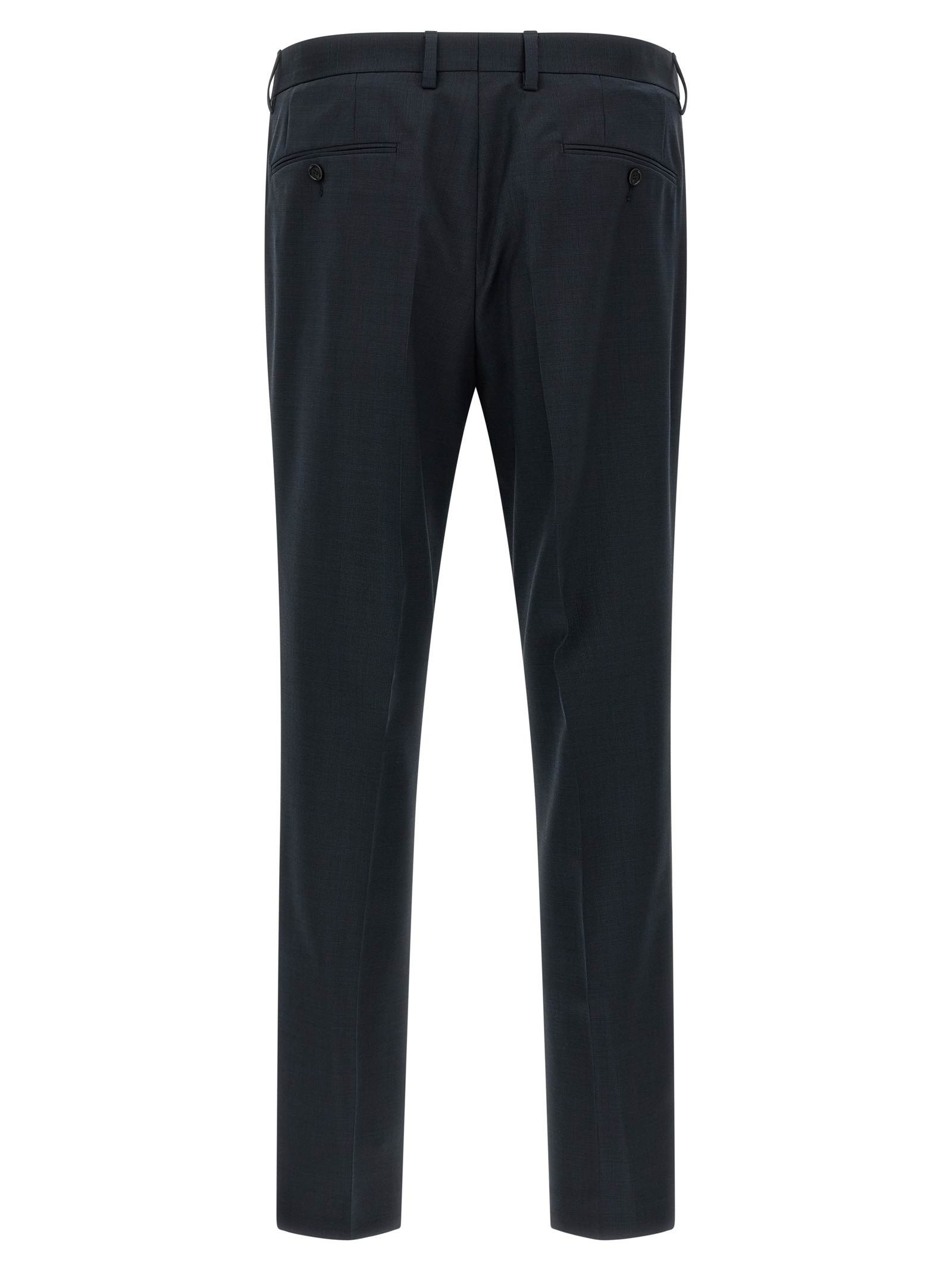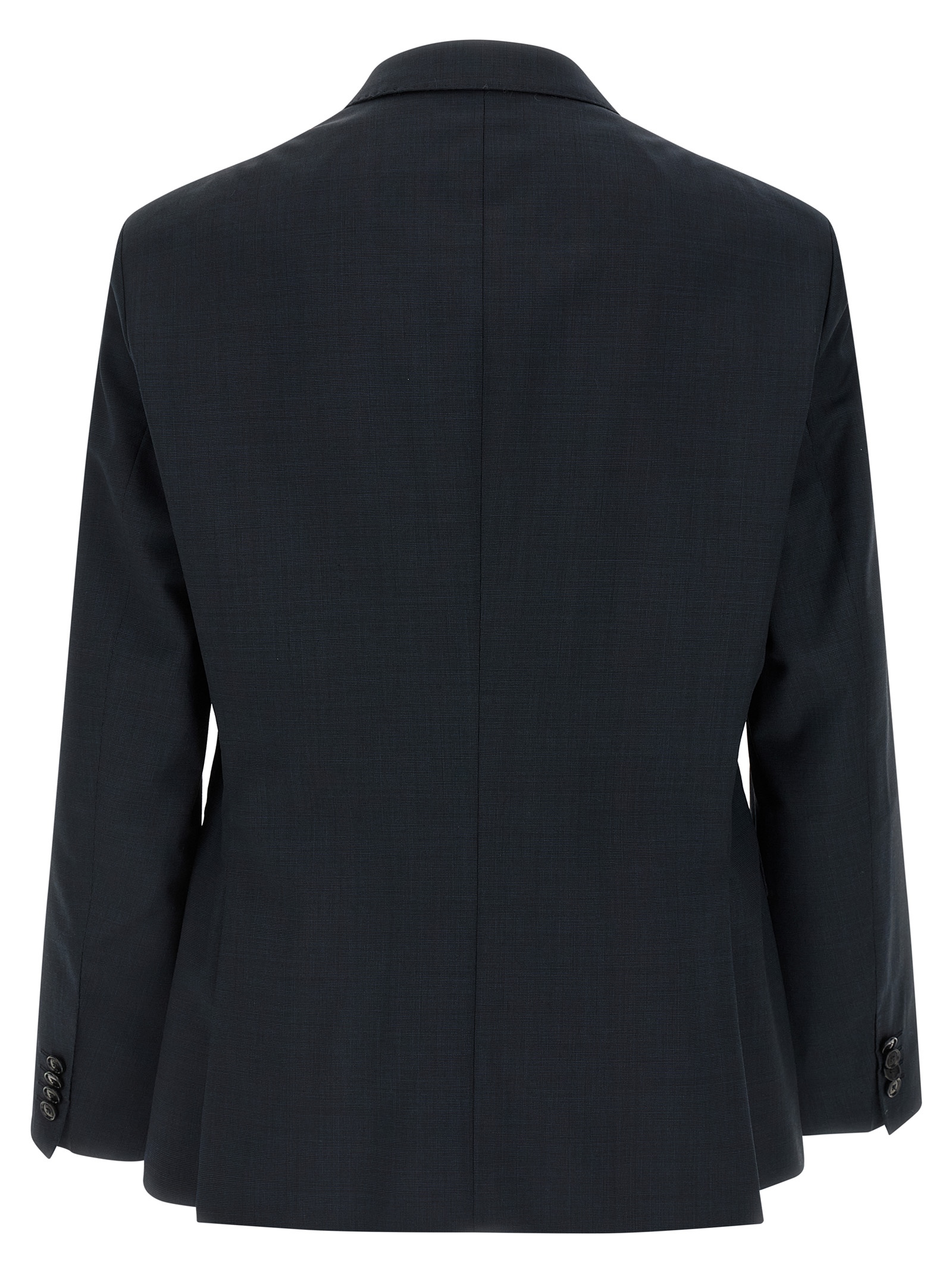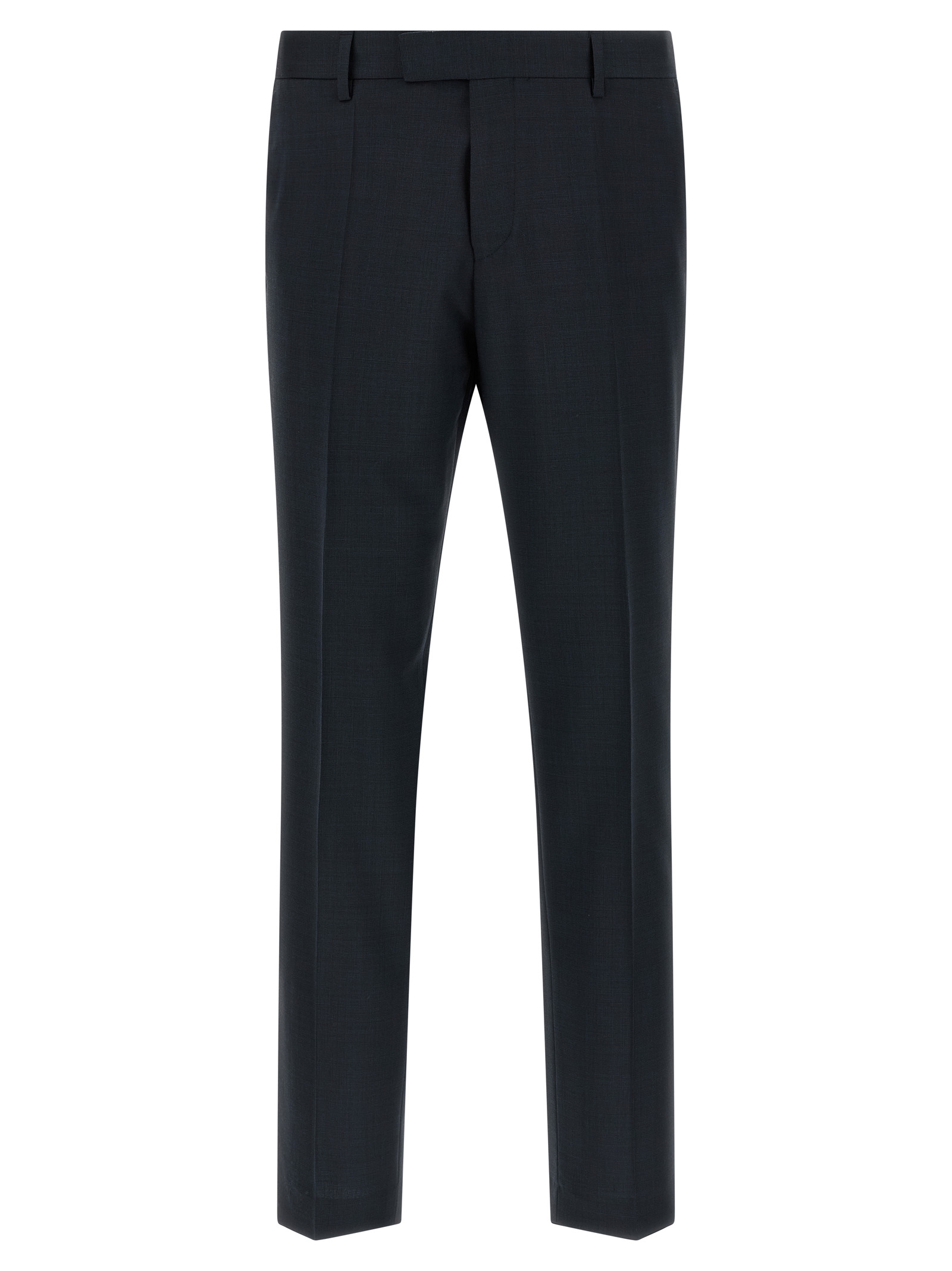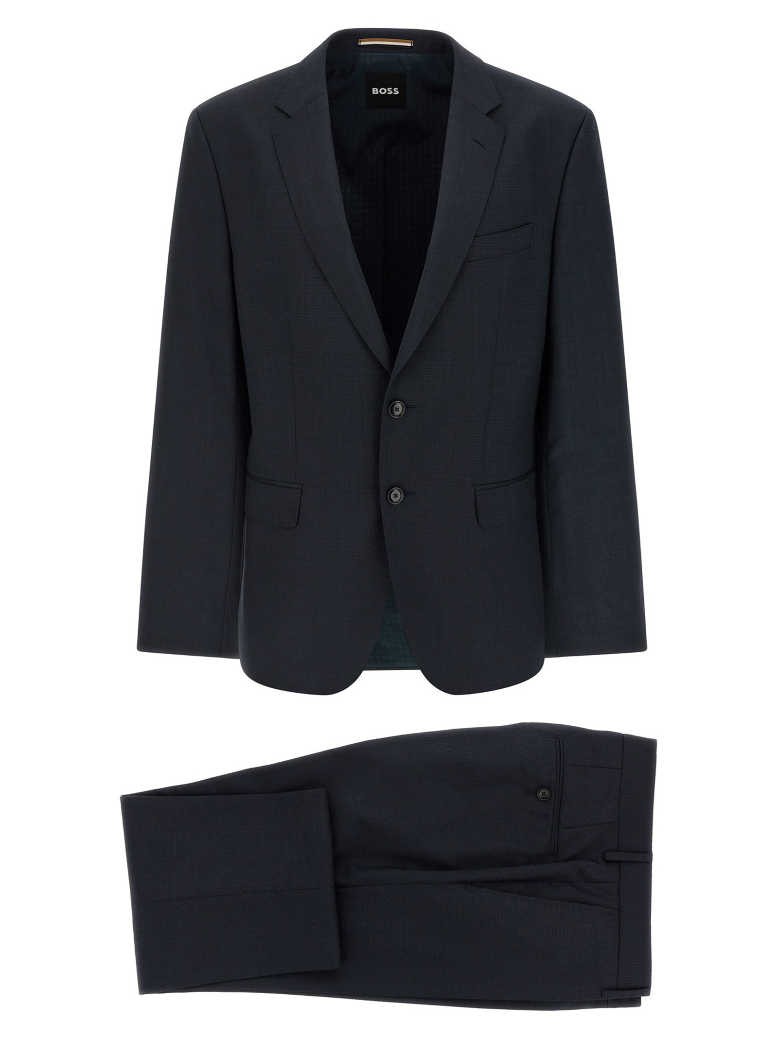 ‘Huge’ dress – Micro texture virgin wool ‘Marzotto’ line consisting of single-breasted blazer with front two-button closure, mirror lapels, breast pocket, flap pockets, structured shoulder strap, buttonhole cuffs, back vents, monogram lining, two inner pockets and stretched pleat trousers, front pockets’ americane’, back welt pockets, front zip and hook closure, viscose lining.