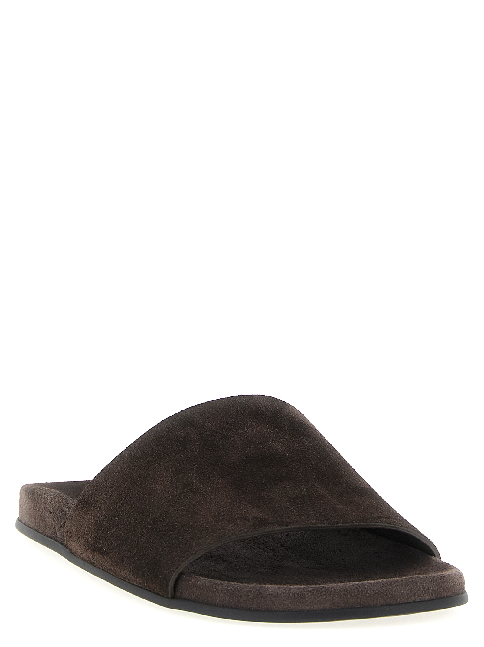 ‘Hugh’ suede slides, shaped footbed, rubber sole.