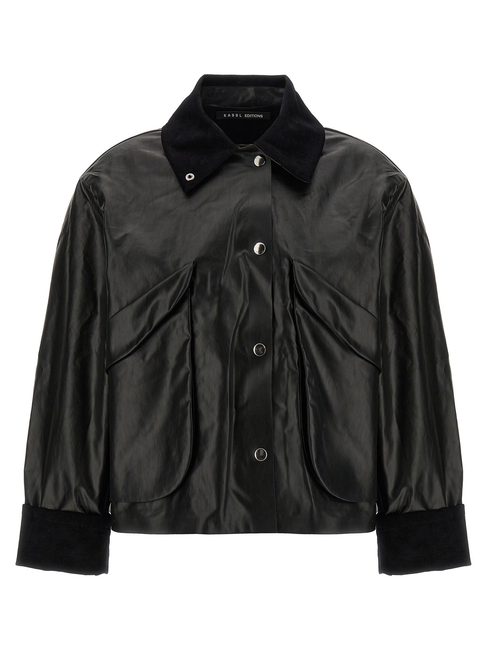 ‘Hunting’ jacket in coated effect cotton blend, crop style with snap button closure, slightly padded and lined, external and internal pockets, contrasting corduroy collar.