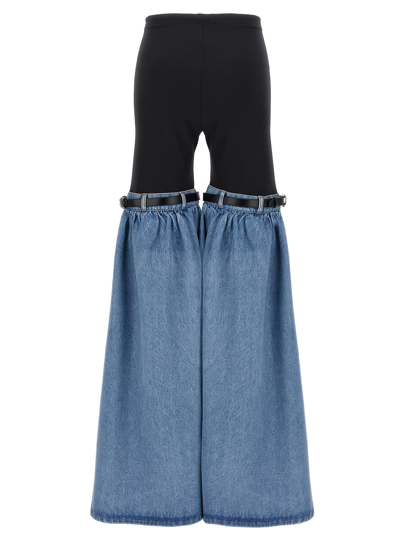 ‘Hybrid Denim Flare’ pants in stretch synthetic fabric on the upper part, elastic waistband, leather strap detail in the middle of the leg from which begins a cotton denim fabric with a wide and flared silhouette.