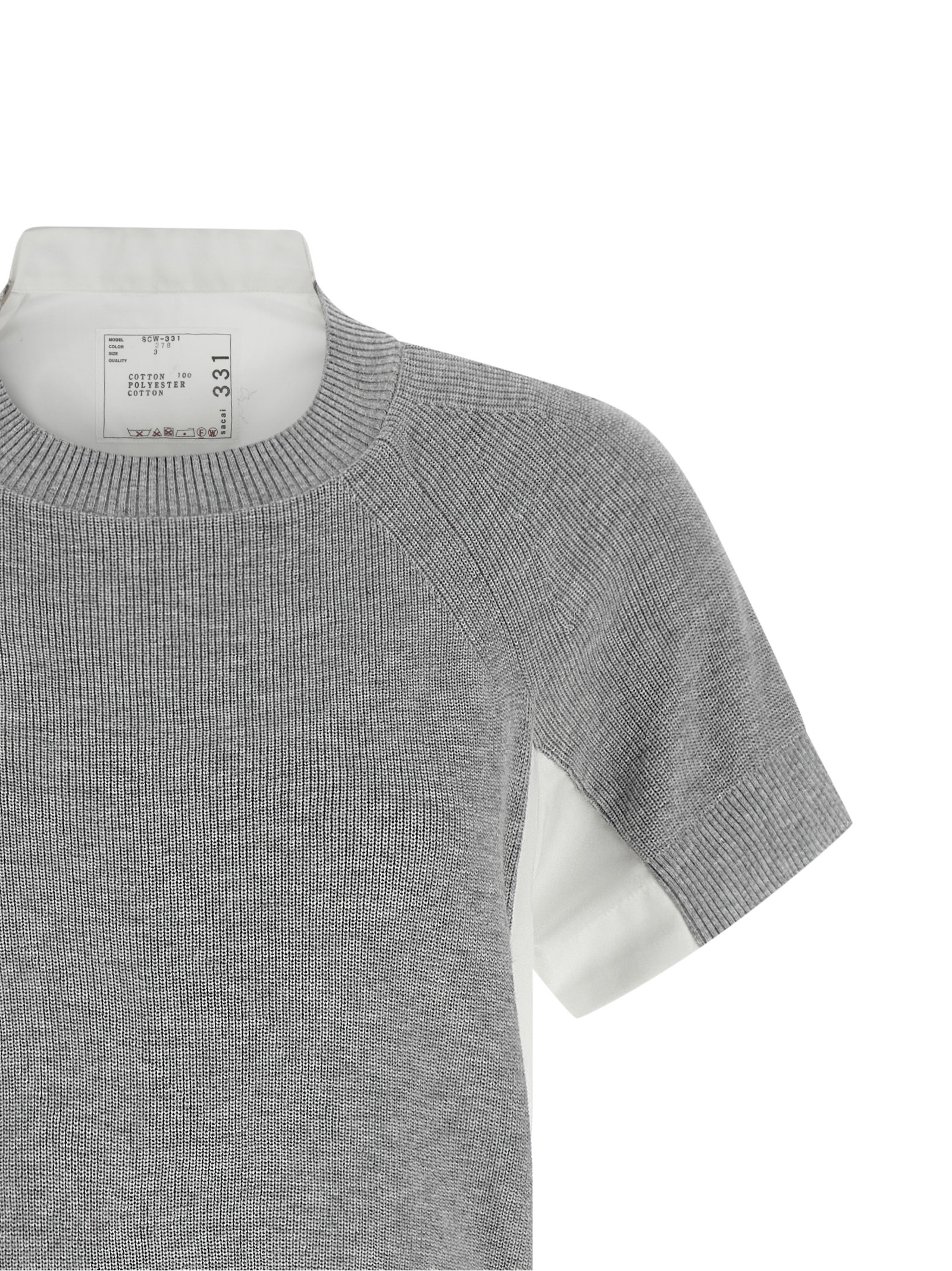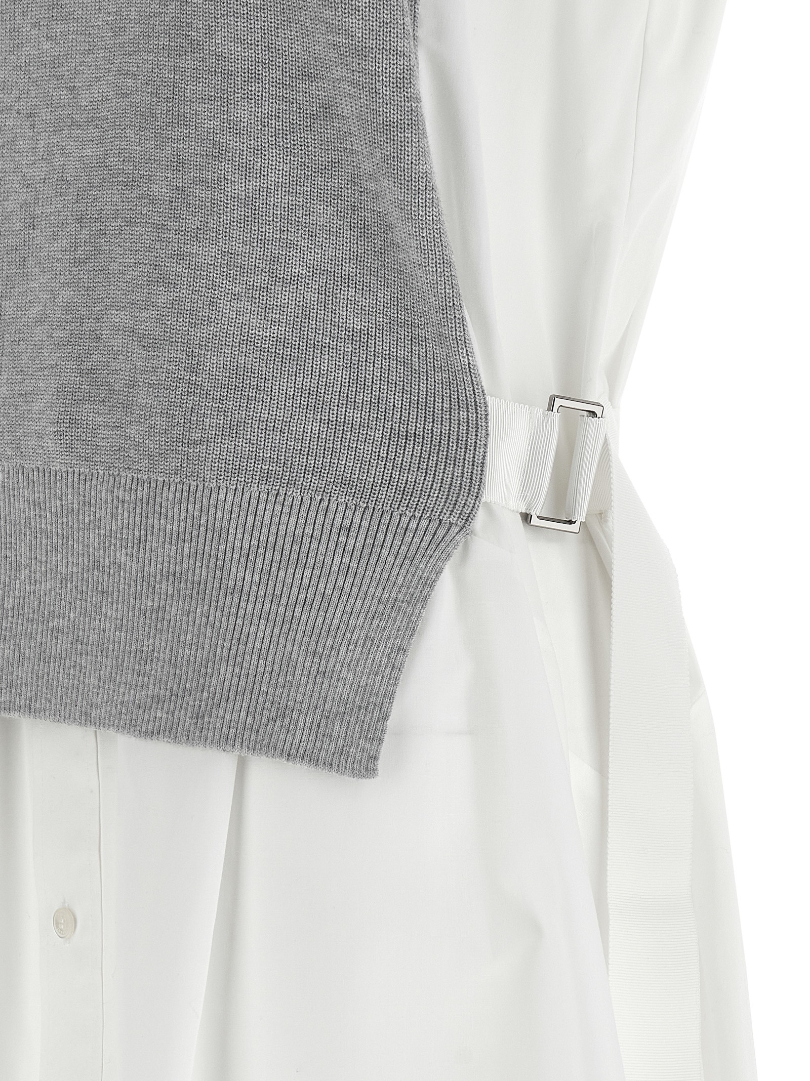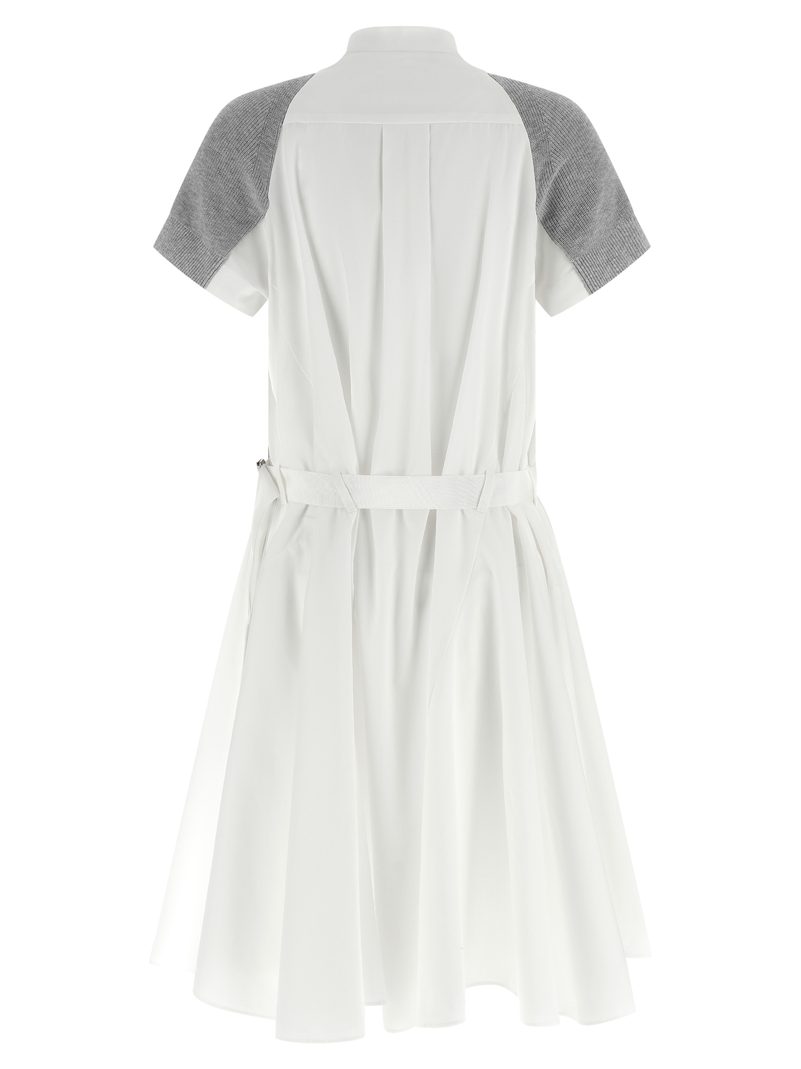 Hybrid midi dress consisting of flared cotton poplin body with front button closure, short sleeves, removable belt and contrasting knitted cotton blend front and a crewneck.