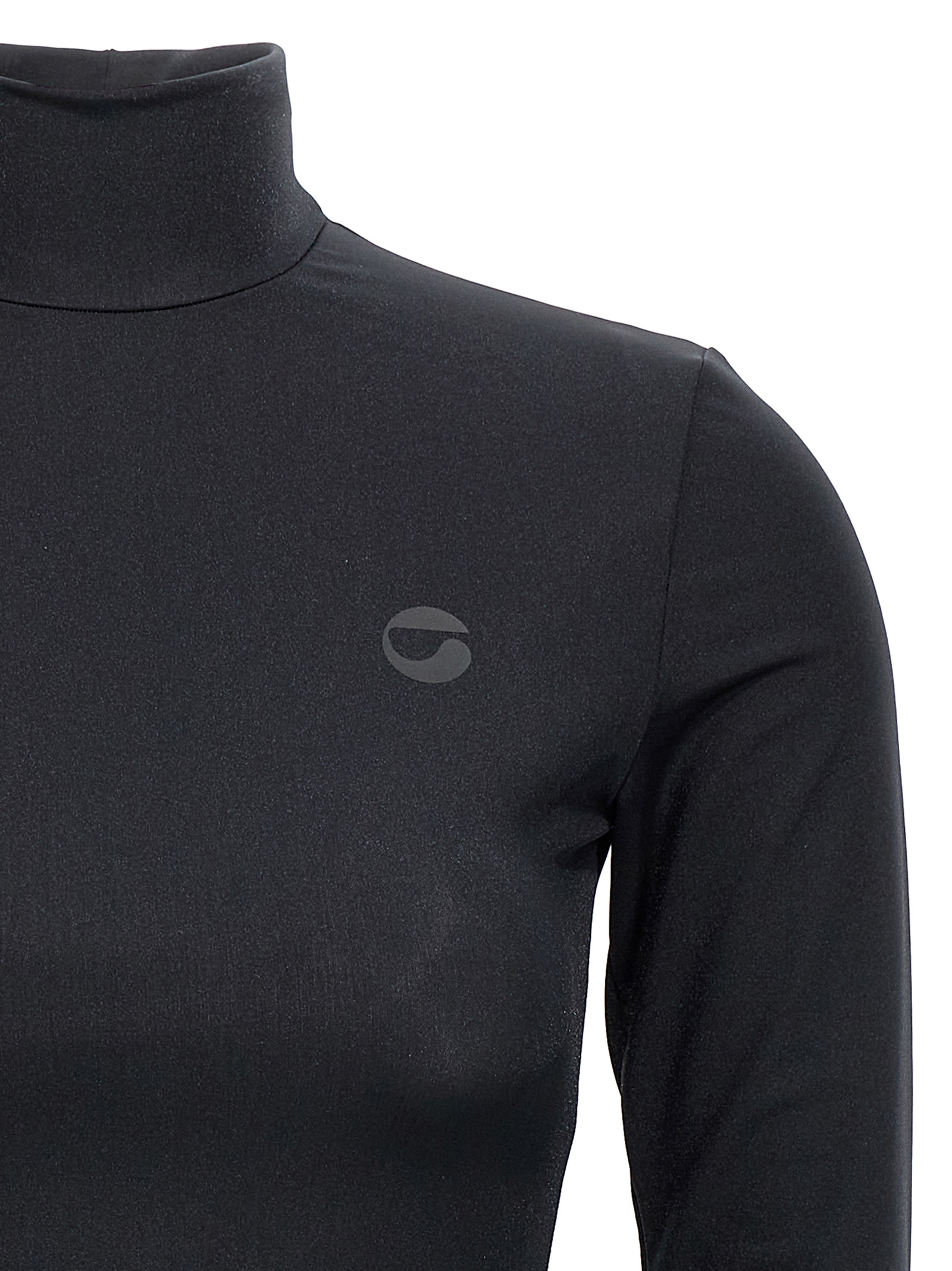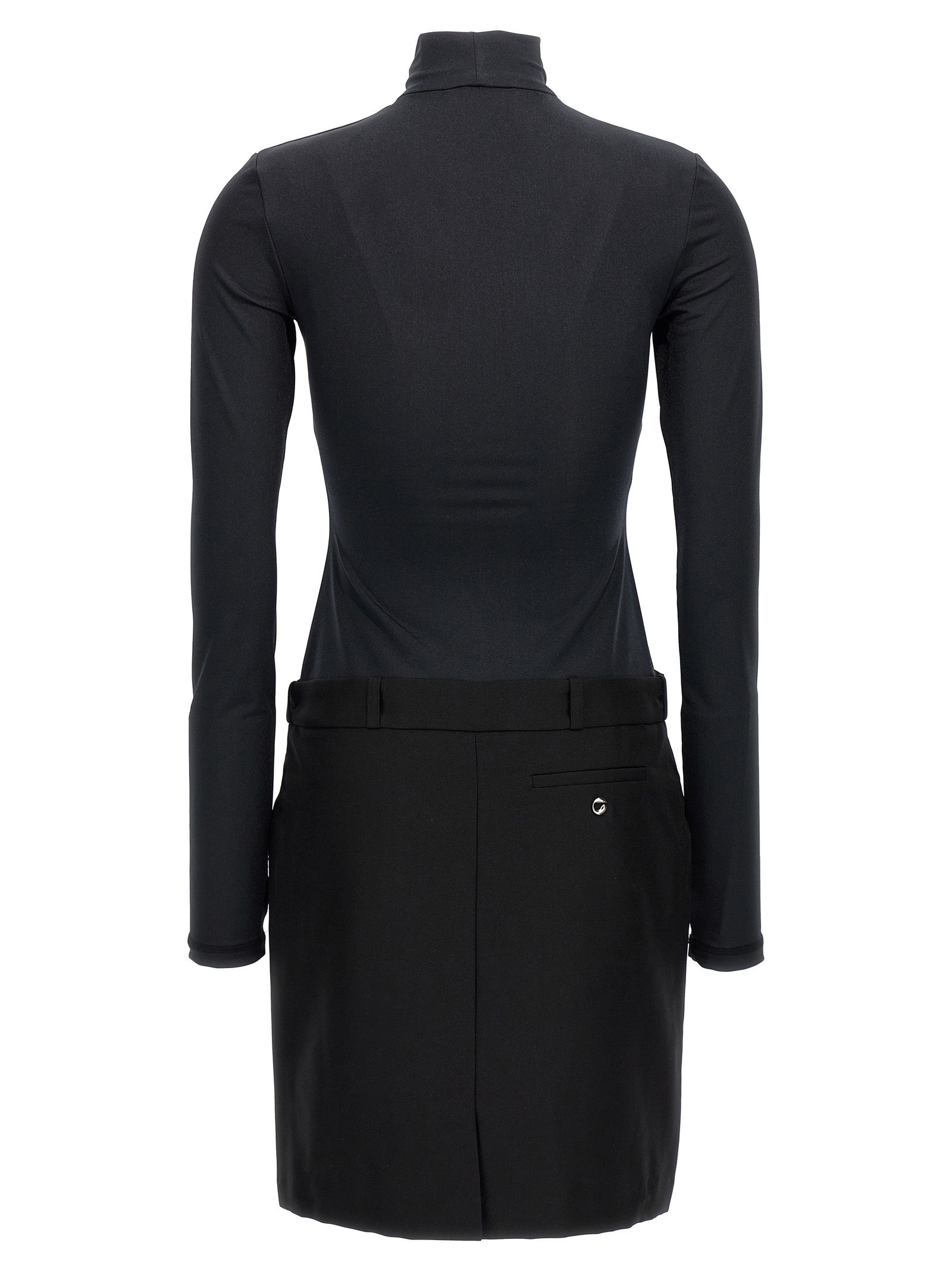 Hybrid’ dress with tech fabric sweater with high neck and long sleeves with thumb room and skirt with trompe l’oeil details.