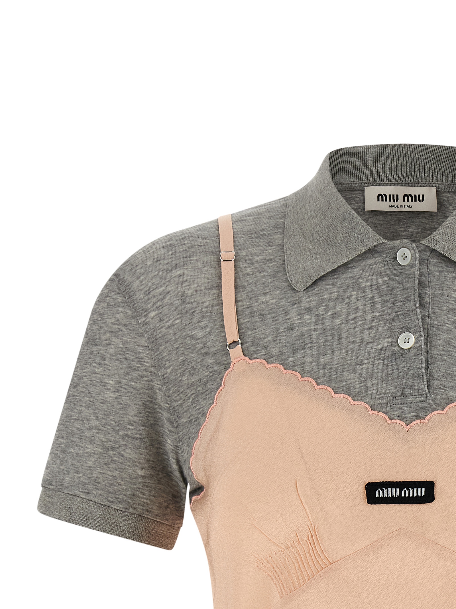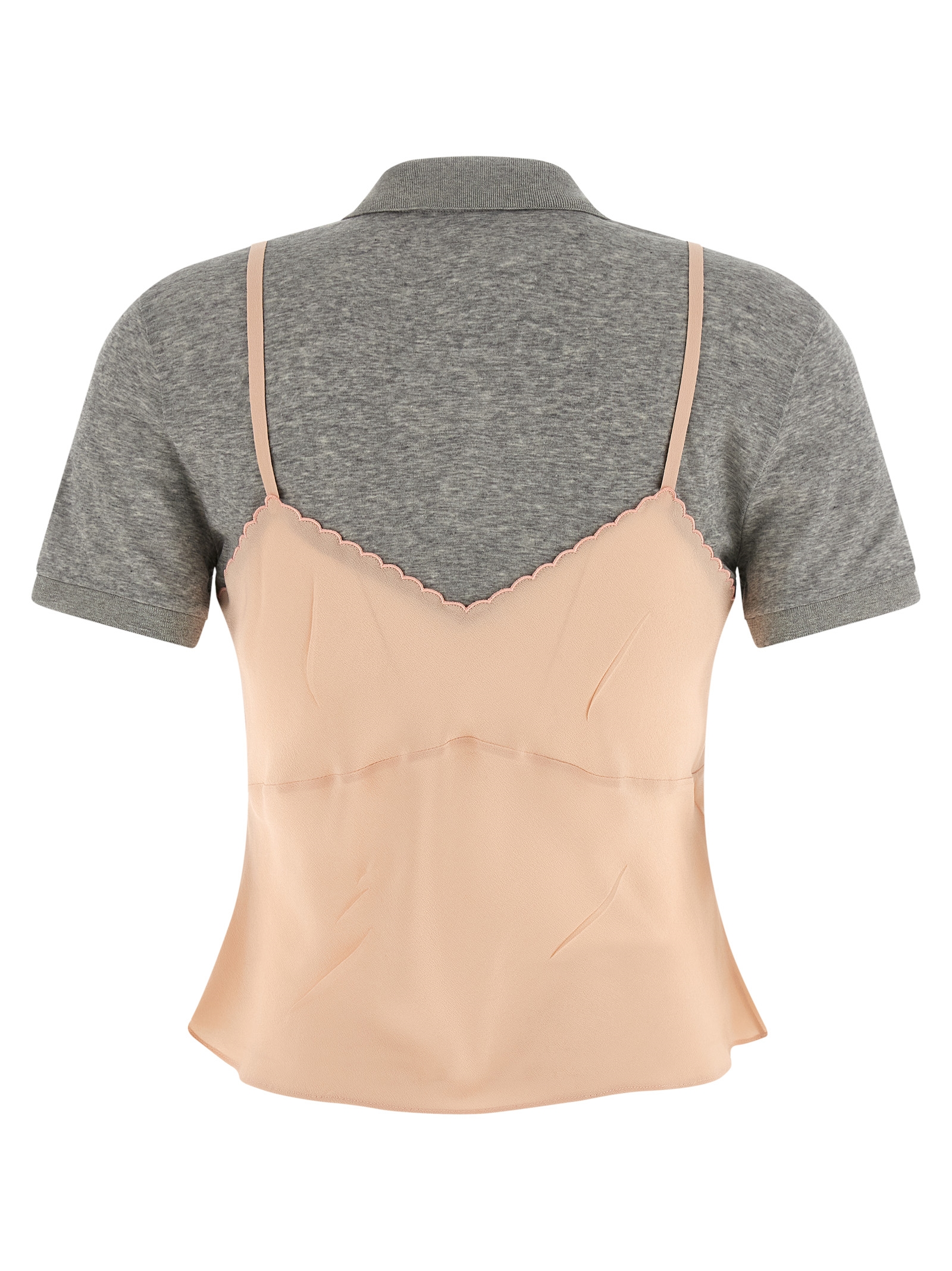 Hybrid garment consisting of marocain crêpe top, front logo patch, V-neck, thin adjustable straps, and non-divisible mélange jersey polo shirt with collar and buttons, short sleeves with cuffs.