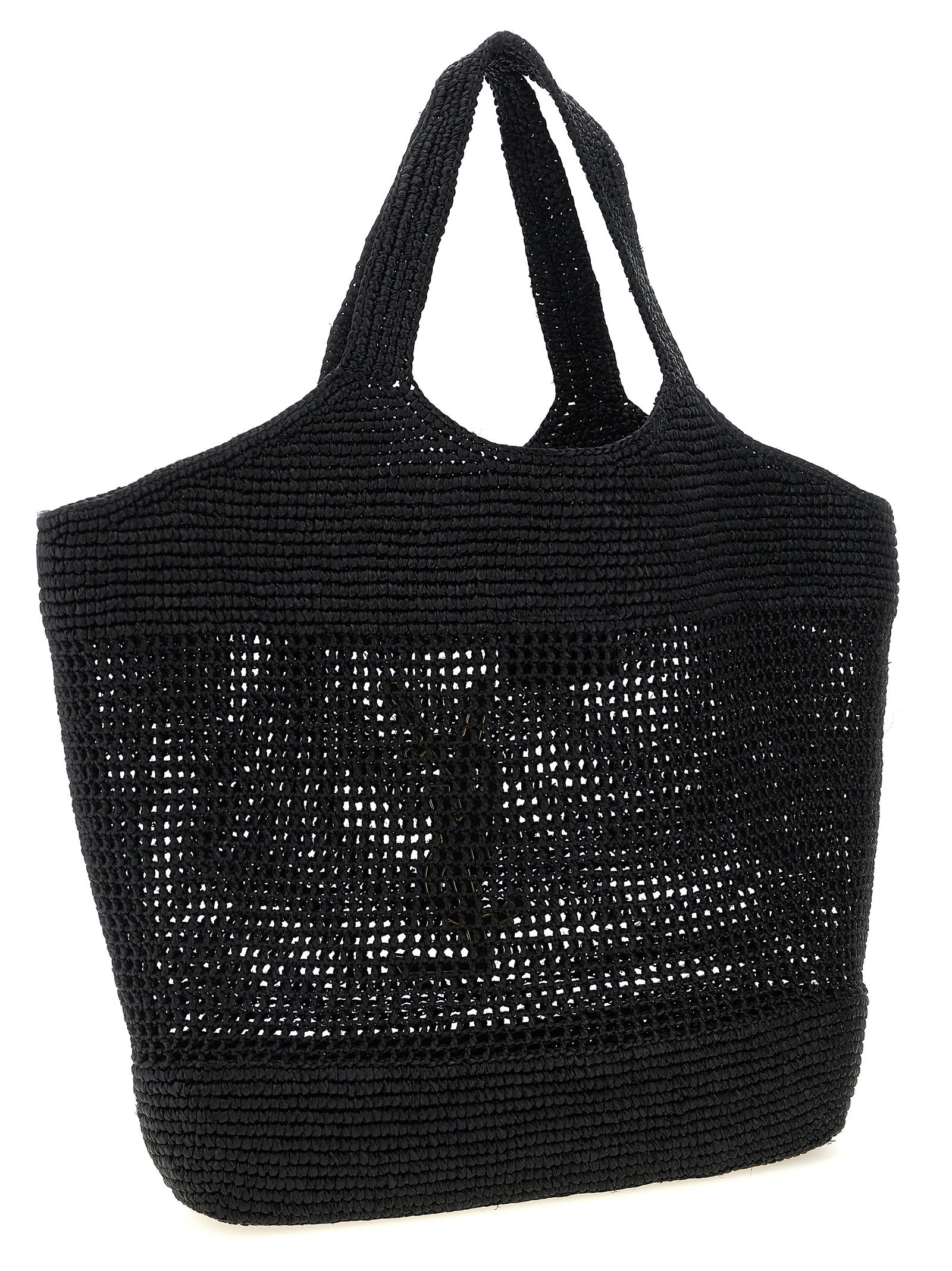 ‘Icare’ shopping bag in natural raffia and hand-crocheted vegetable tanned leather, oversized metallic Cassandre logo with antiqued effect on the front, double fixed handle, inner chain to fold or widen the sides as desired, removable matching glasses clutch bag.