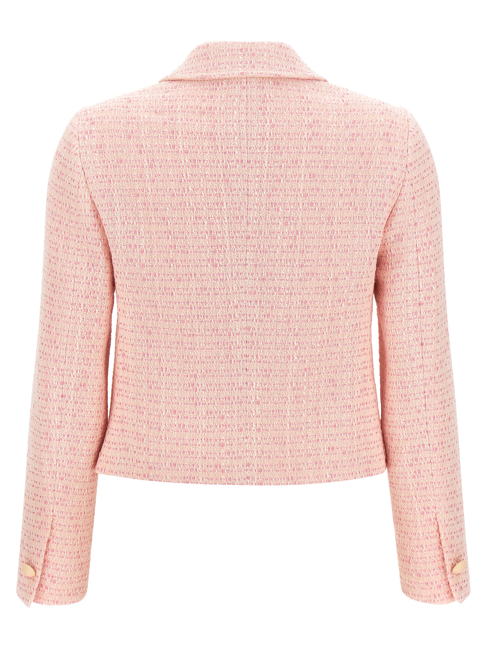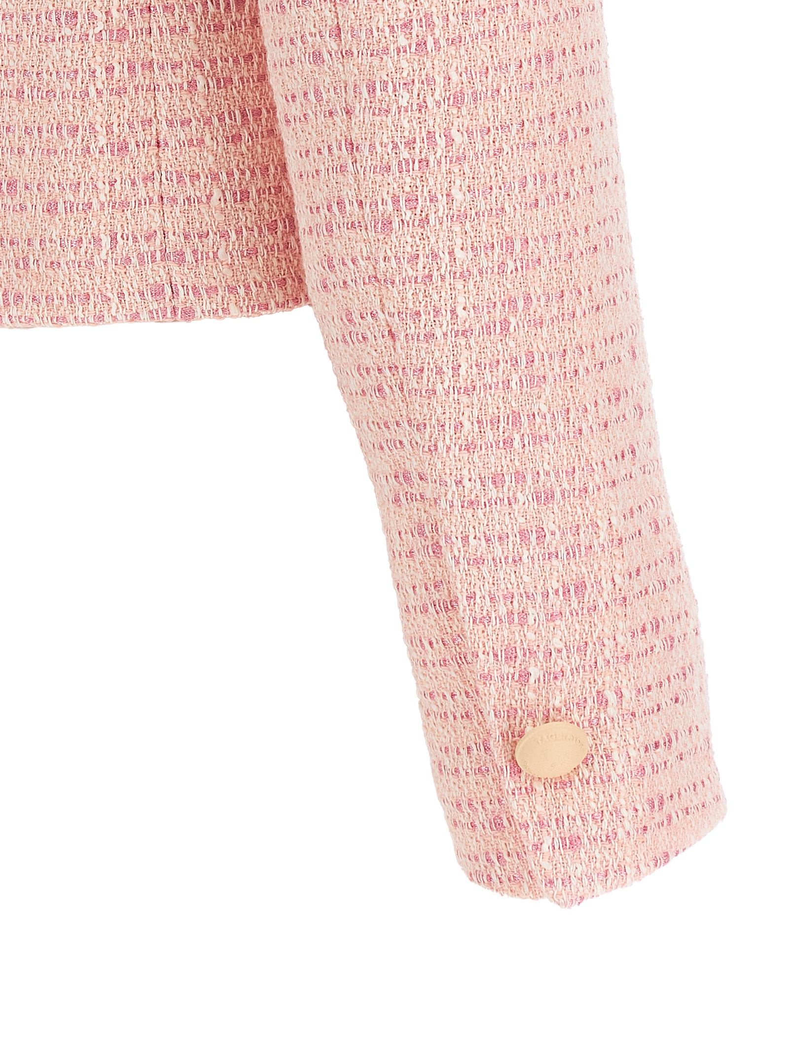 ‘Idelle’ cropped blazer in bouclé cotton blend with rounded shirt collar, front metal button closure, patch pockets, structured shoulder strap, long sleeves with slit and button on the cuffs, cupro lining.