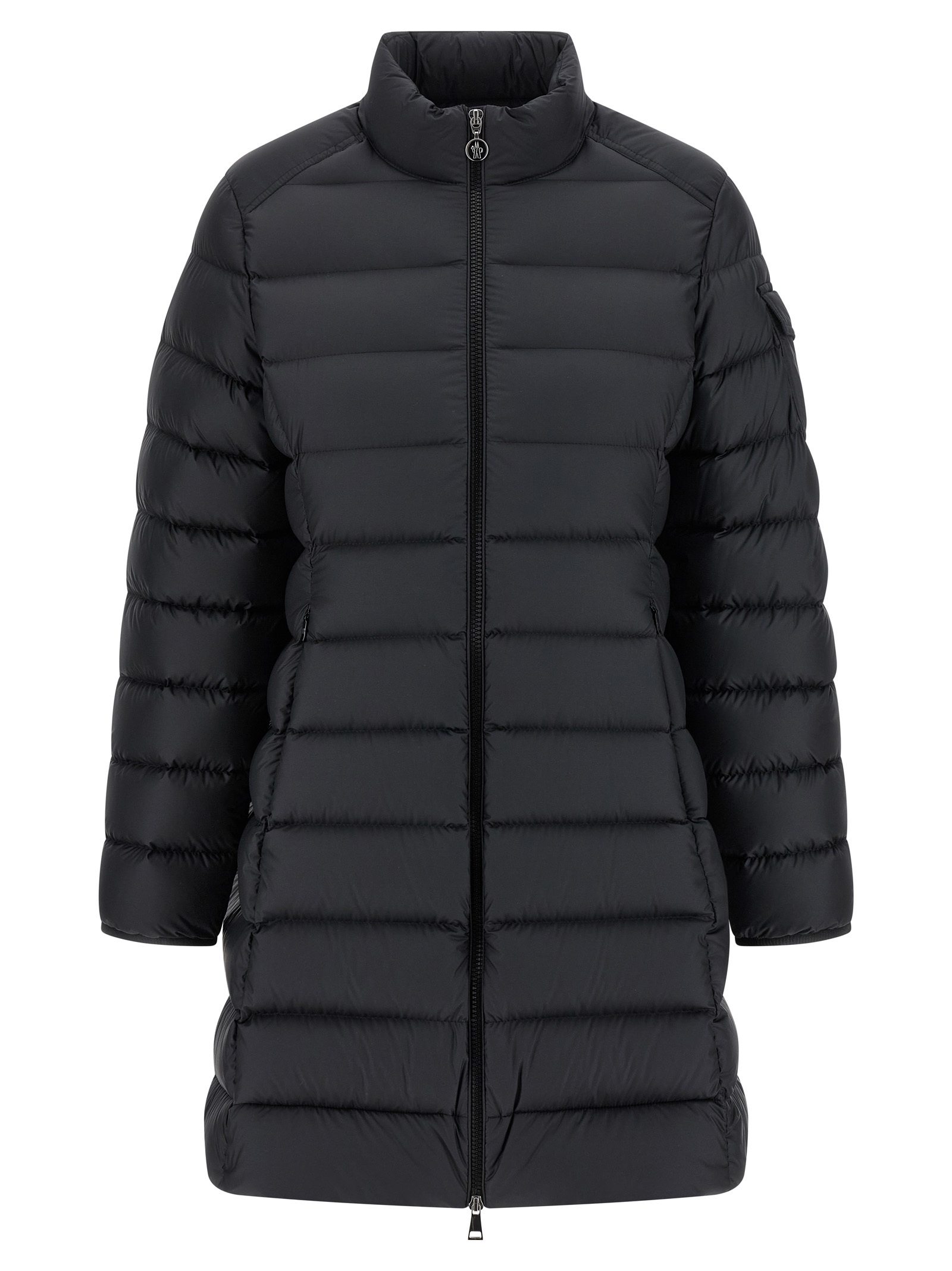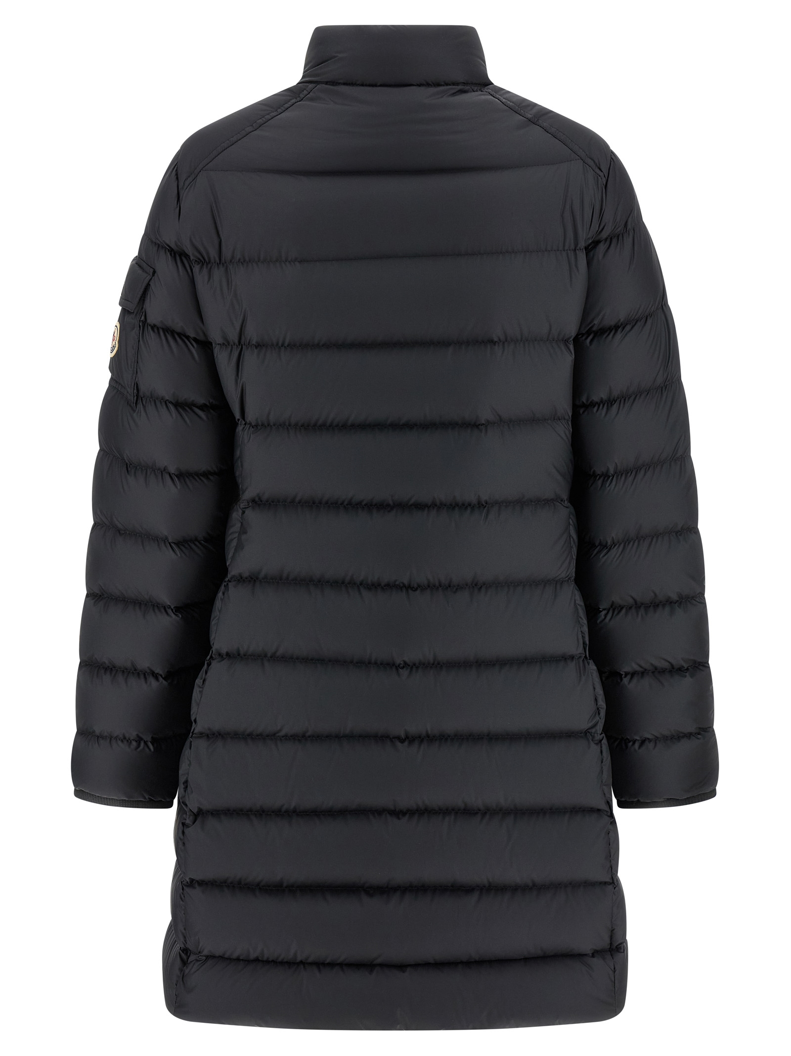 Microfiber ‘Igesse’ down jacket with boudin quilted matte finish and goose down padding, flared silhouette, standing collar, front zip closure, pockets, long cuffed sleeves and felt logo patch appliqué.