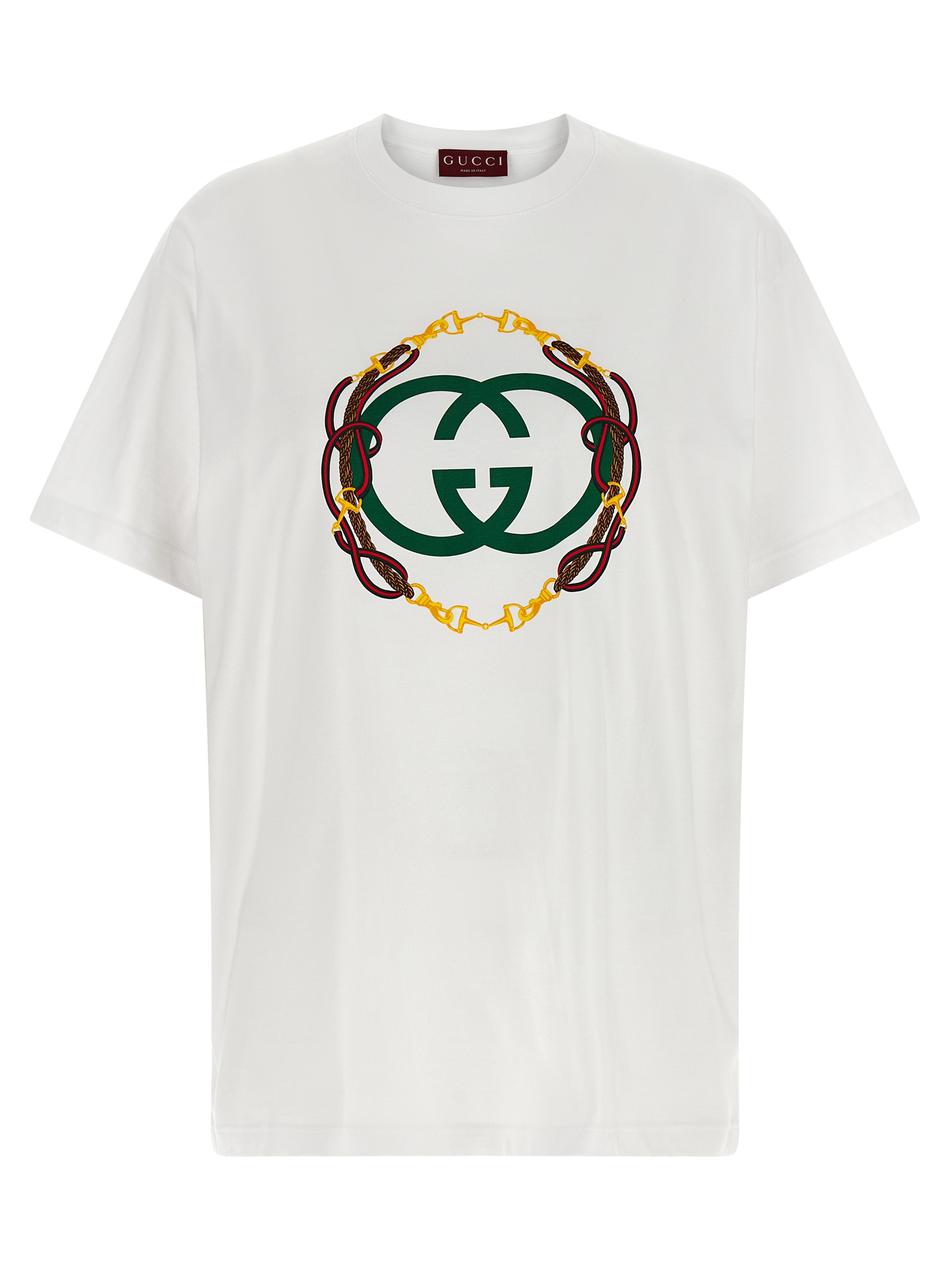 T-shirt in medium cotton jersey with ‘Incrocio GG’ print and front bridle embroidery, crew neck, short sleeves and dropped shoulders.