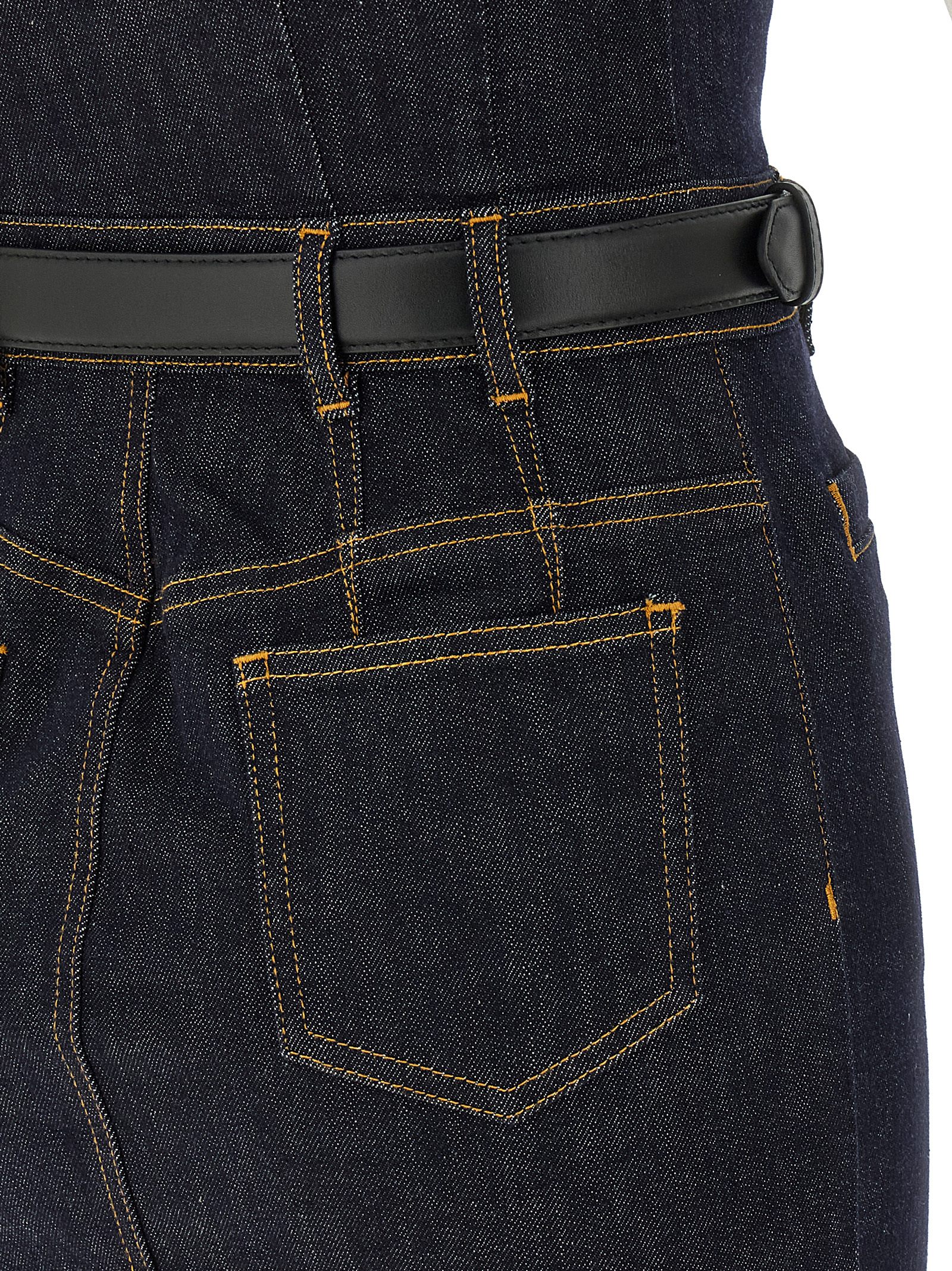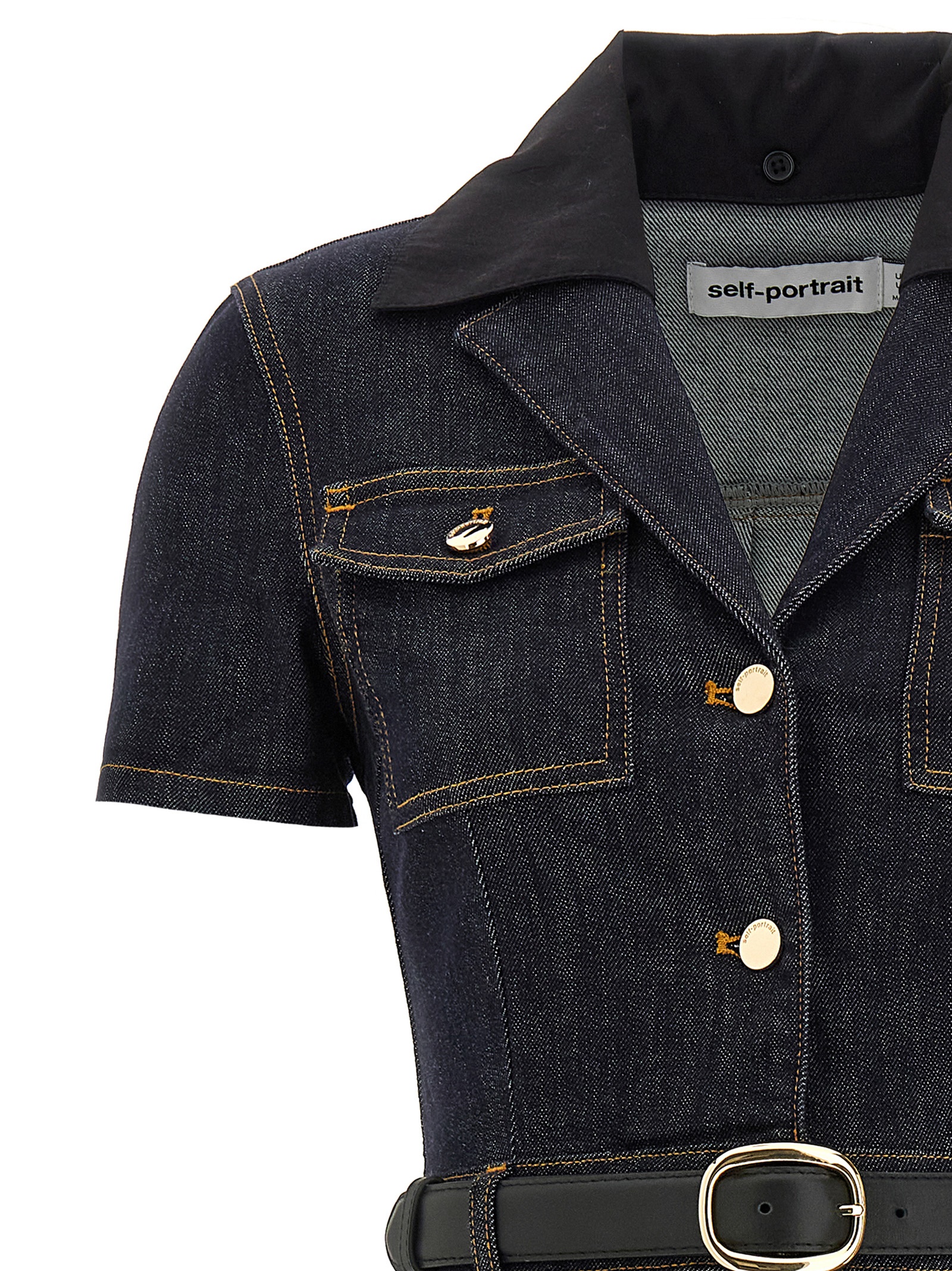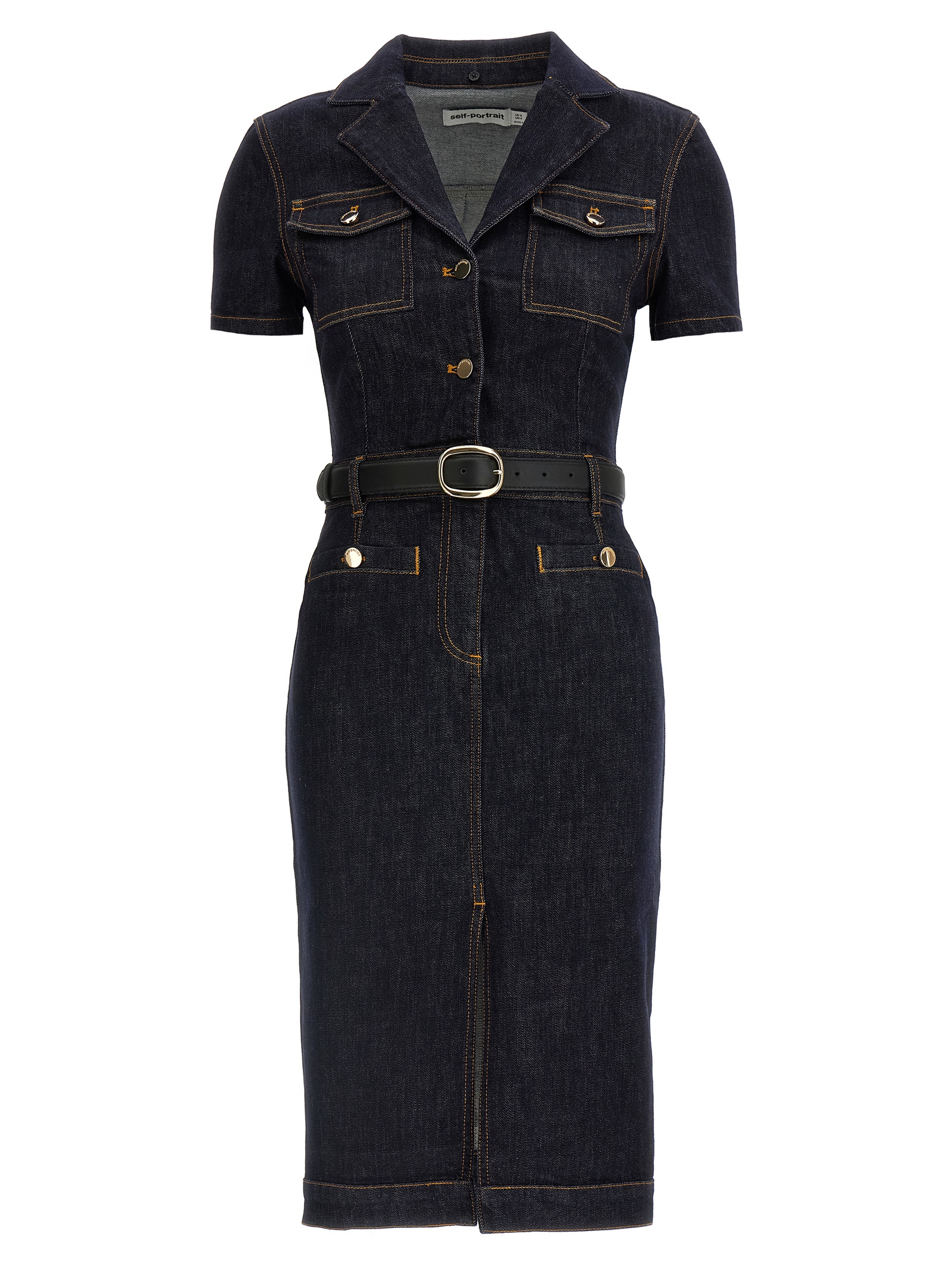 Streetwise ‘Indigo Denim Midi’ cotton denim dress with contrast stitching, shirier style, collar with removable contrast cotton insert, V-neck, front metal button closure, pockets, zip flap, short sleeves, front split, unlined, removable leather belt.