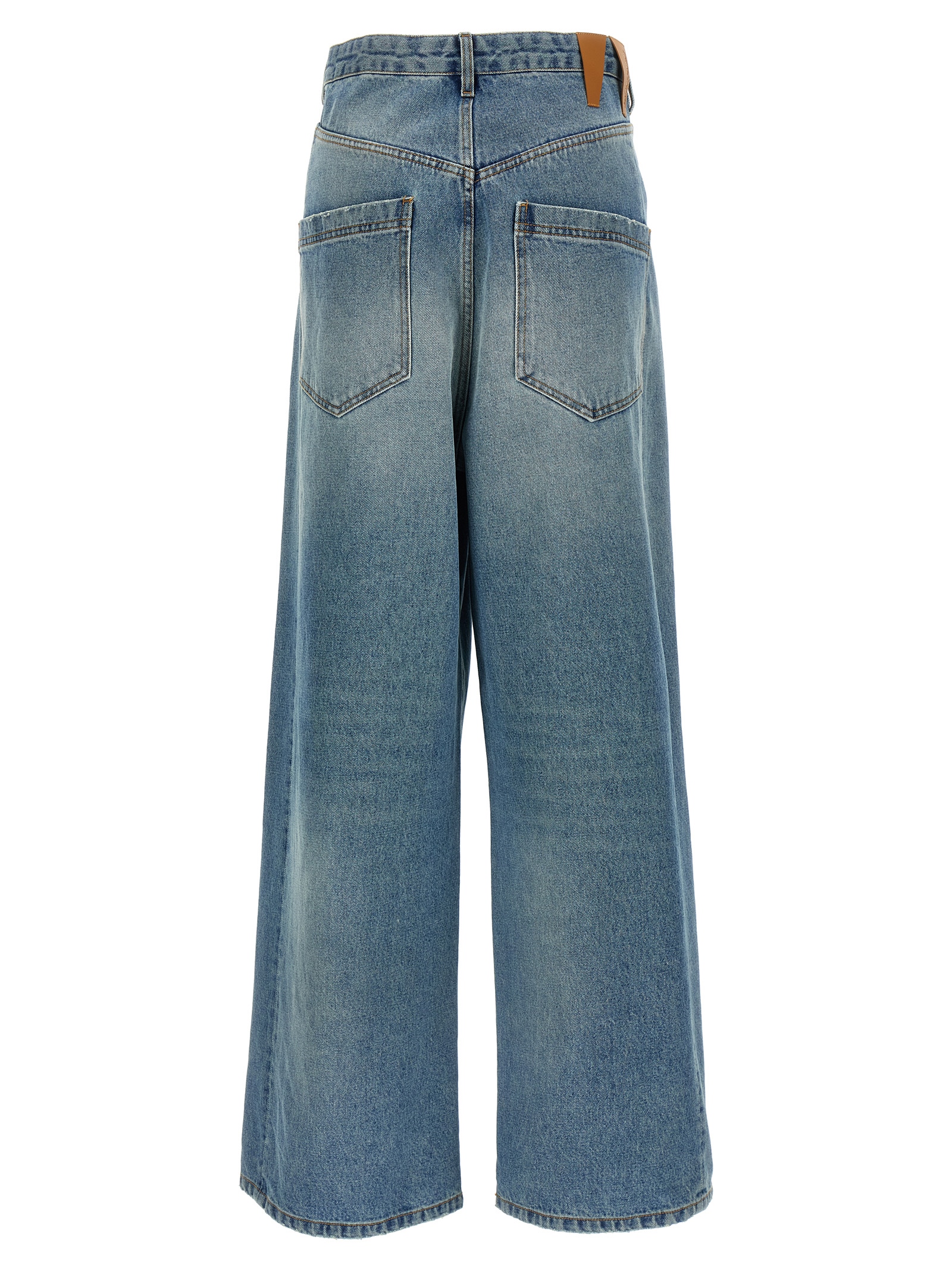 ‘Ines’ stonewashed cotton denim jeans, zip and button closure with front crossed flap, contrast stitching, low waist, low crotch, wide and long leg with curved stitching, five pockets, back logo tag.