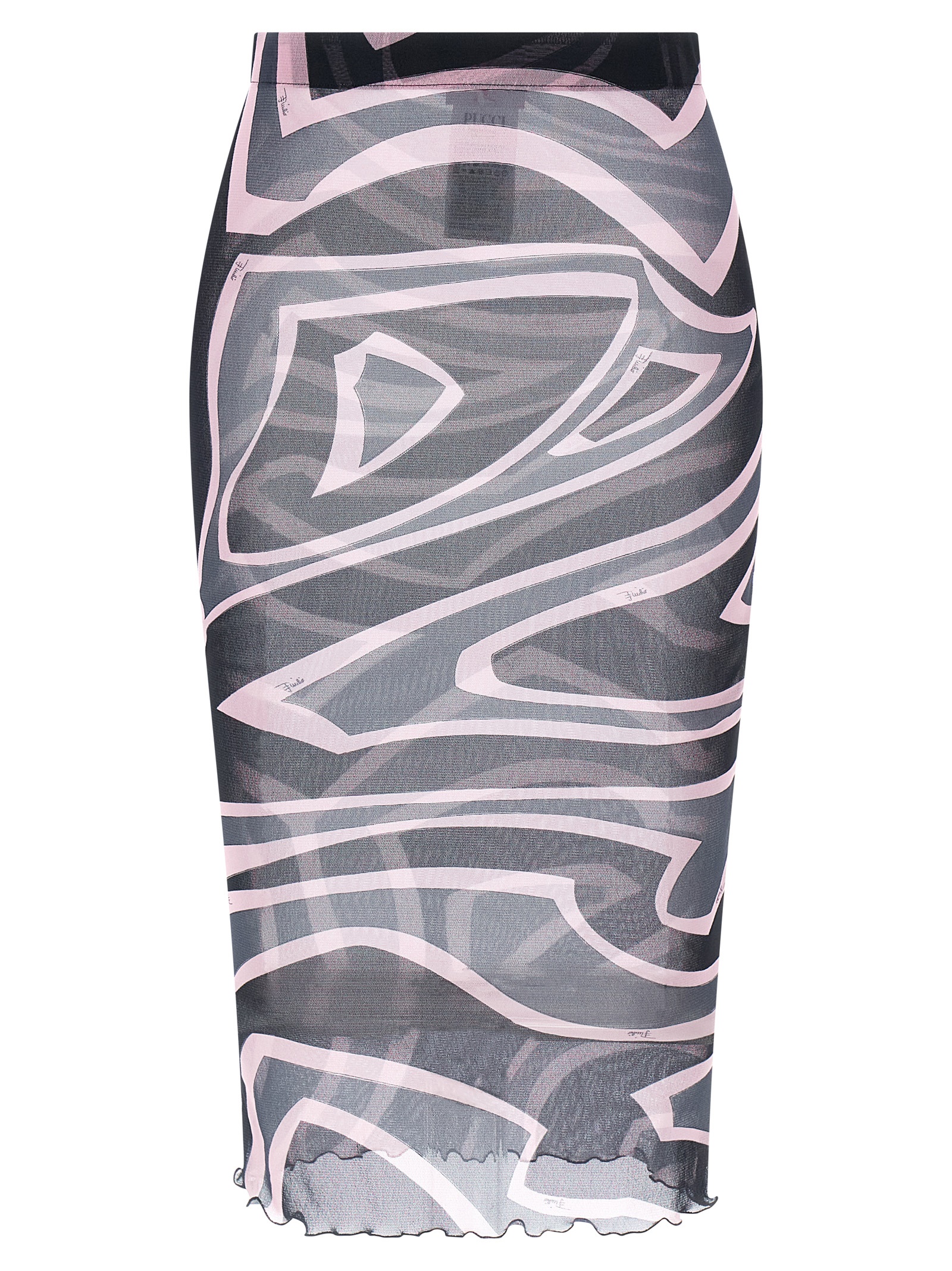 Midi skirt in light semi-transparent stretch tulle Iride pattern, elastic waistband, micro rousches on the hem.