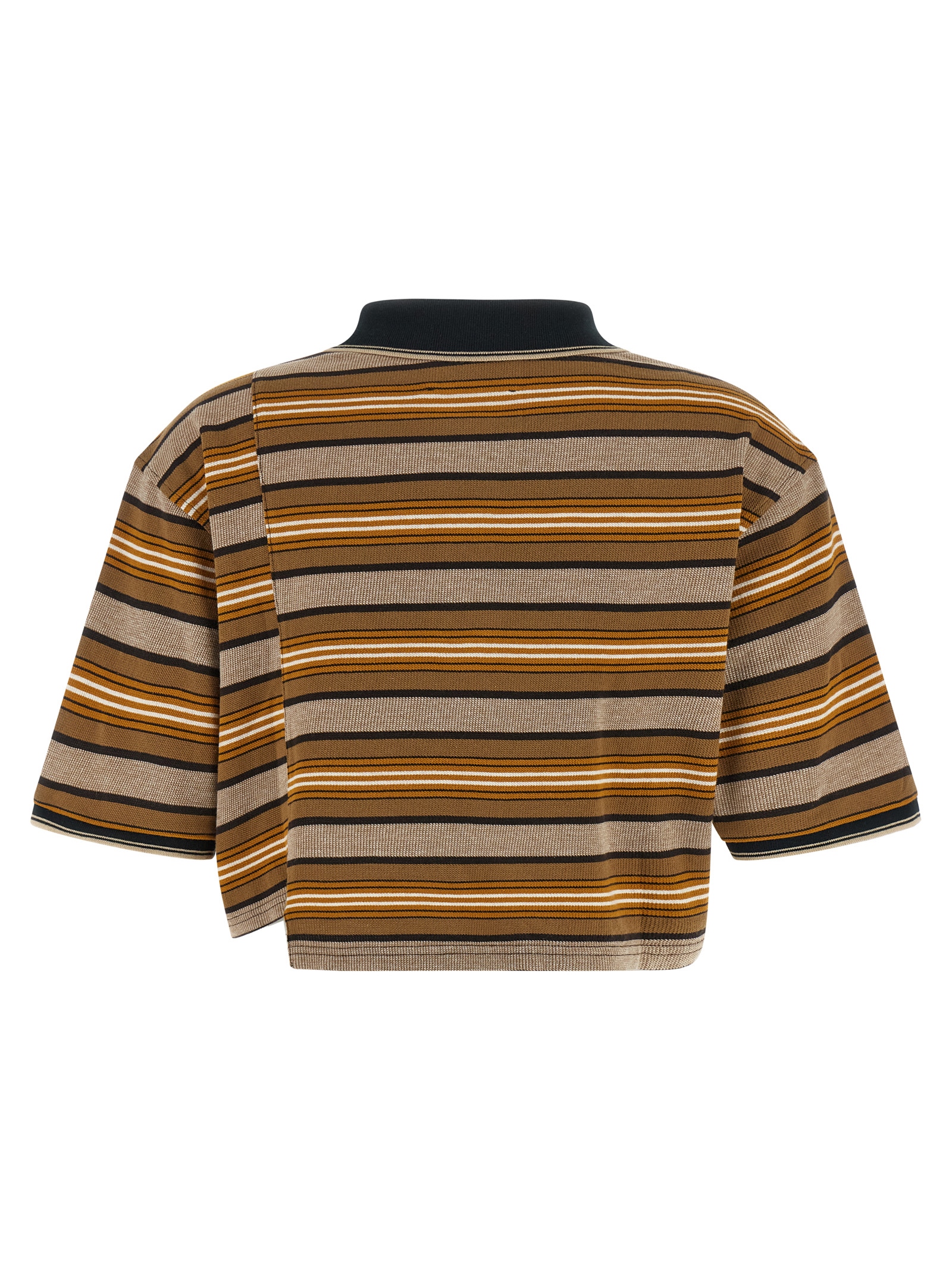 ‘Isalyne’ striped cotton piqué polo shirt with crop style, asymmetric two-panel construction, front logo embroidery, hidden collar and buttons, breast pocket, short sleeves with dropped shoulders, asymmetrical hem.