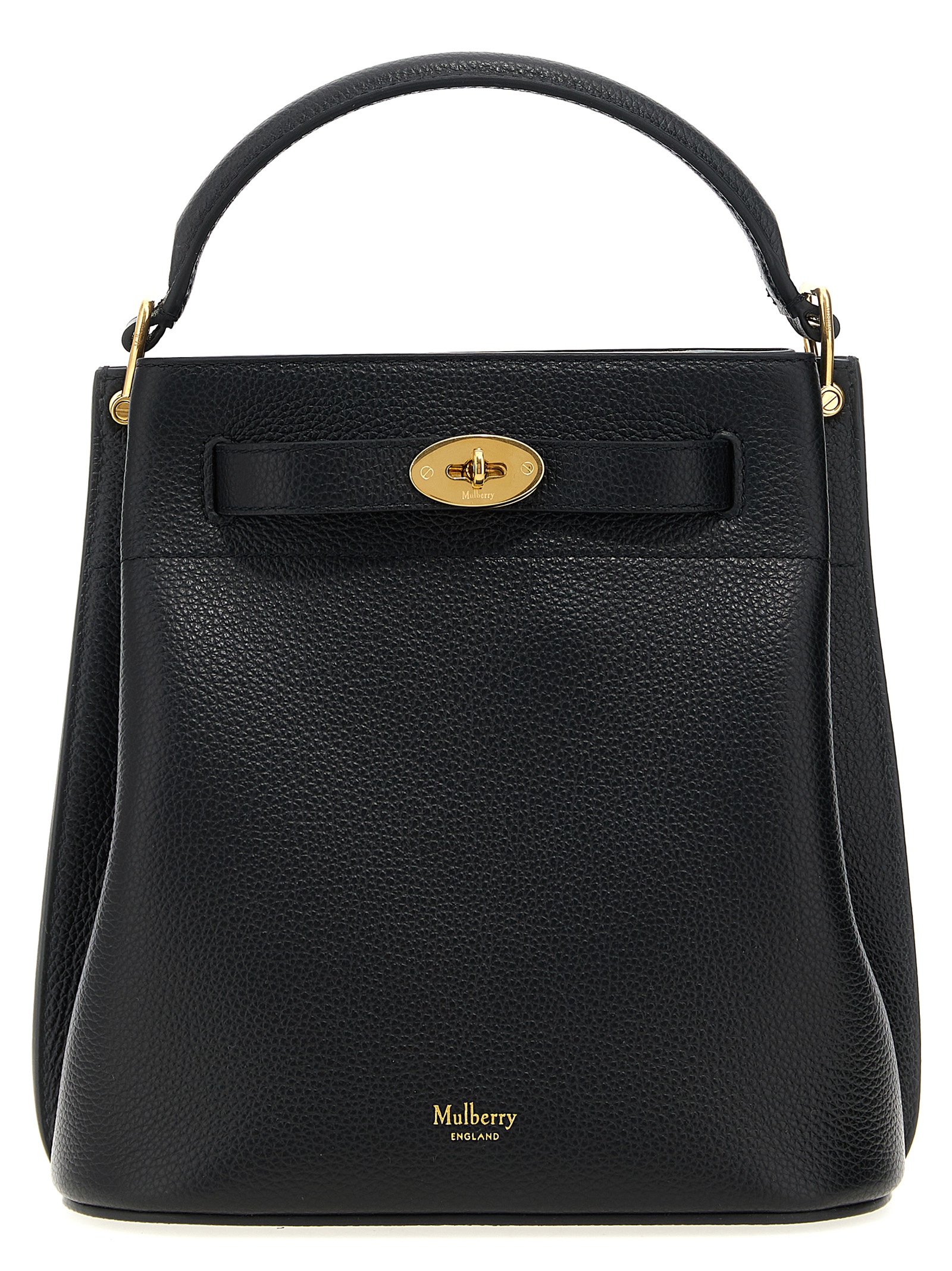 Small Islington bucket bag in hammered leather with front embossed logo, belt closure with metal Postman’s Lock, fixed handle, adjustable shoulder strap, and metal details.