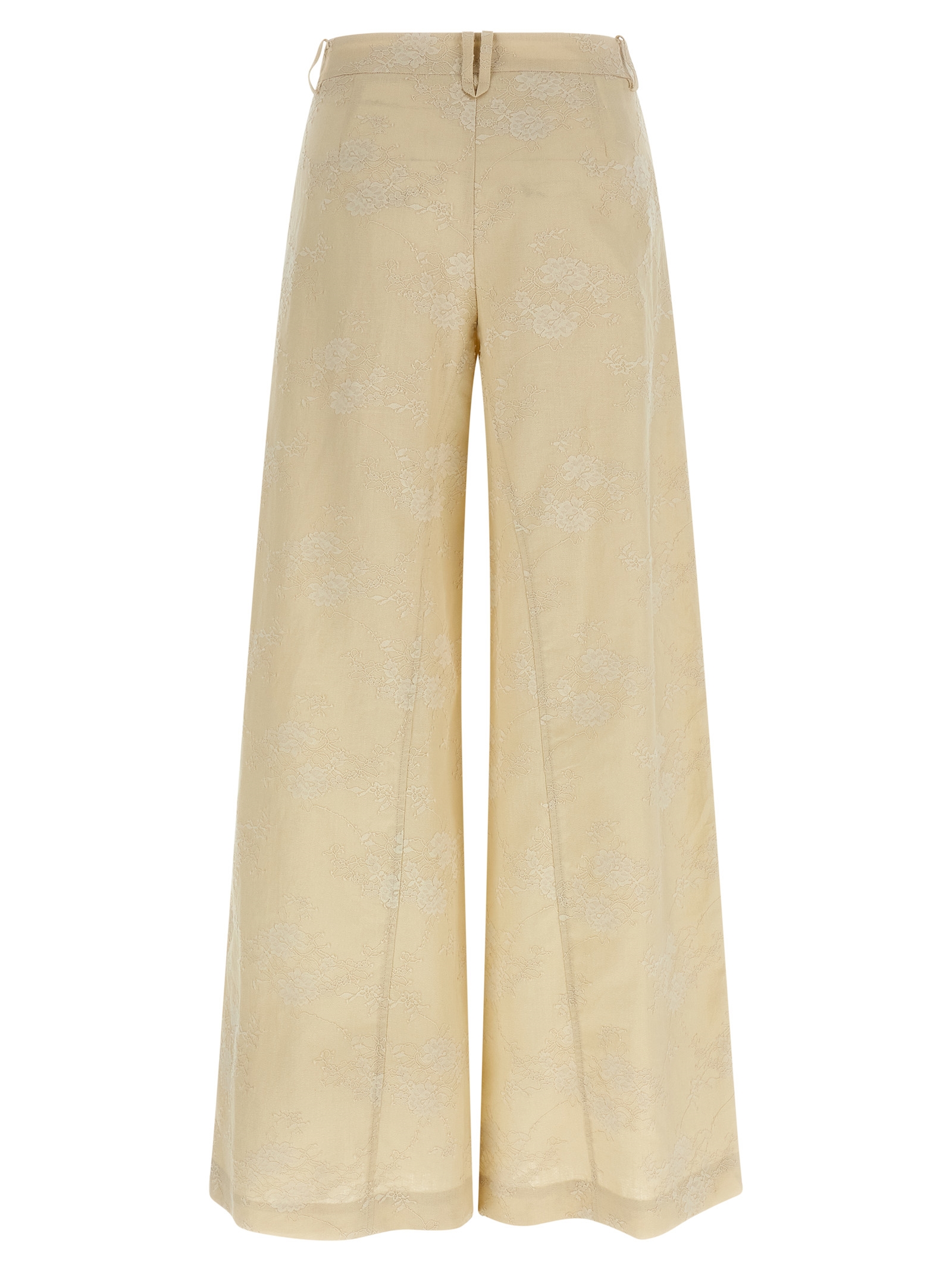 ‘Ivy’ linen pants coupled with overlapping tone-on-tone lace, panel construction, wide flared leg, mid waist, front zip and button closure, front French pockets.