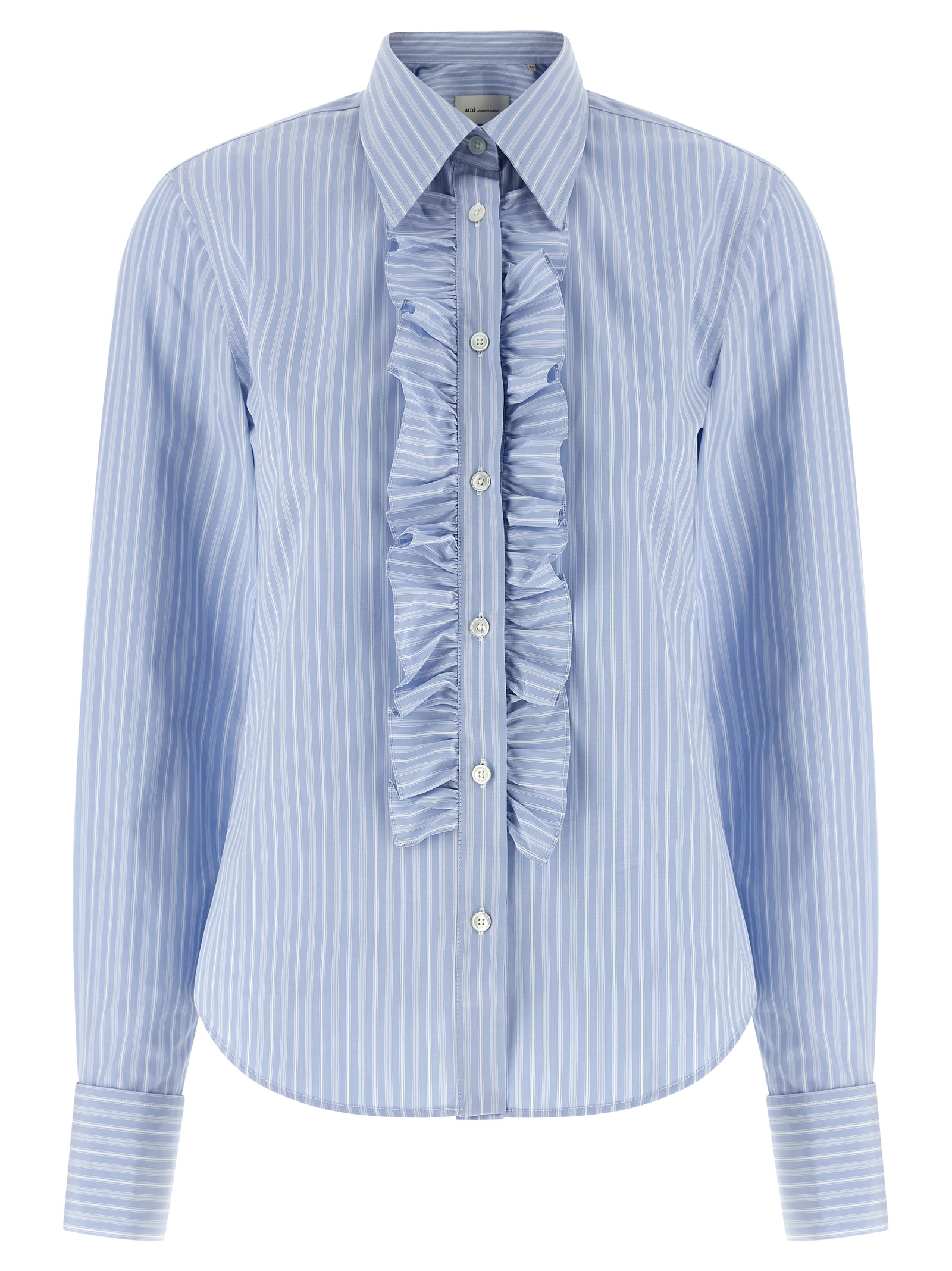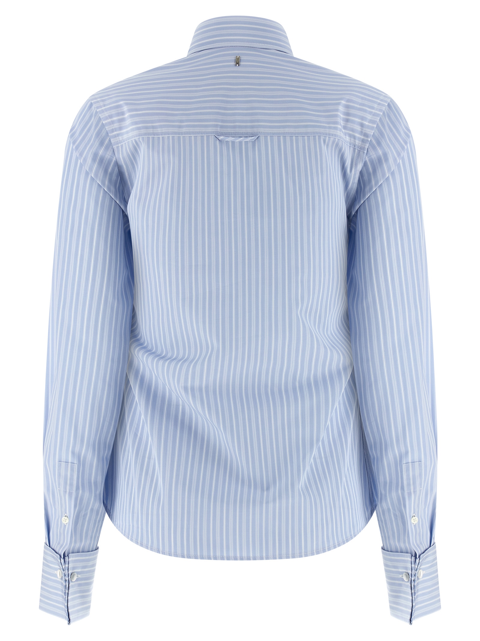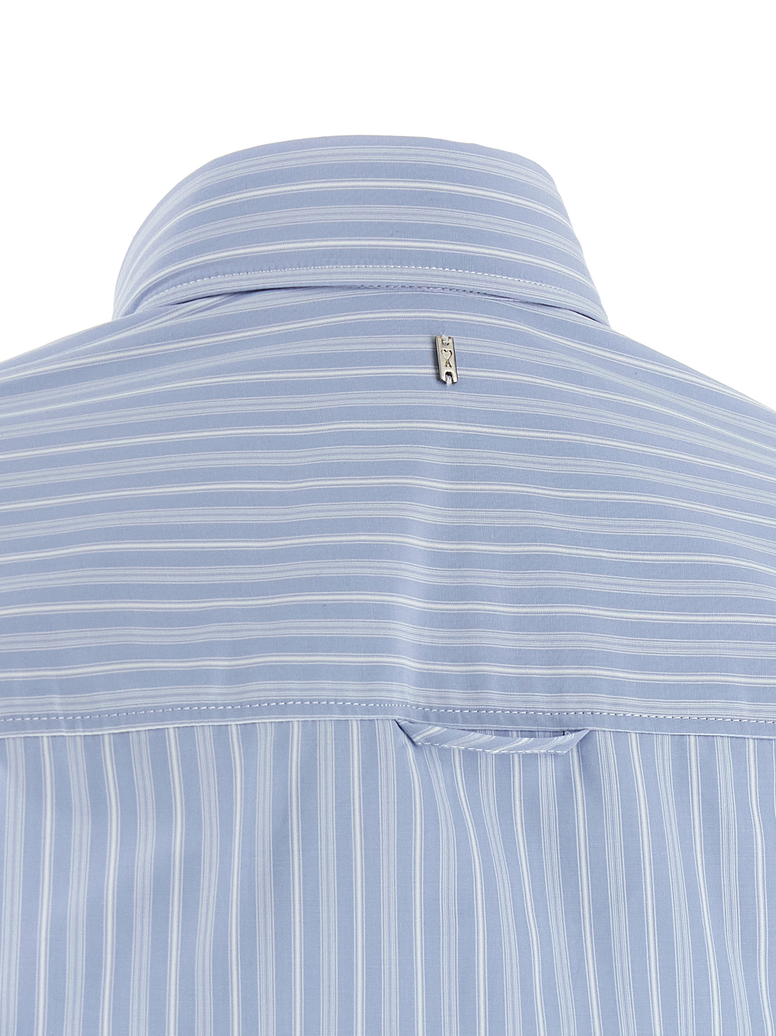 Striped cotton poplin shirt, button closure with front jabot, micro metal logo on the back, long sleeves with cufflinks.