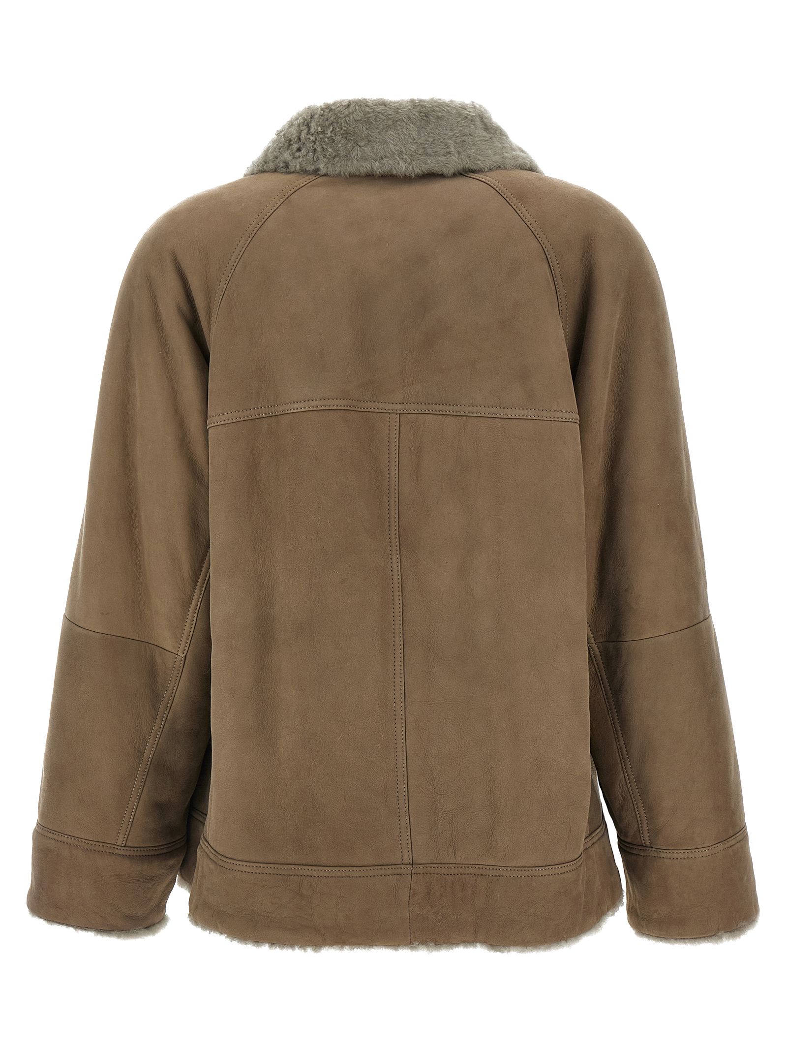 ‘Fuzzy’ nappa jacket with sherling lining, shirt collar, zip closure and front snap buttons with Monile ‘Shiny Trim’ detail, pockets and long cuffed sleeves.