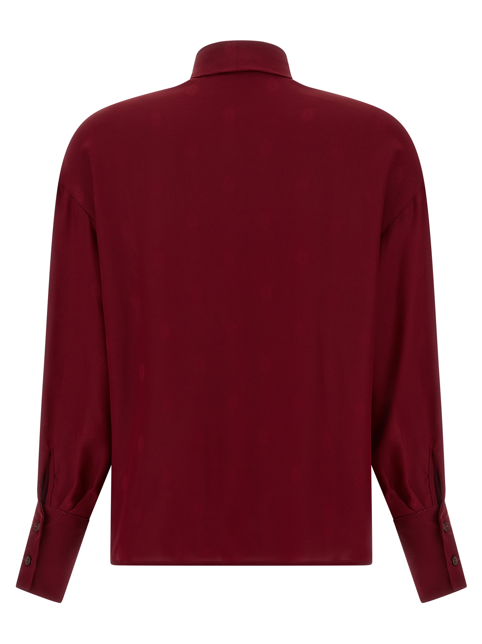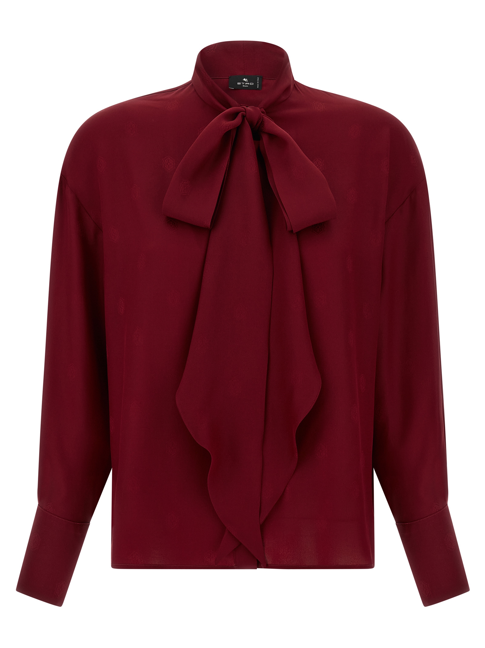 Pure crepe de Chine silk blouse with tone-on-tone jacquard patterns, lavallière collar with front scarf, concealed button closure, long cuffed sleeves and dropped shoulders.