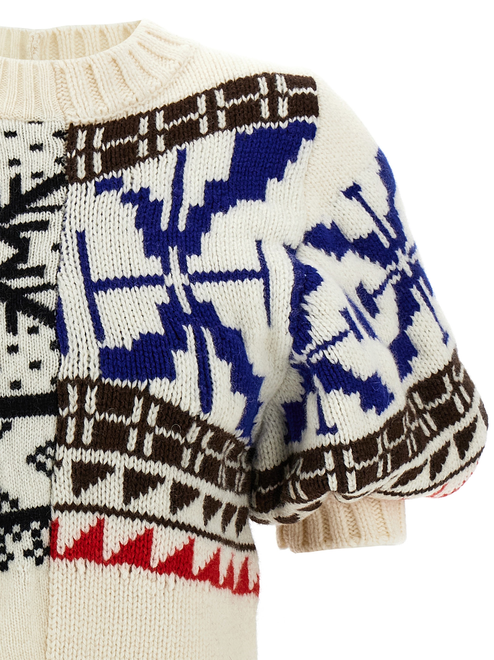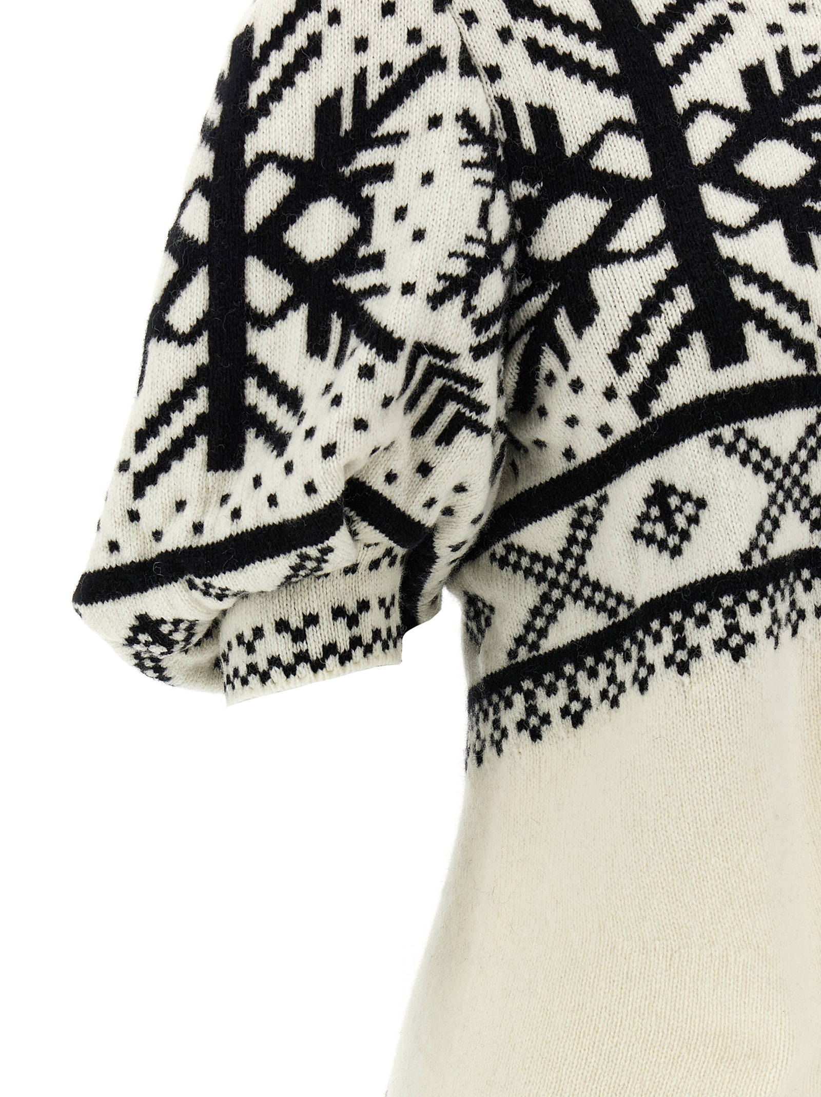 Jacquard sweater in wool blend, crew neck, short puff sleeves with cuffs, asymmetrical hem.
