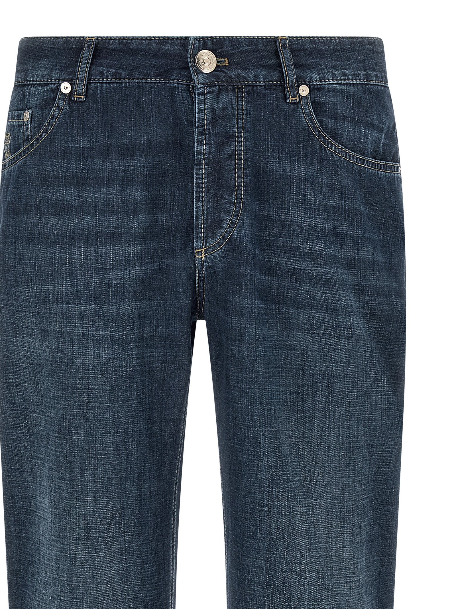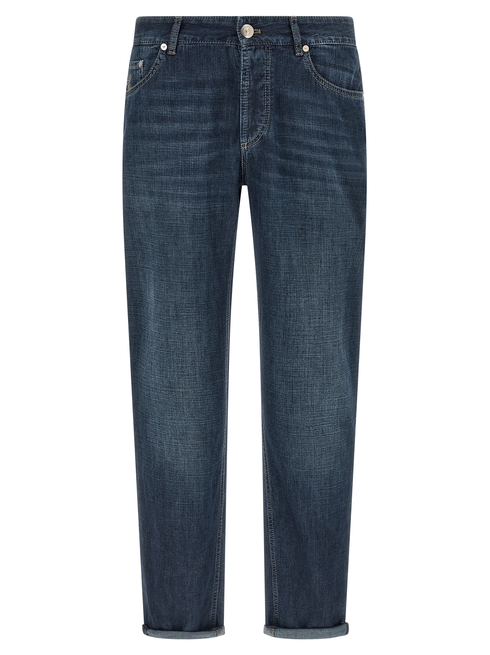 Jeans in fine 9.5 OZ Japanese denim with contrast stitching, logo embroidery and front button closure, five pockets, back leather logo tag, turn-up on the leg bottom.
