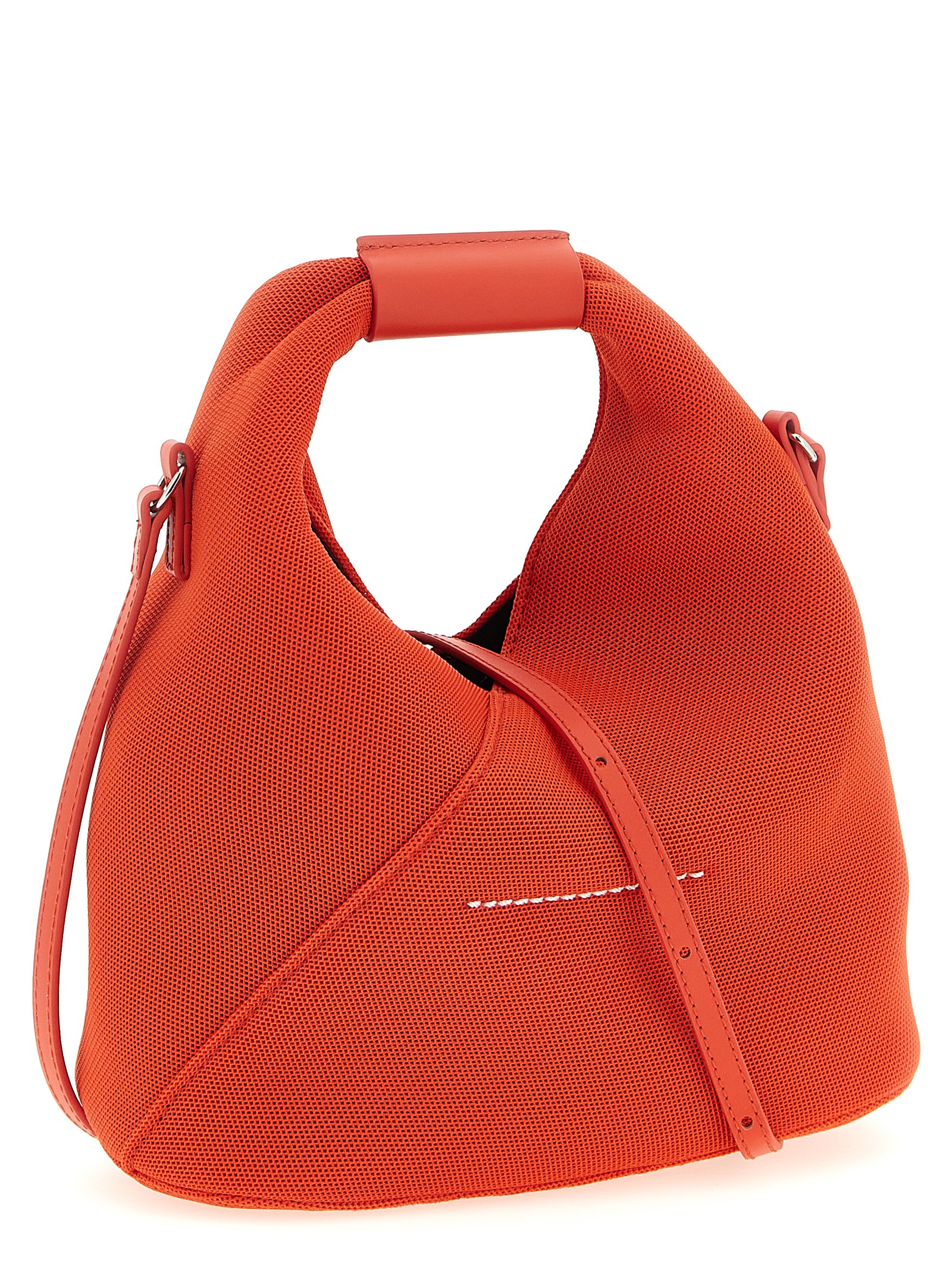 ‘Japanese Mesh’ mesh crossbody bag, fixed leather handle with embossed ‘Numeric signature MM6’, internal snap button closure, back ‘White stitch line’, adjustable and removable leather shoulder strap.