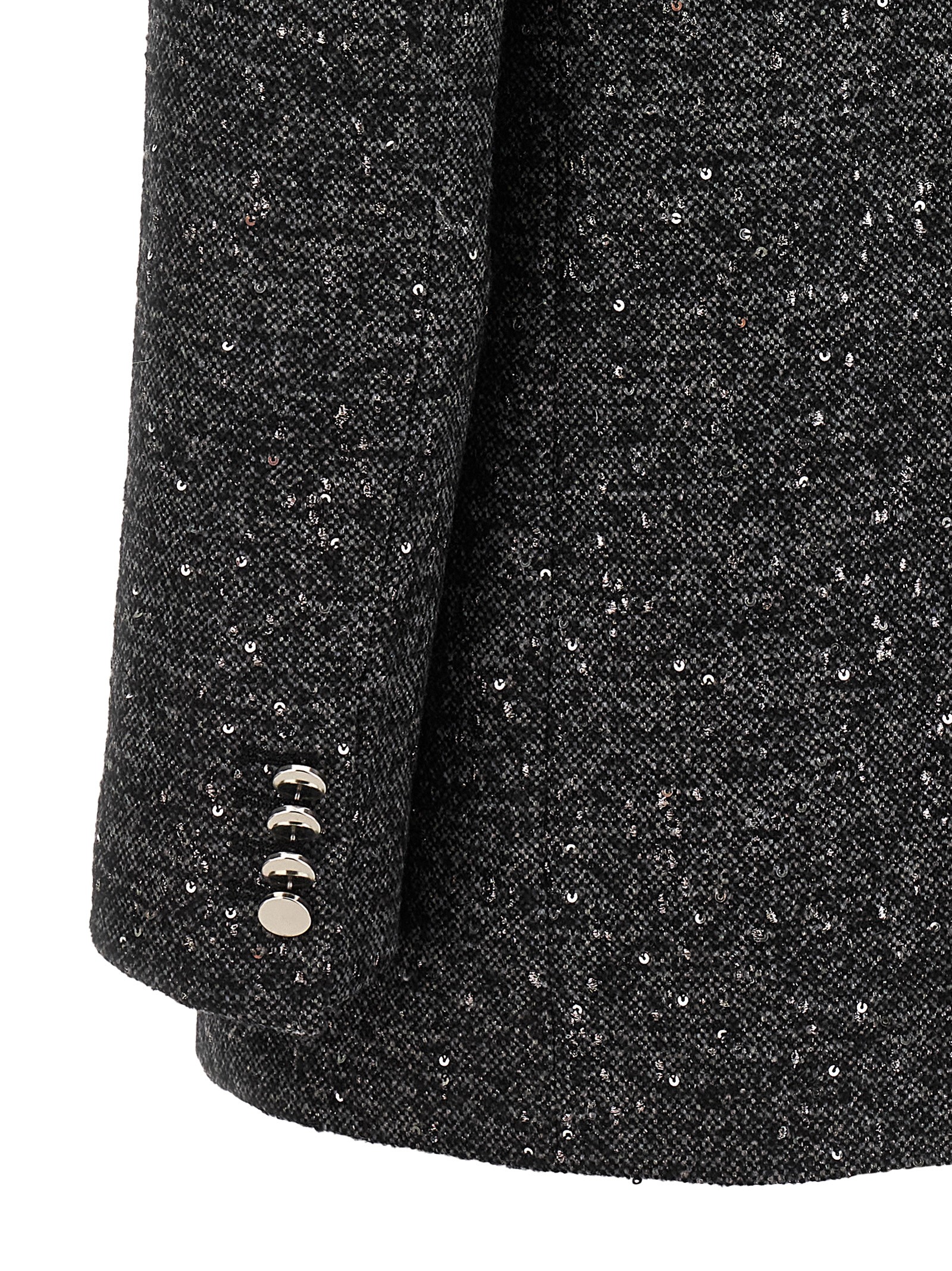 ‘Jasmine’ double-breasted blazer in wool and viscose blend with lamé thread and micro sequin inserts, front metal button closure, peak lapels, breast pocket, flap pockets, structured shoulder strap, long sleeves, back split, monogram cupro lining.