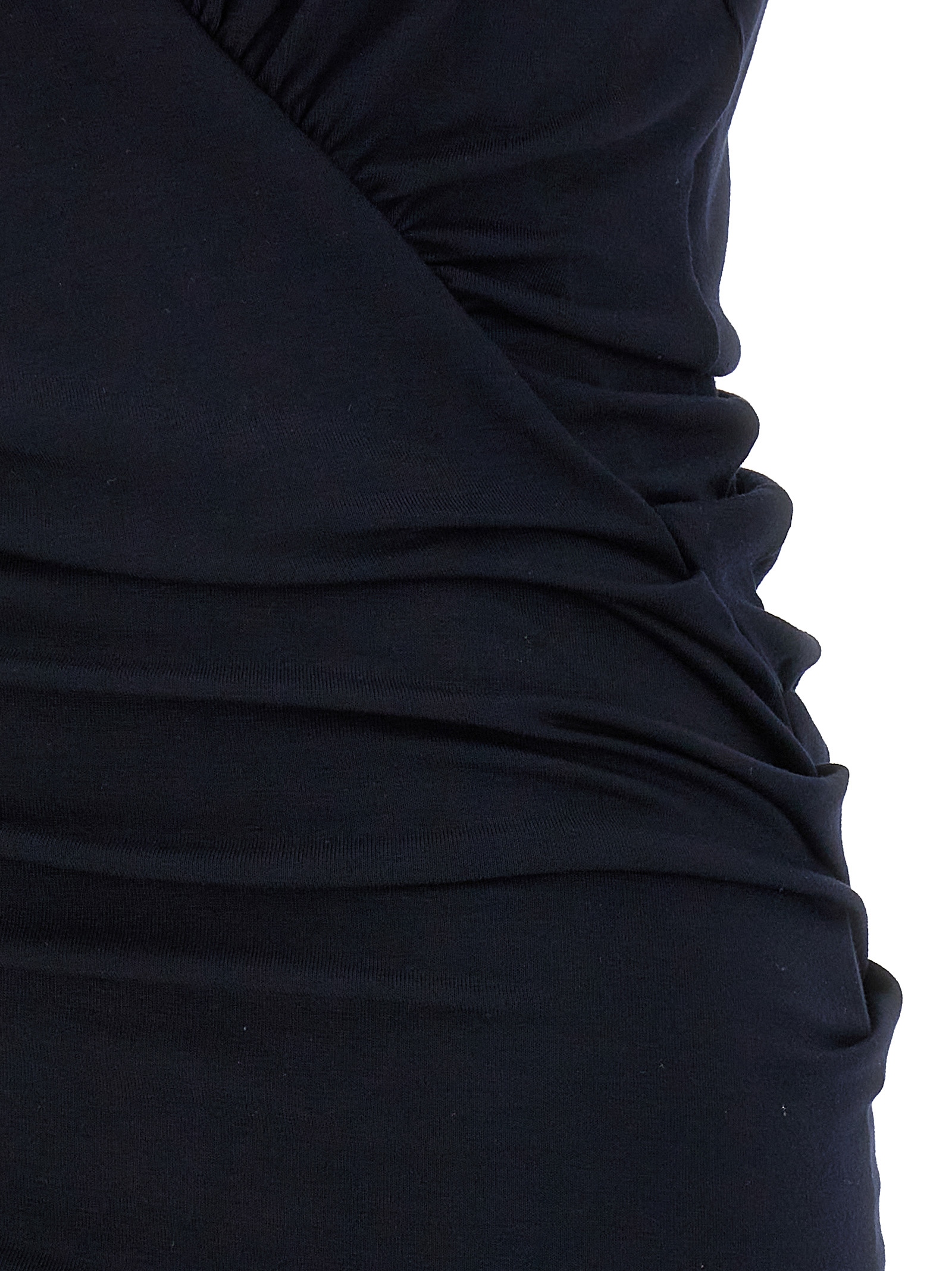 Sleeveless jersey midi dress with wide neck and ruched details.