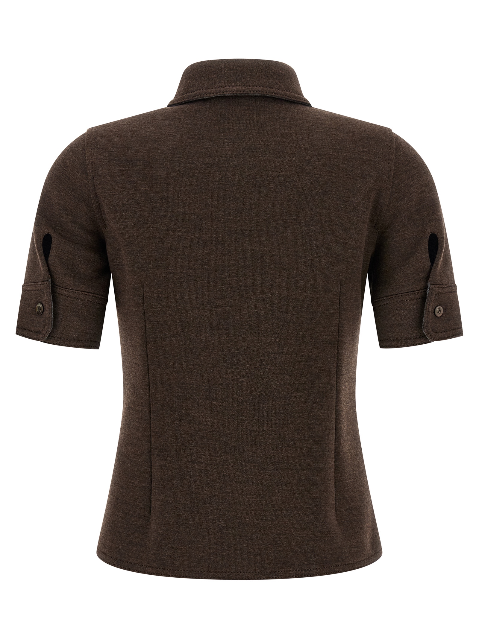 Double layer cotton blend wool jersey shirt, collar, front button closure, front logo embroidery, short sleeves with cuffs and buttons.