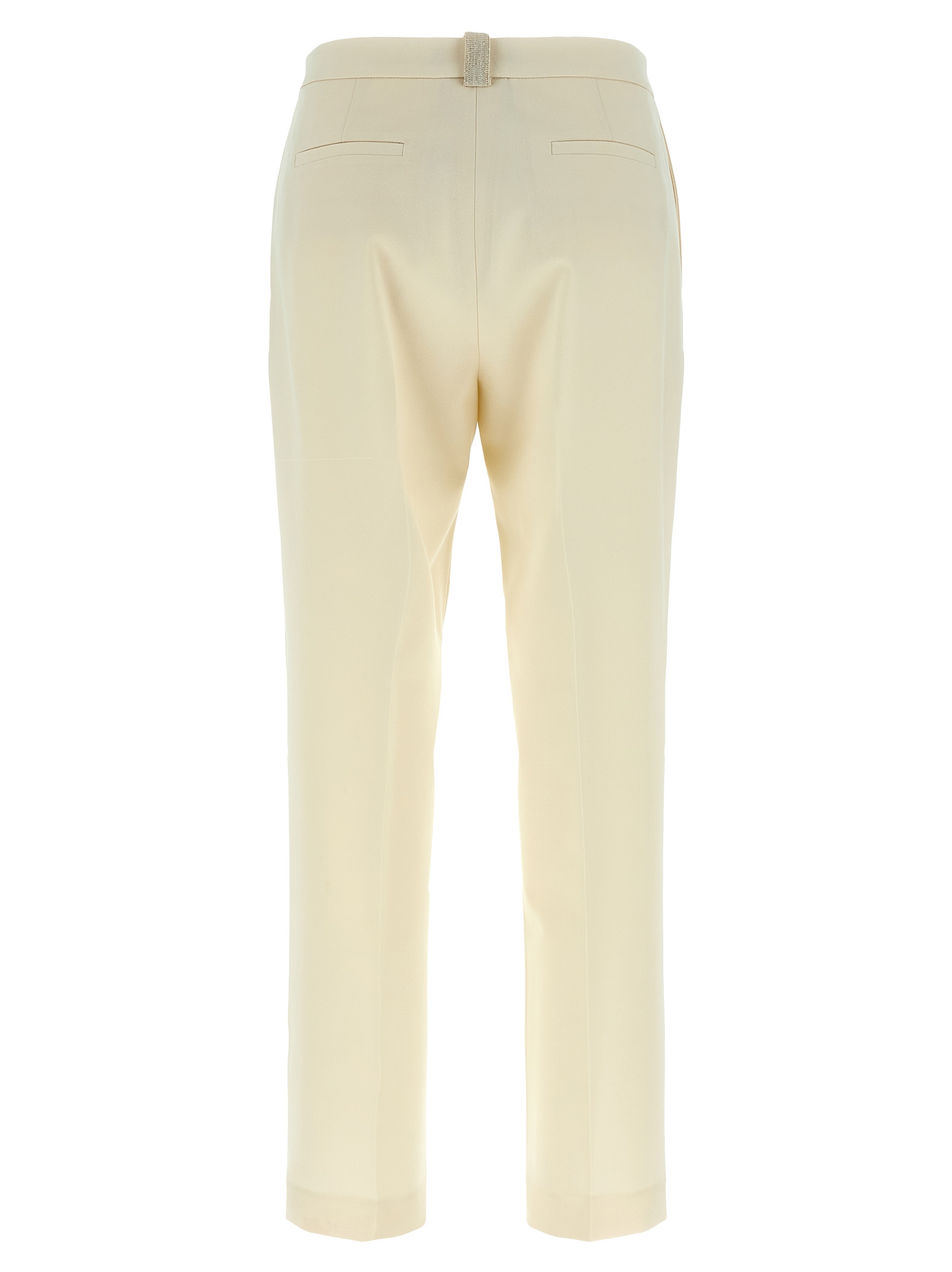 Viscose blend trousers, back jewel detail, straight leg, stretched pleat, zip and front hook closure, pockets.