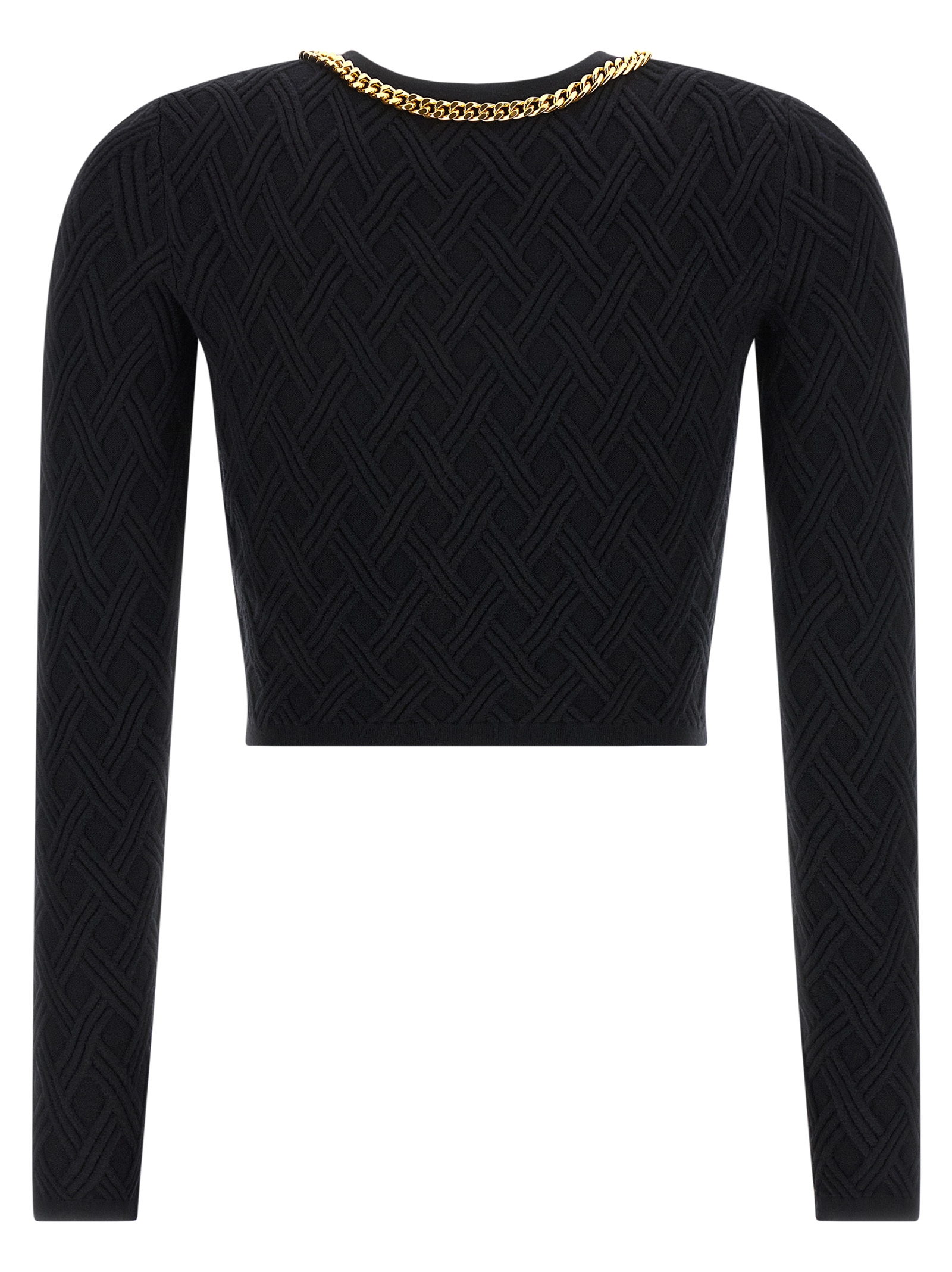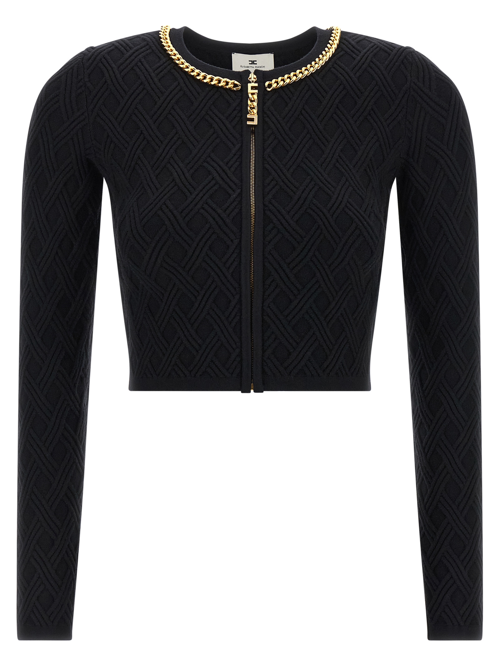 Knit cardigan with 3D diamond processing, crop model, front zip closure with jewel zip puller, crew neck with metal chain detail, long sleeves.