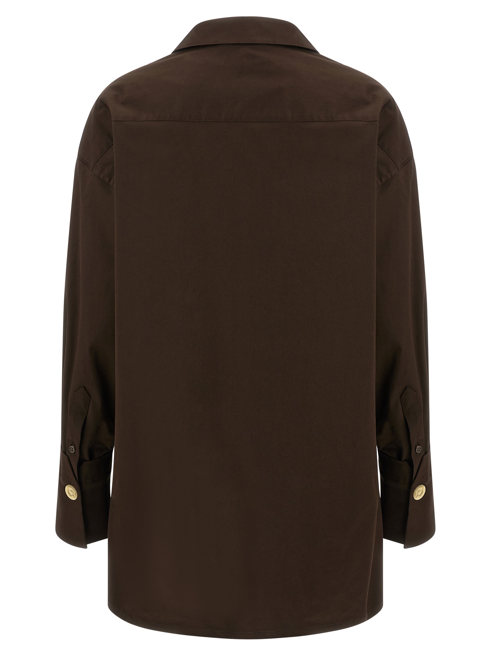 ‘Jodie’ cotton poplin shirt with flared tunic, front metal snap button closure, long sleeves with cuffs and dropped shoulder, side slits.