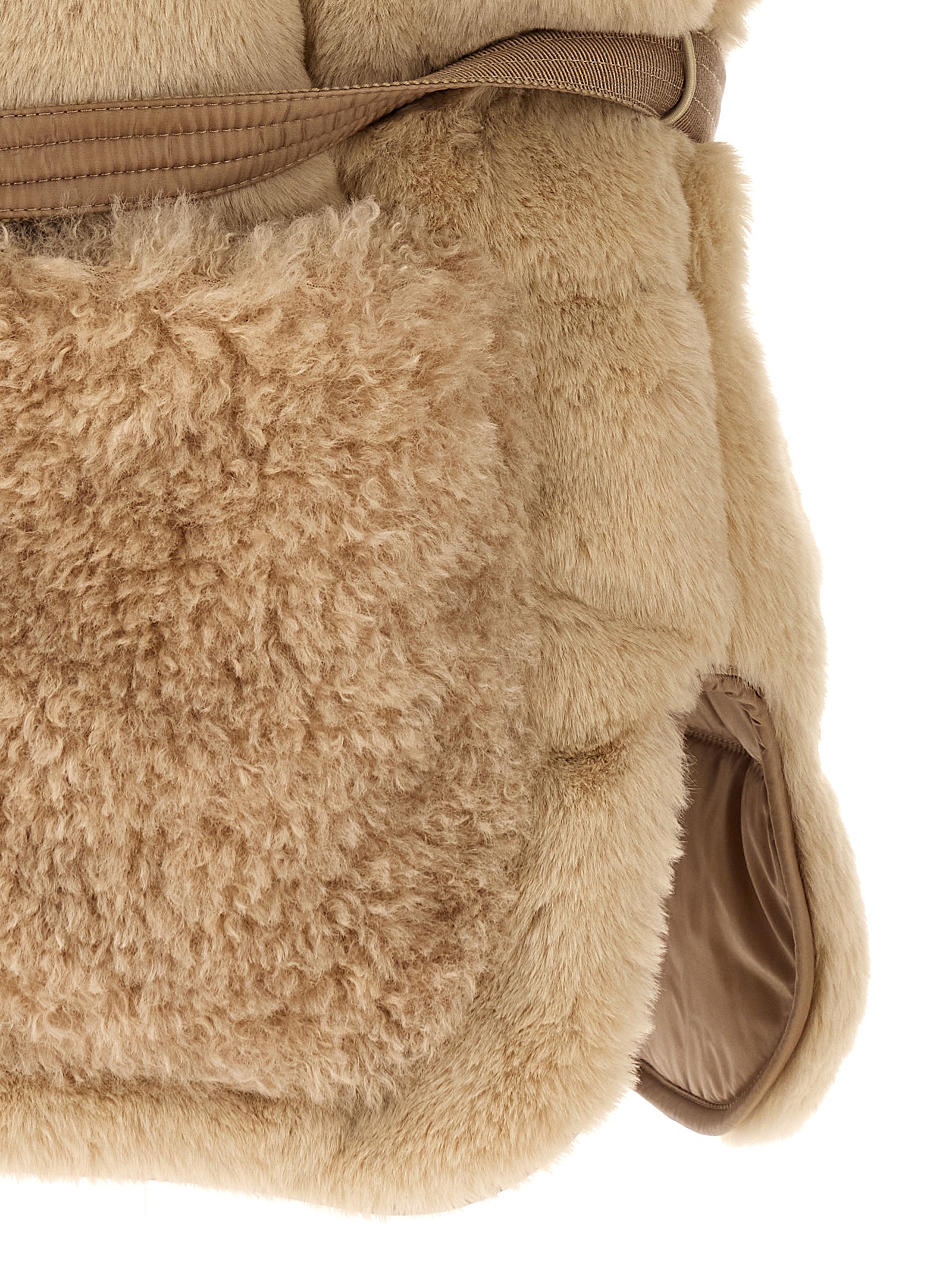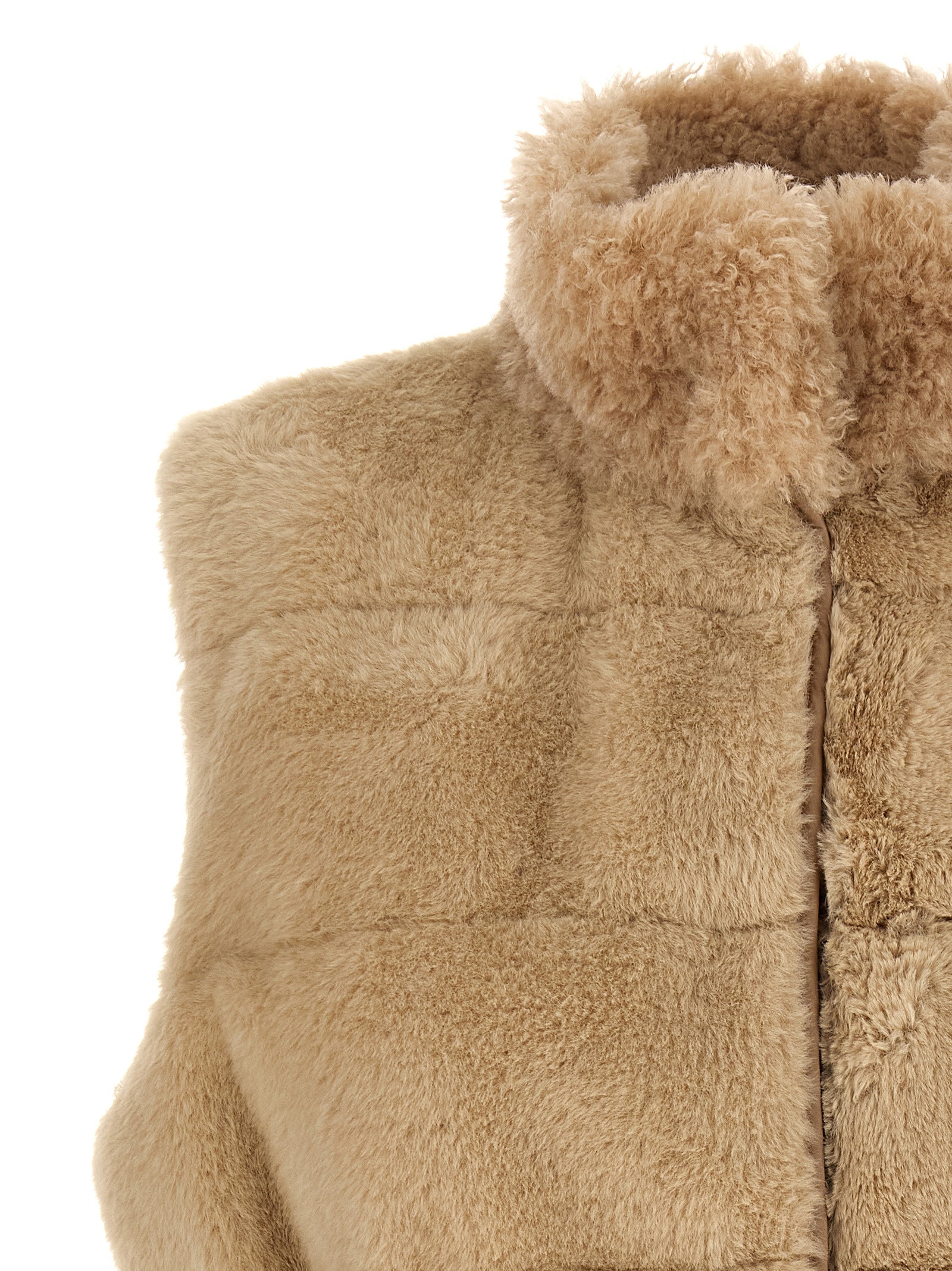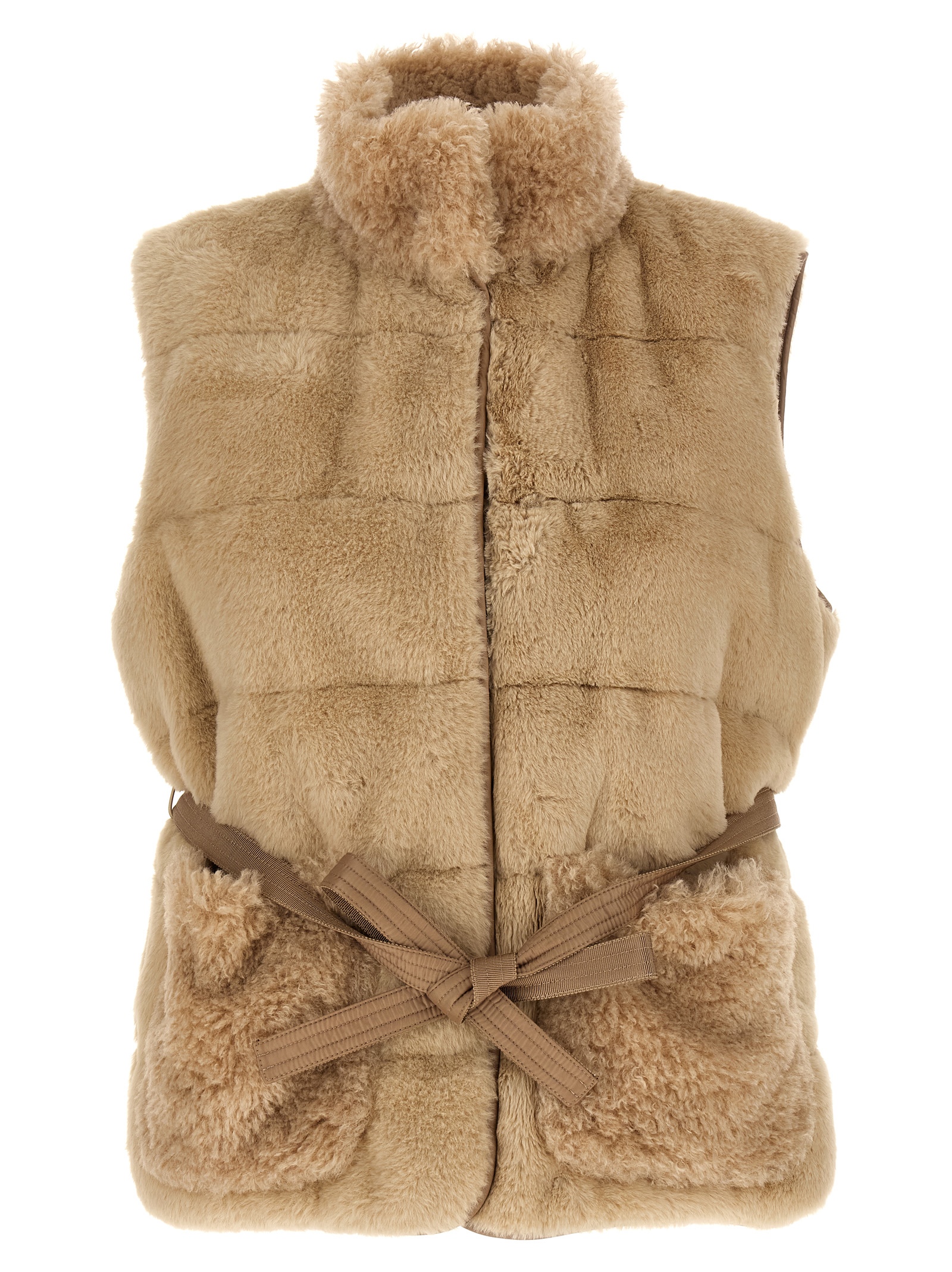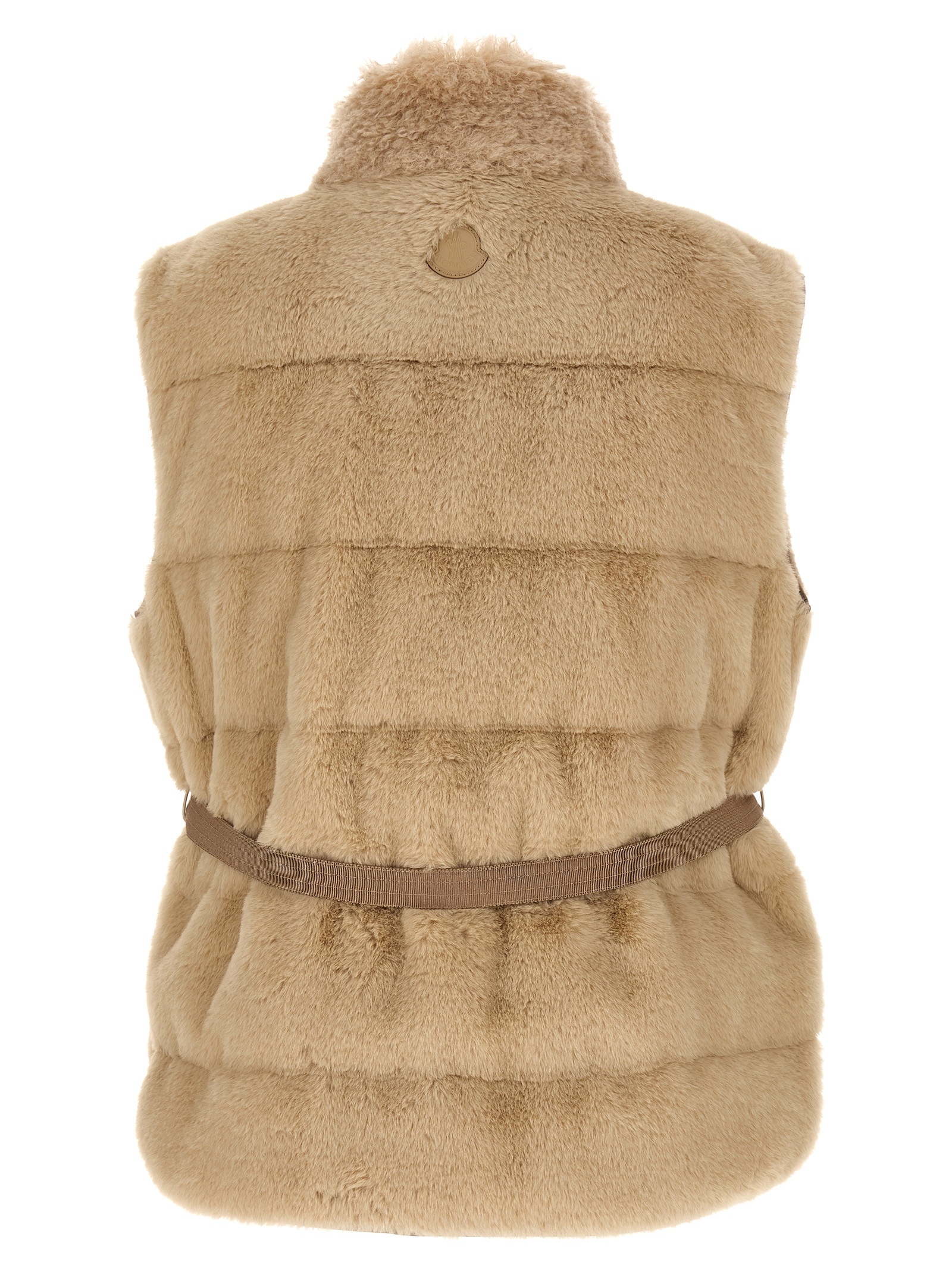 ‘Joui’ quilted fur-effect fabric vest with longue lining saison goose down padding, tone-on-tone leather logo patch at the back, high neck and sherling pockets, front snap button closure, side slits, removable belt.