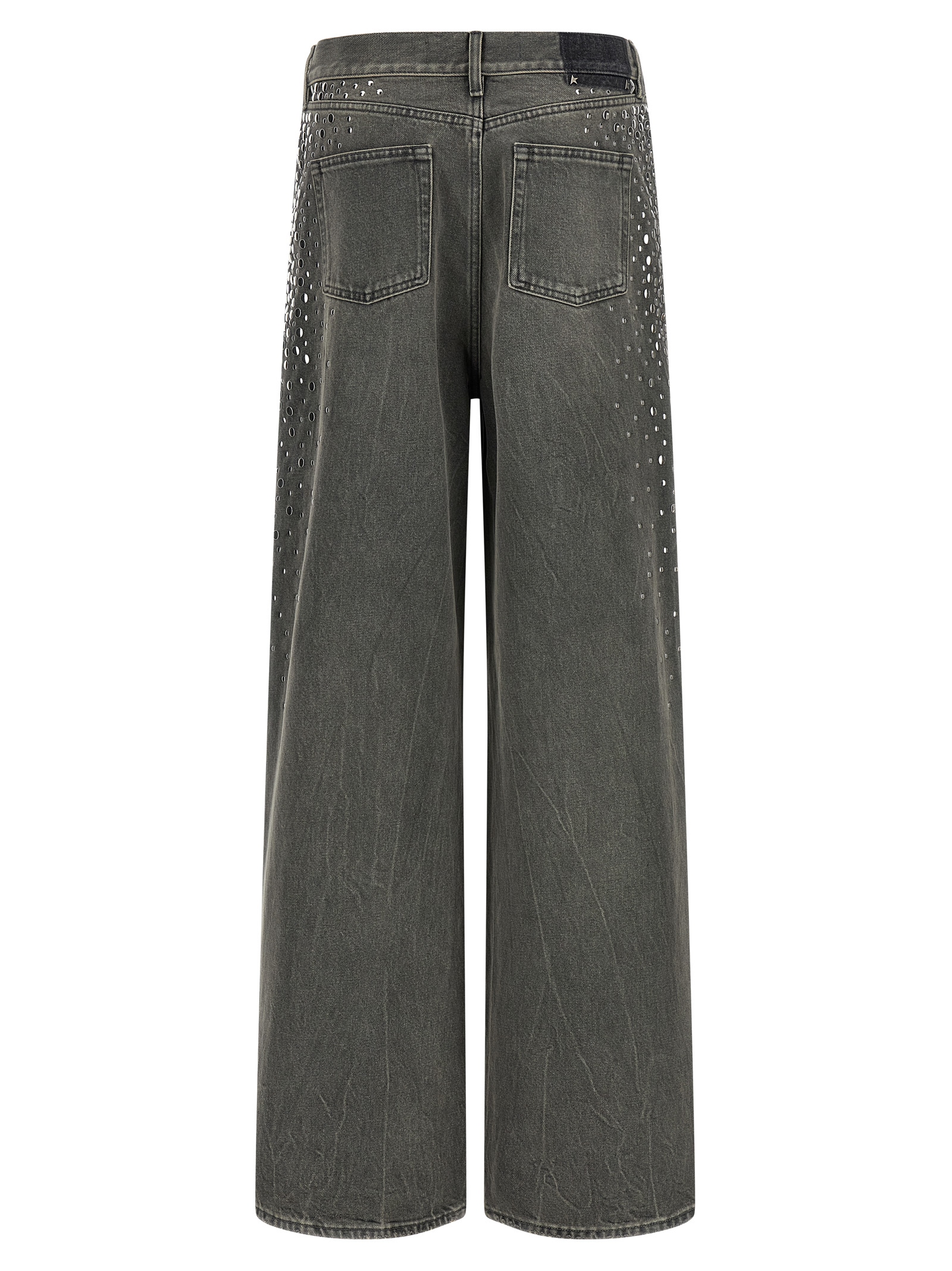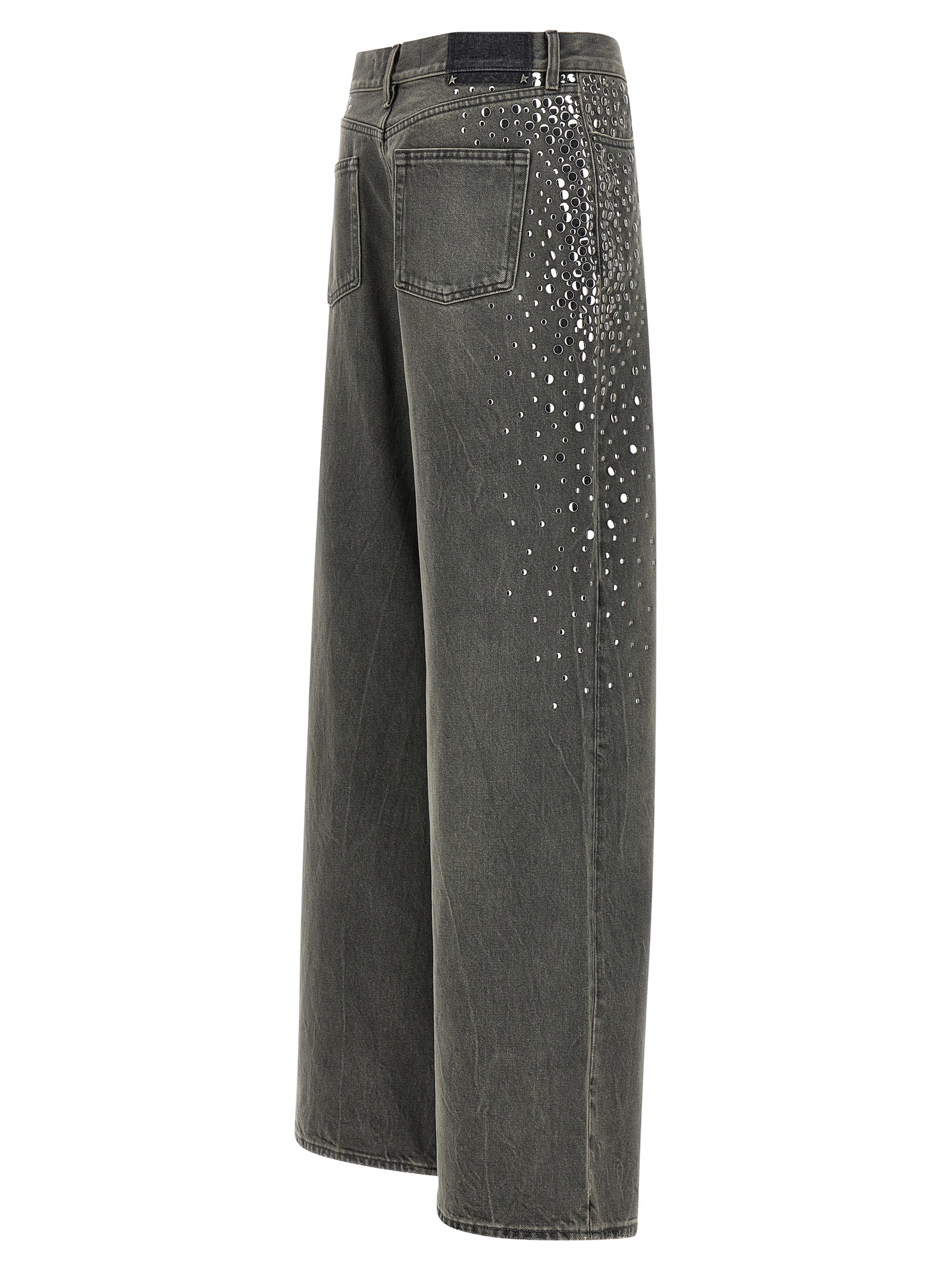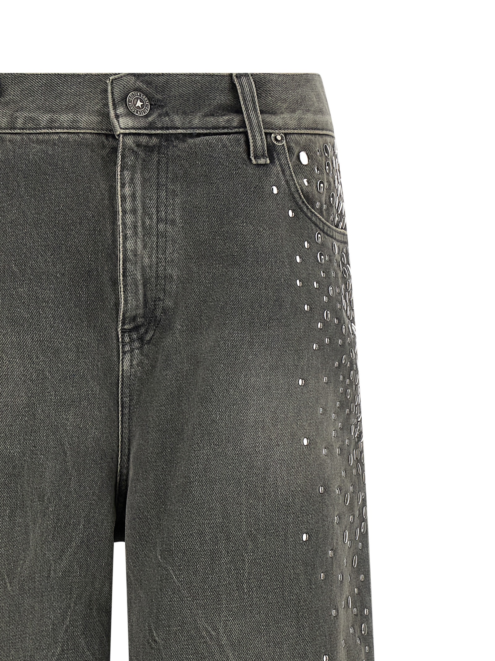 ‘Journey’ Iron Wash cotton denim jeans with dégradé metal stud application, wide and straight leg, medium waist, zip and front button closure, five pockets.