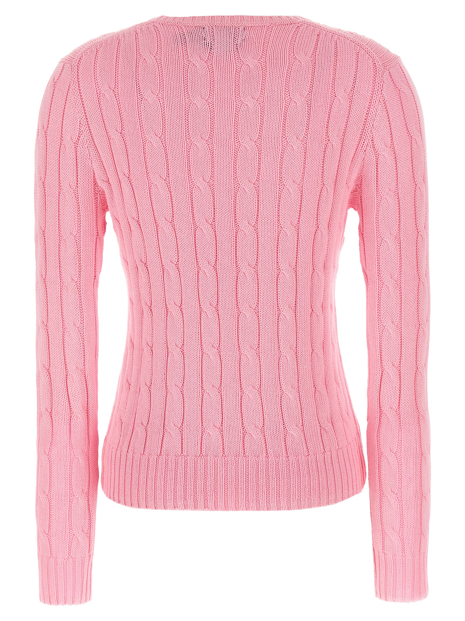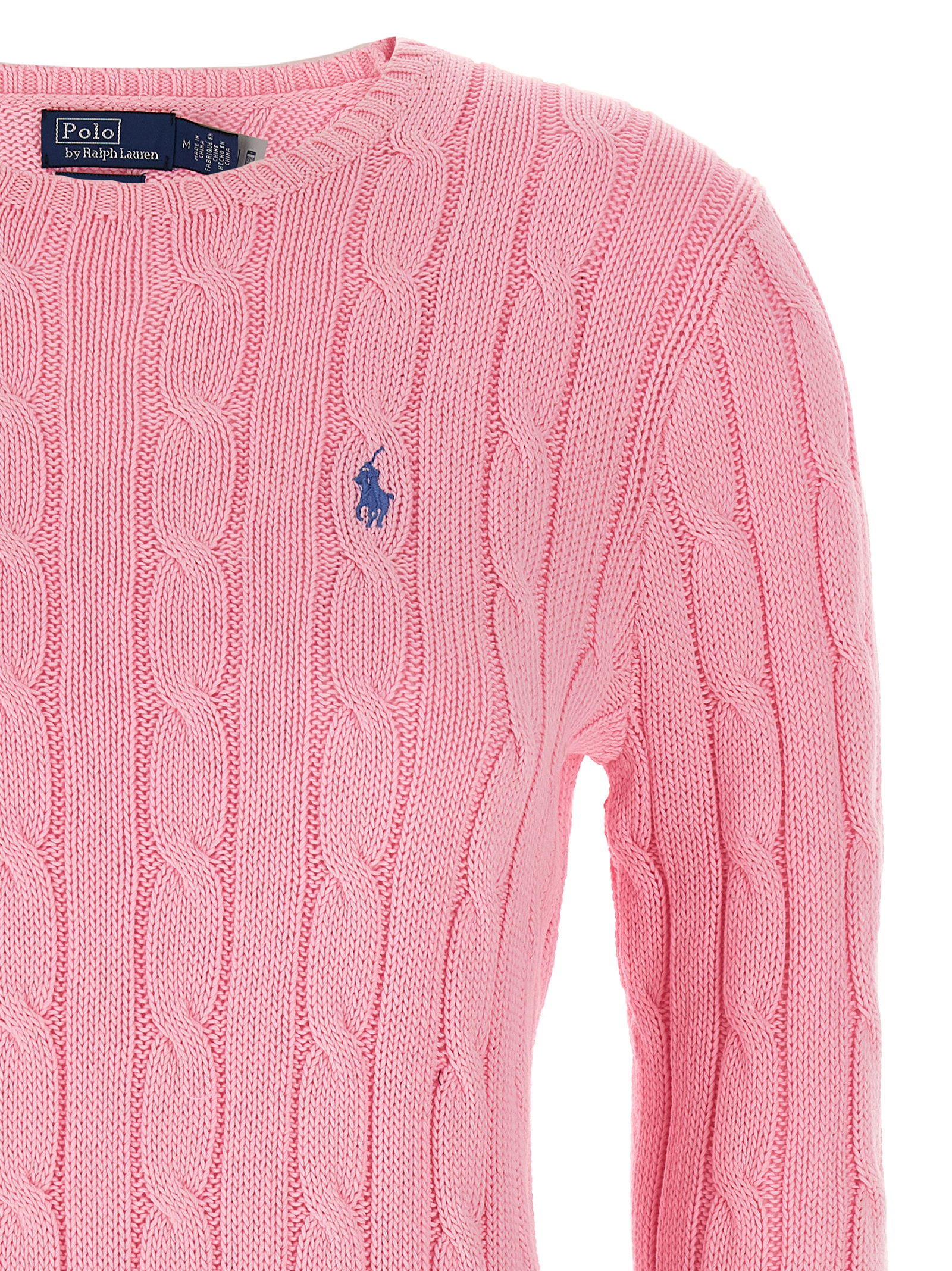 Julianna sweater in Pima cotton with cable knit, contrasting logo embroidery on the front, crew neck, long sleeves with cuffs.