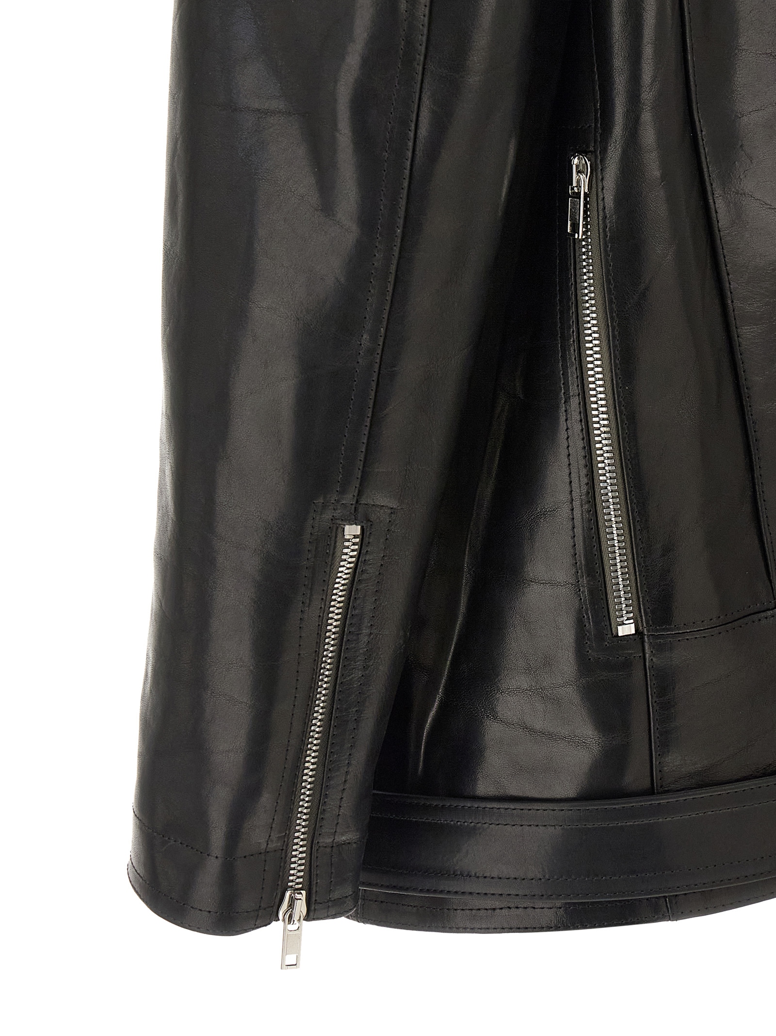 ‘Jumbo Bauhaus Stooges’ jacket in shiny and heavy vegetable tanned ox leather with natural wax, double-breasted biker style with front asymmetrical zip closure, wide collar, pockets, long sleeves with zip on the cuffs, badges on the shoulders, lining, removable belt.