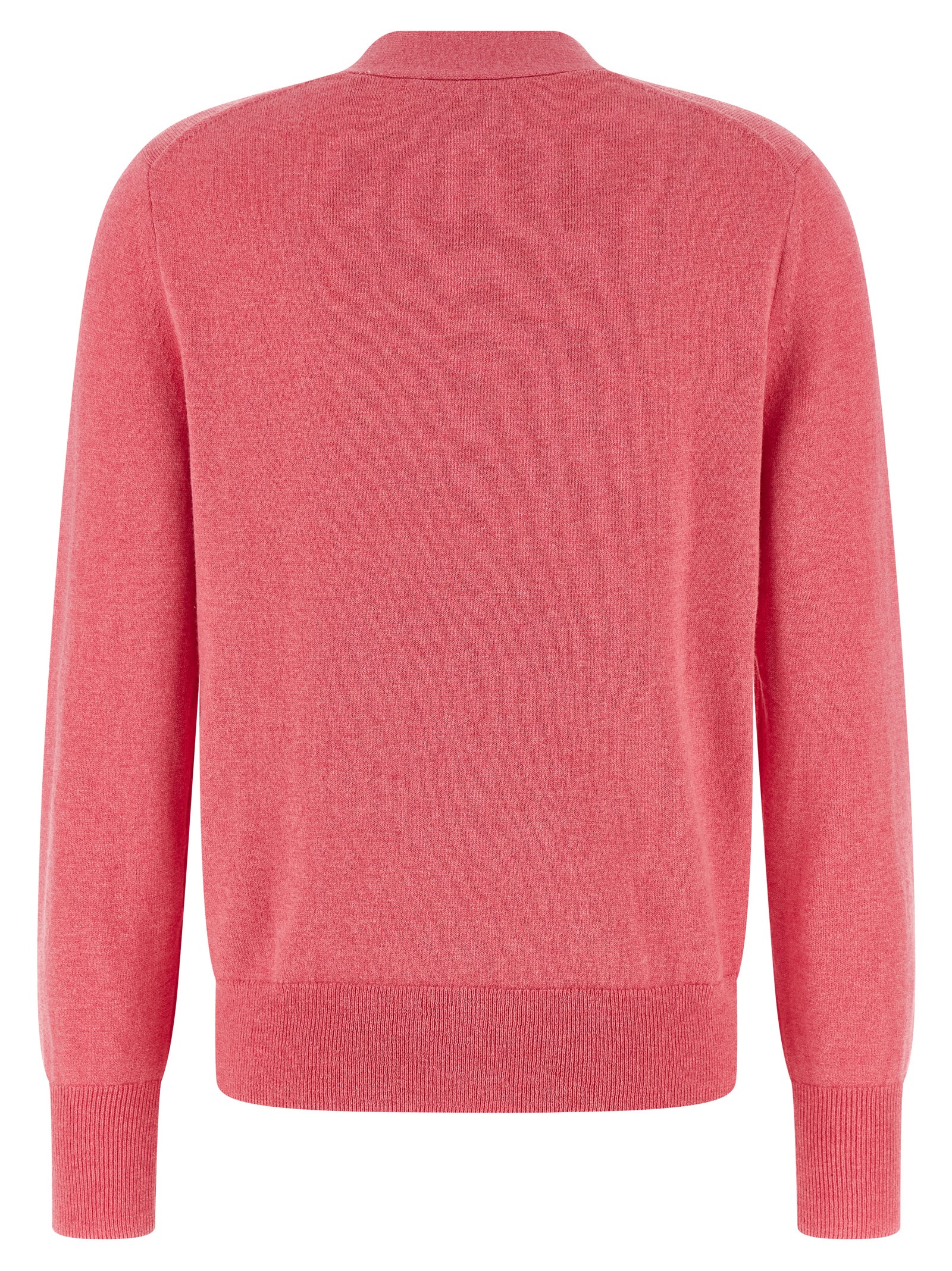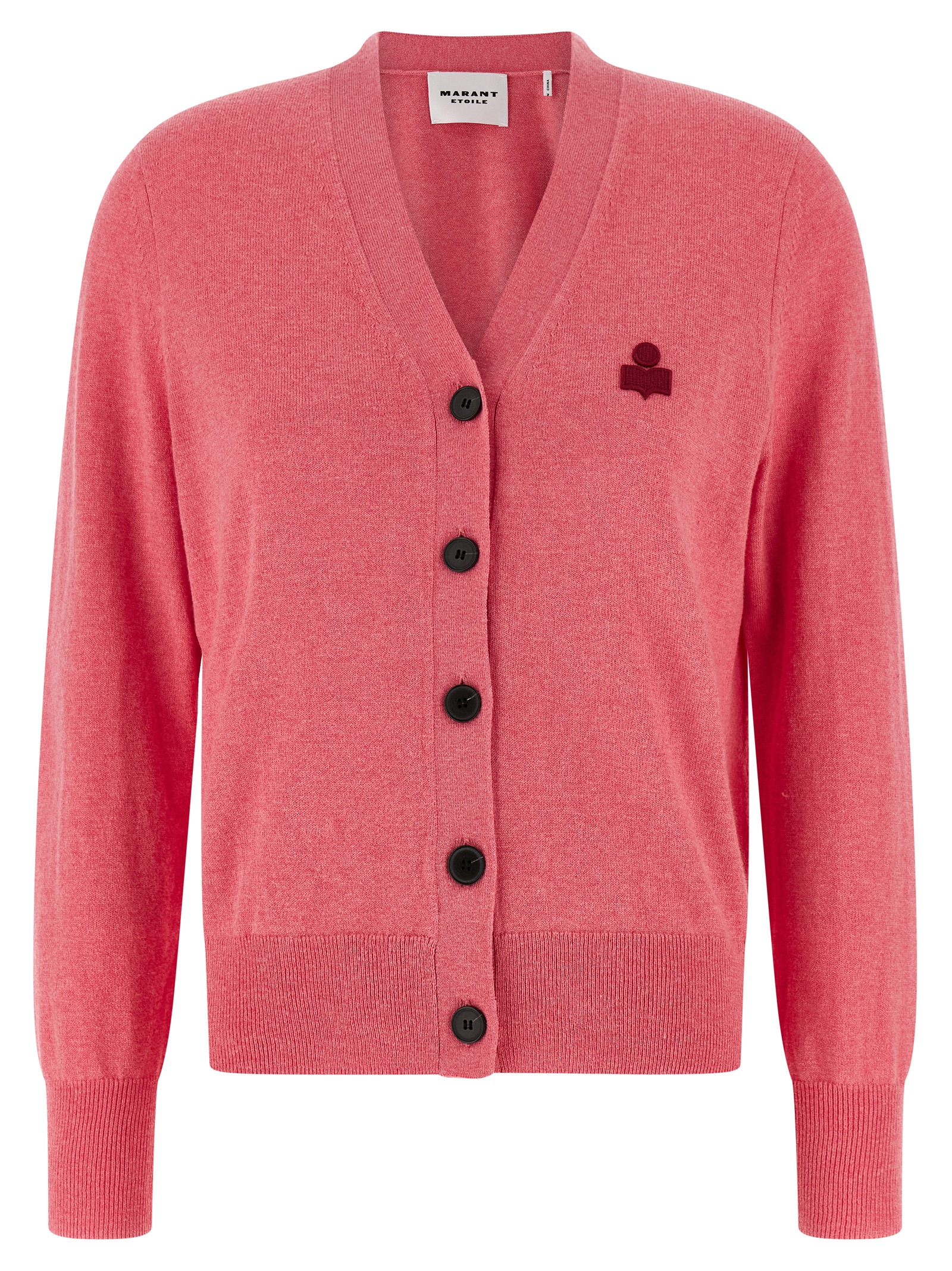 ‘Karina’ mélange cotton and wool blend cardigan, contrast logo embroidery and front horn button closure, V-neck, long cuffed sleeves, and band on the hem.