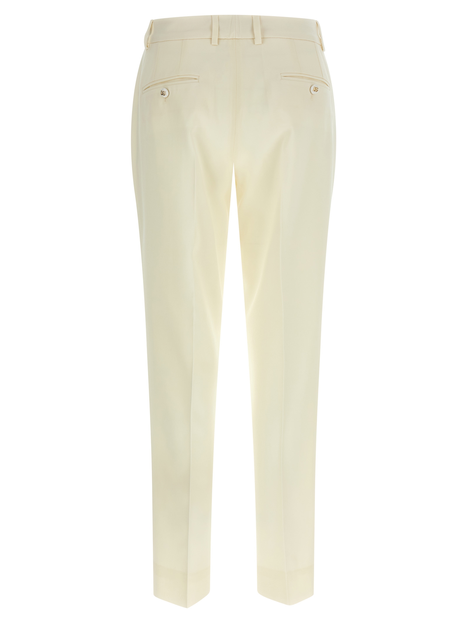 Stretch wool canvas trousers, low ‘Kate’ waist, straight leg, stretched pleat, pin tucks, zip and front button closure, pockets.