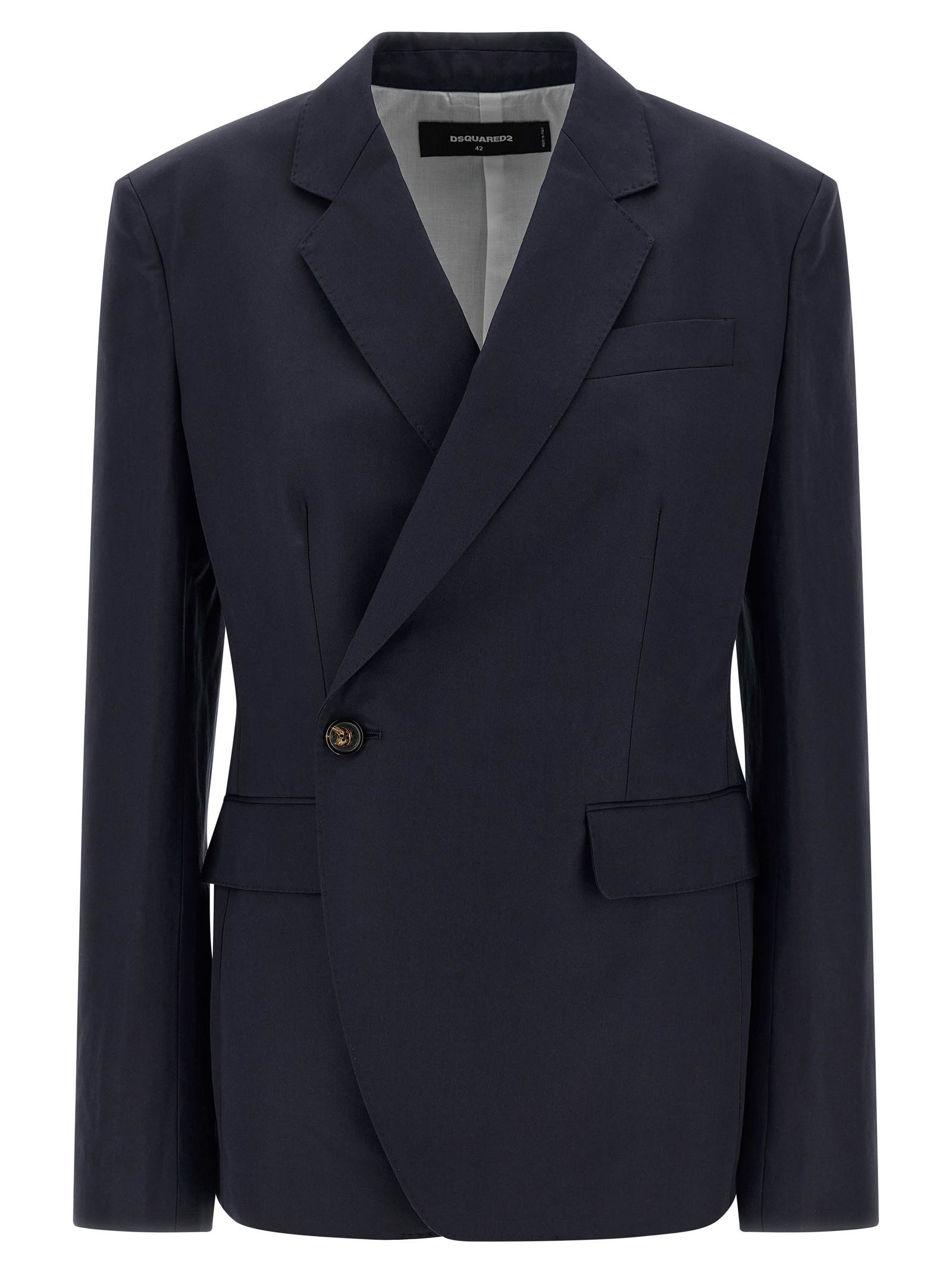 ‘Kathy’ double-breasted cotton gabardine blazer with front button closure, mirror lapels, breast pocket, flap pockets, structured shoulder strap, long sleeves, back vents.
