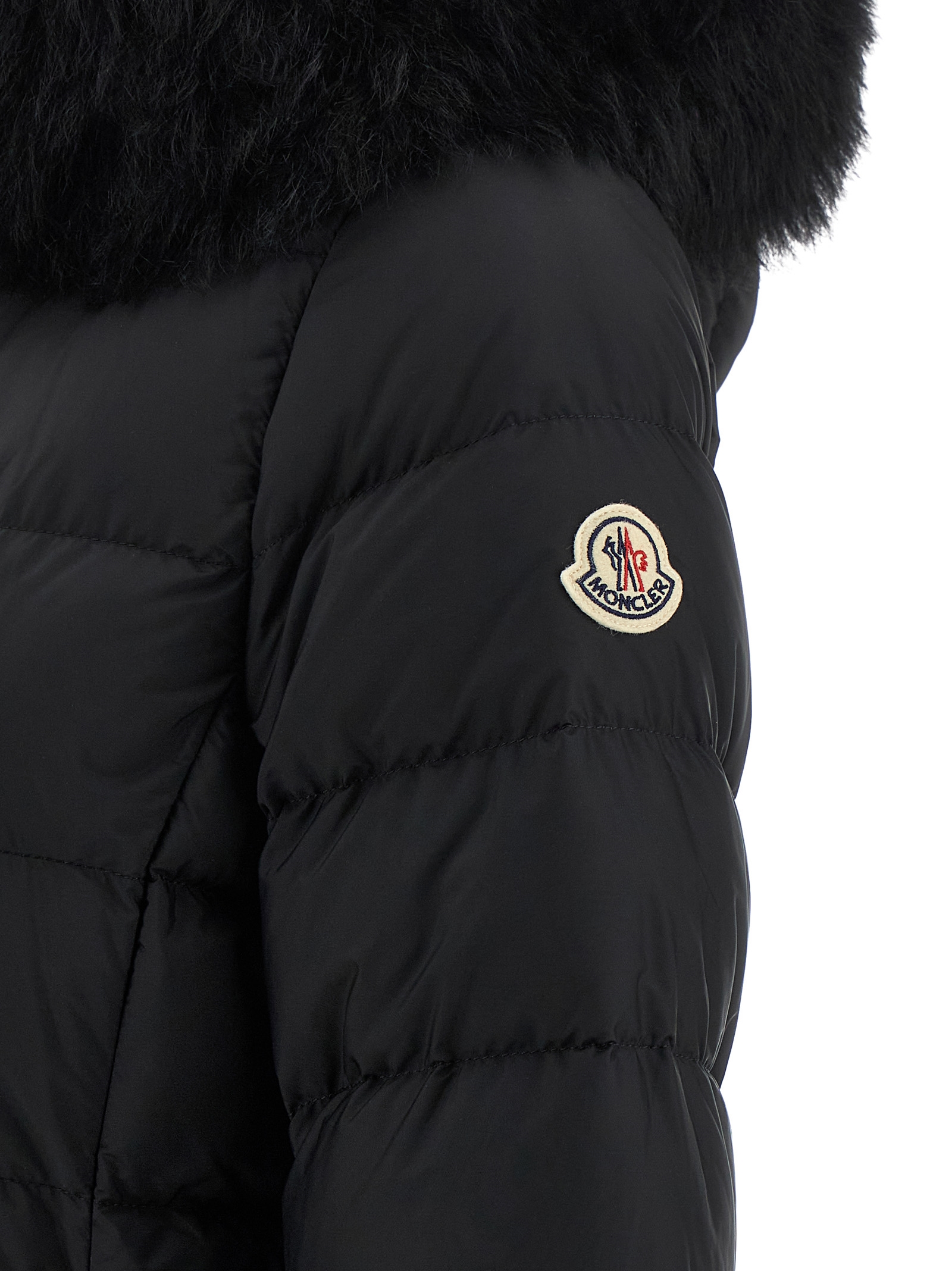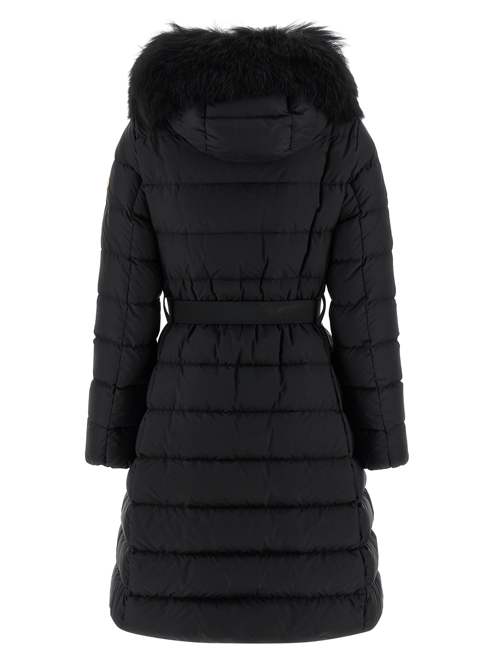 Long ‘Khloesse’ down jacket in waterproof fabric, quilted, feather padding, high neck, hood with removable fur, pockets, front zip closure, elastic waistbelt with logo buckle.