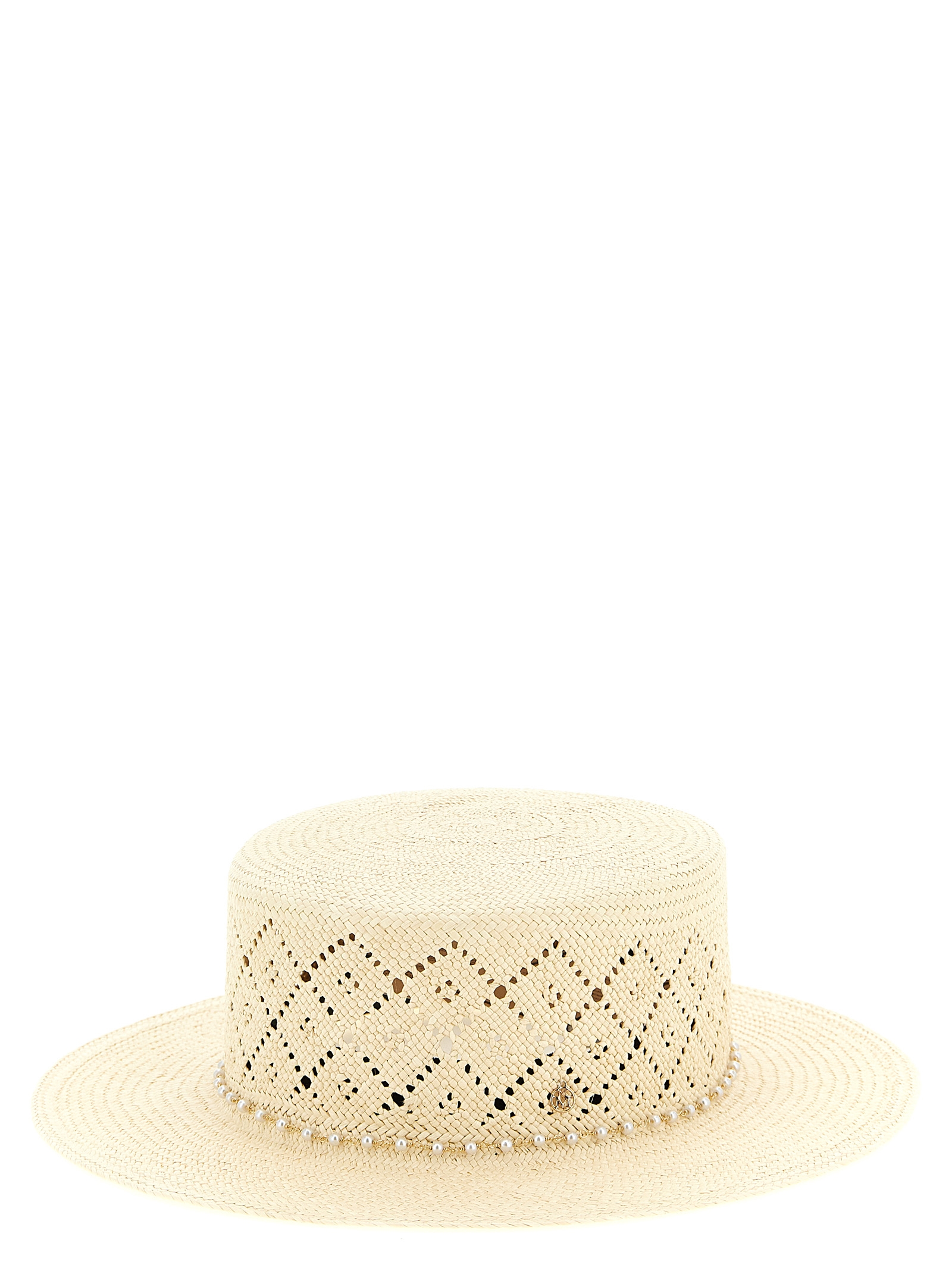‘Kiki’ hat in natural Panama straw, boater model with embroidery-effect details and a gold metal chain with pearls.