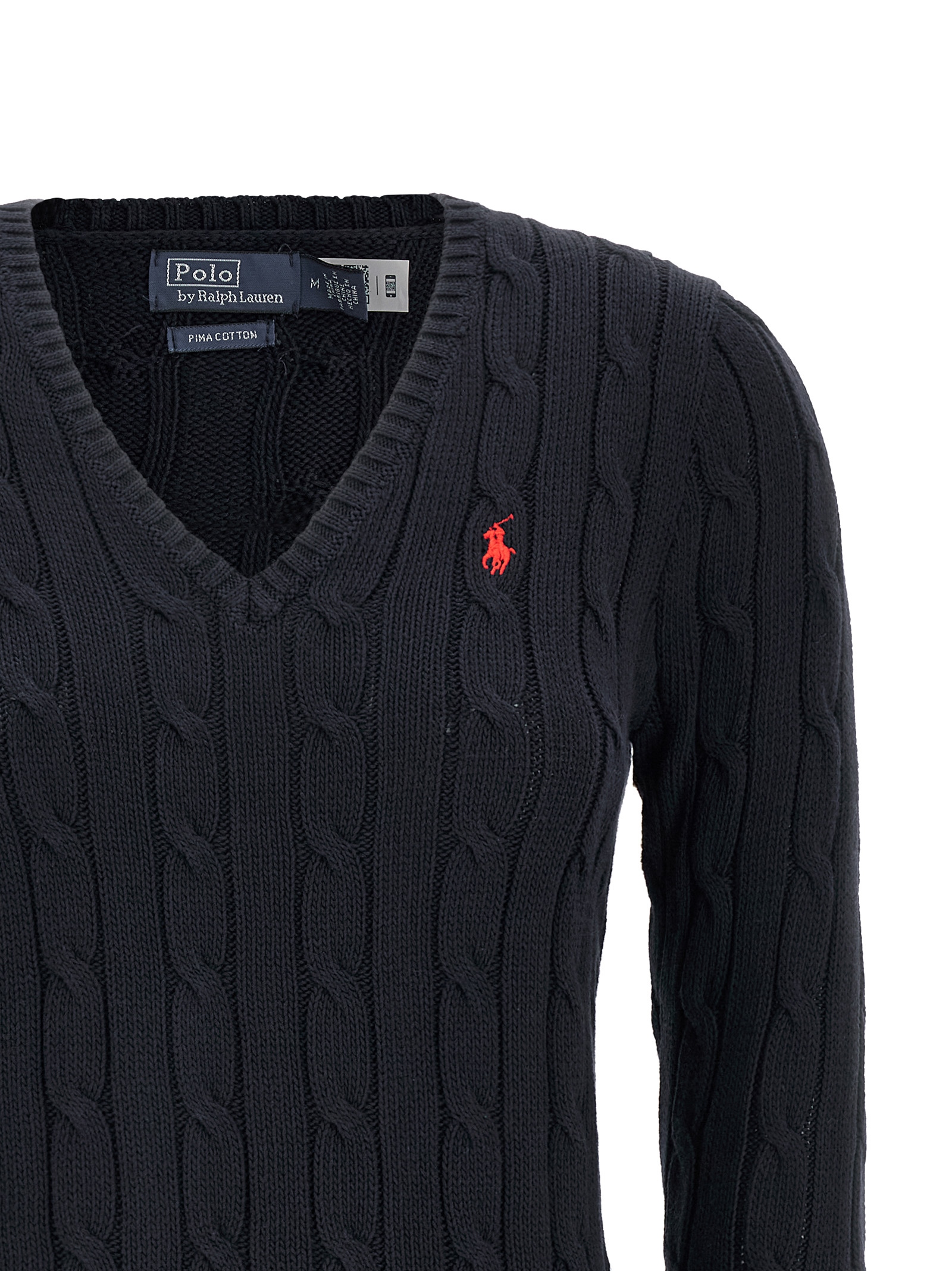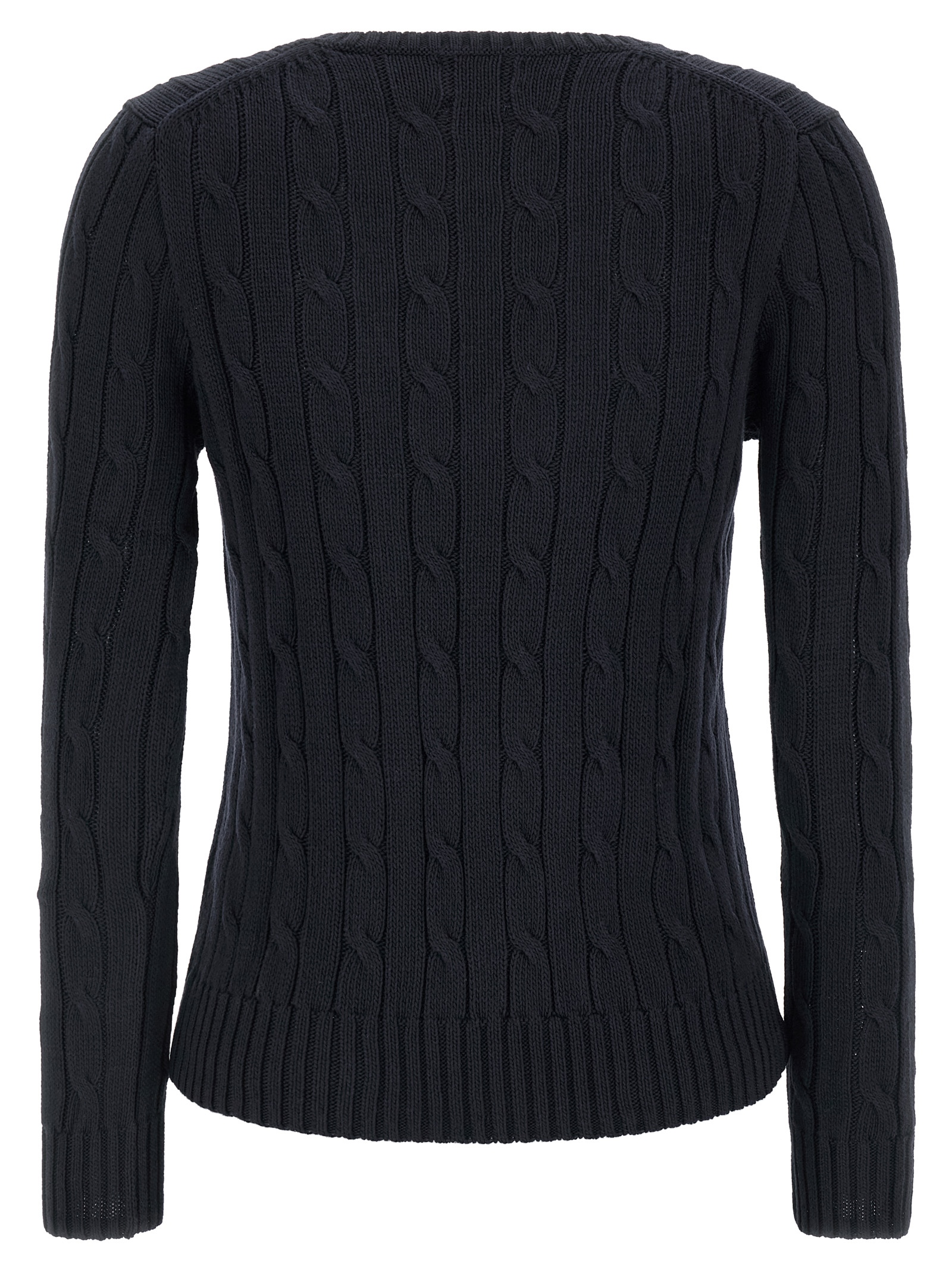 Pima cotton ‘Kimberly’ sweater with cable pattern, front contrast logo embroidery, V-neck, long cuffed sleeves.