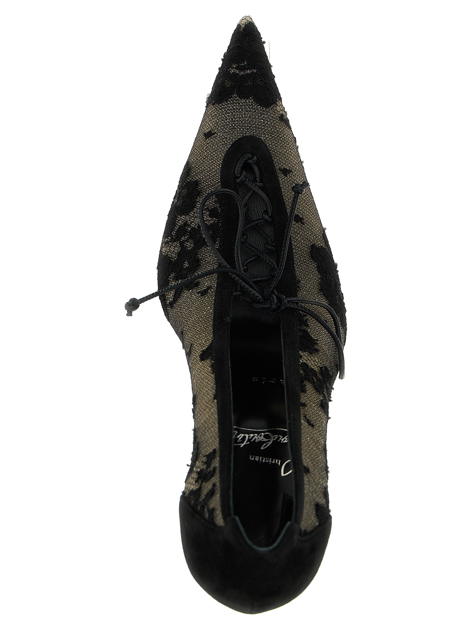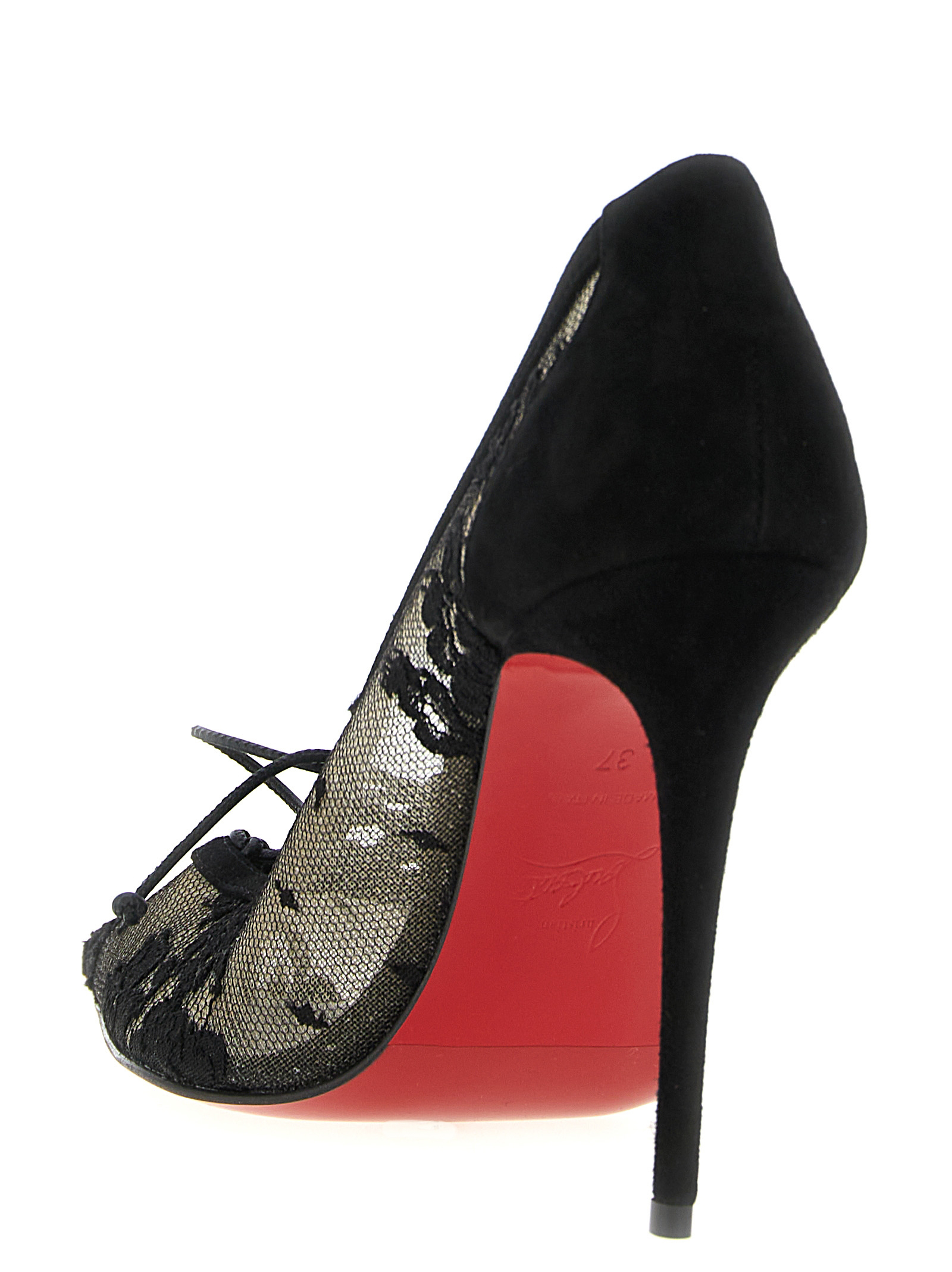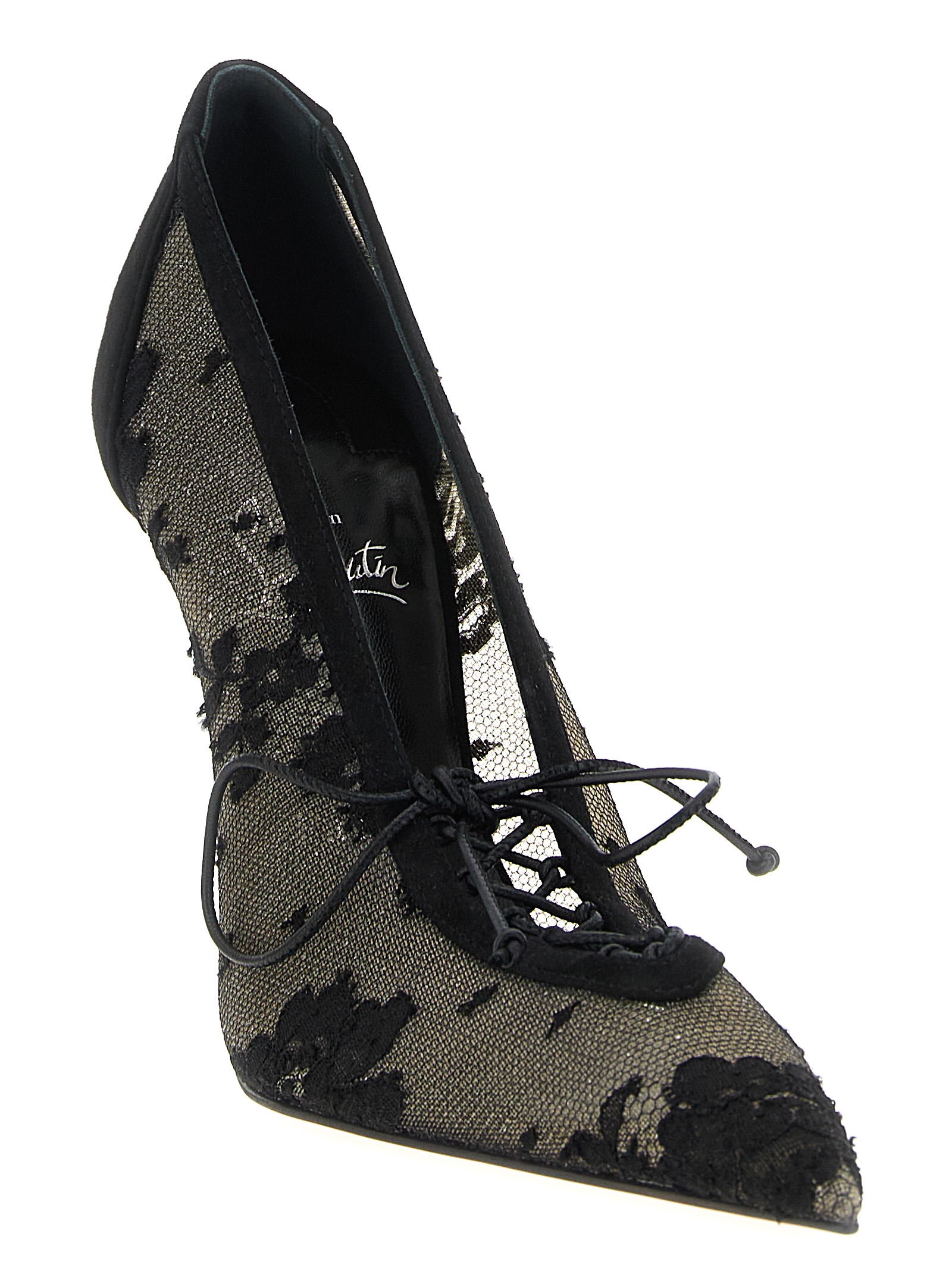 ‘Km Lace’ floral lace, veau velours and kidskin pumps with very tapered toe, front laces, padded insole, stiletto heel, ‘Everlasting Red’ sole.