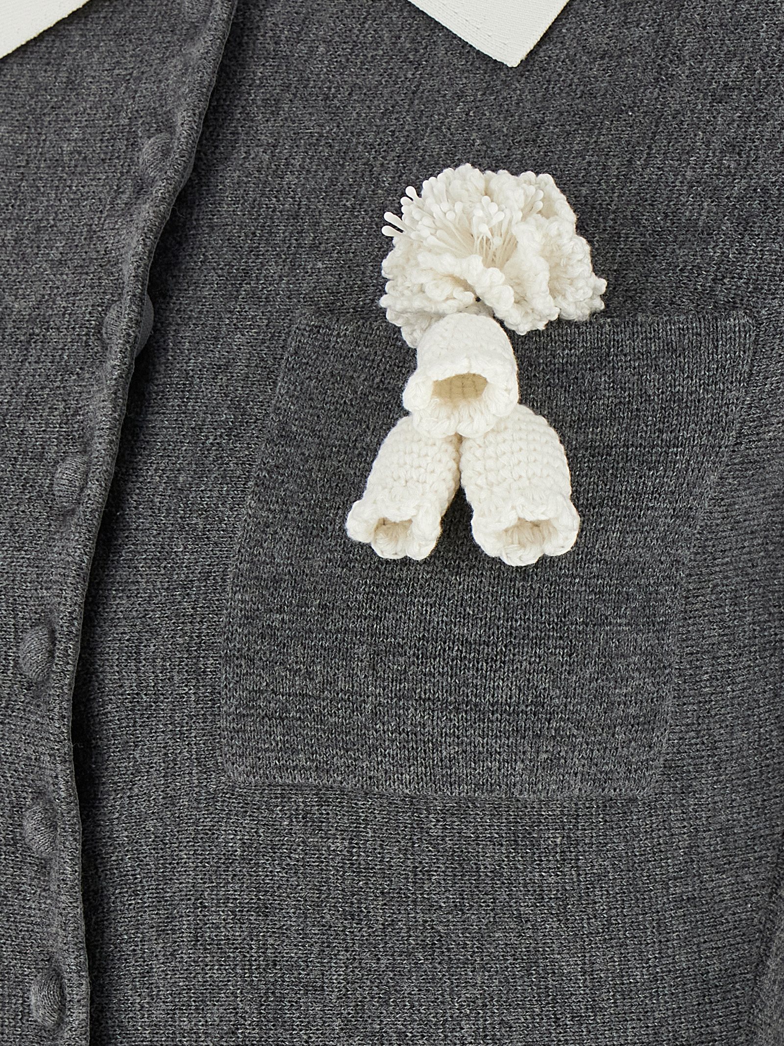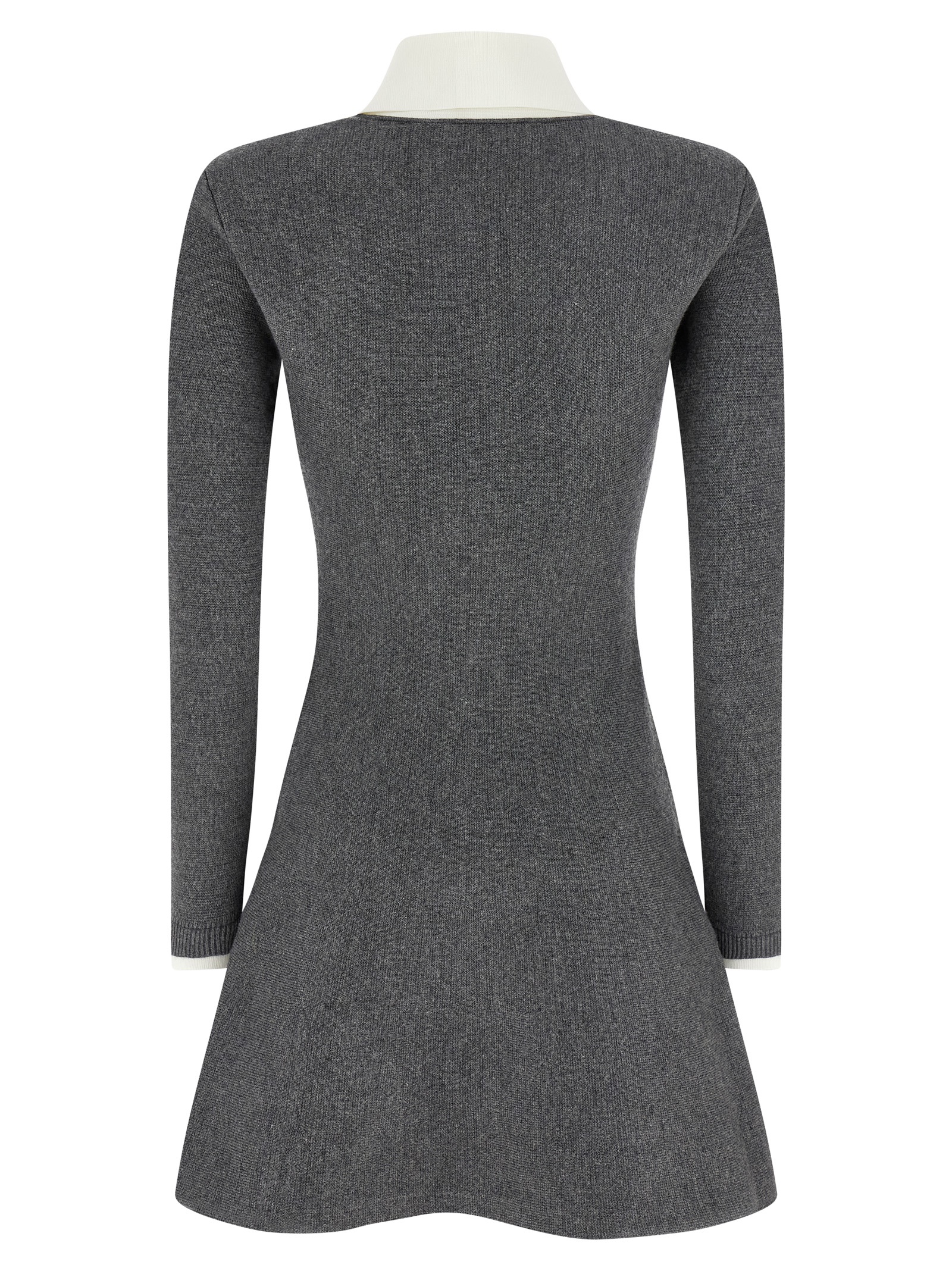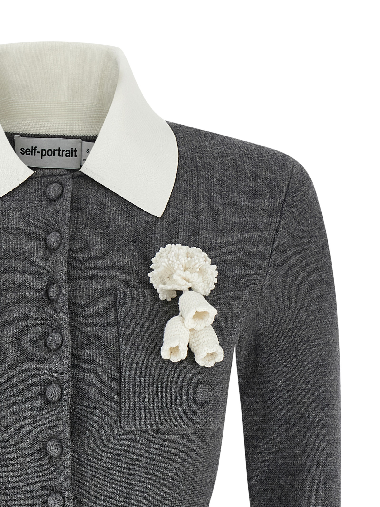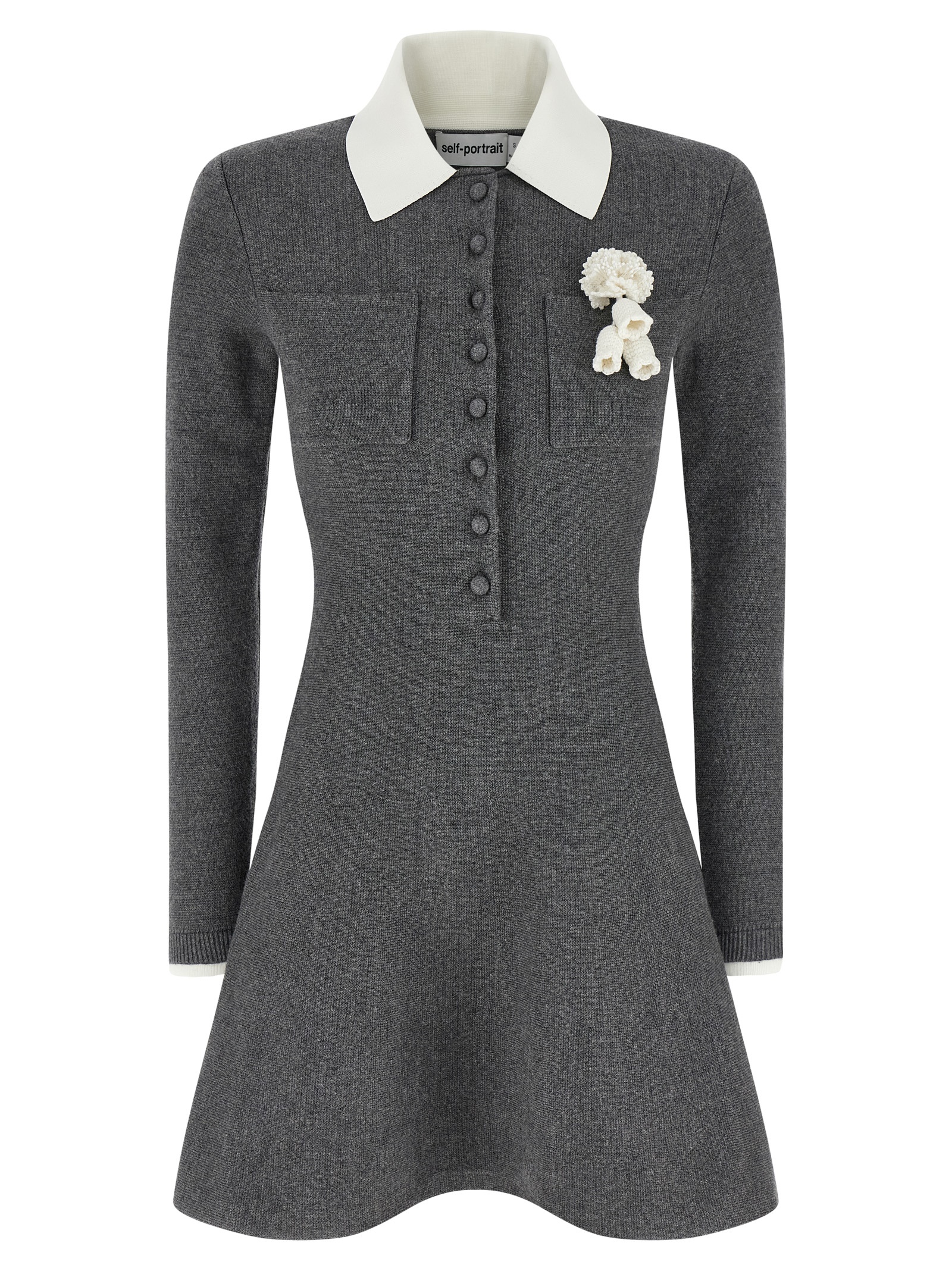 Knitted mini dress, shirt collar and contrast cuffs, removable crochet brooch detail, front buttons, flared hem, long sleeves