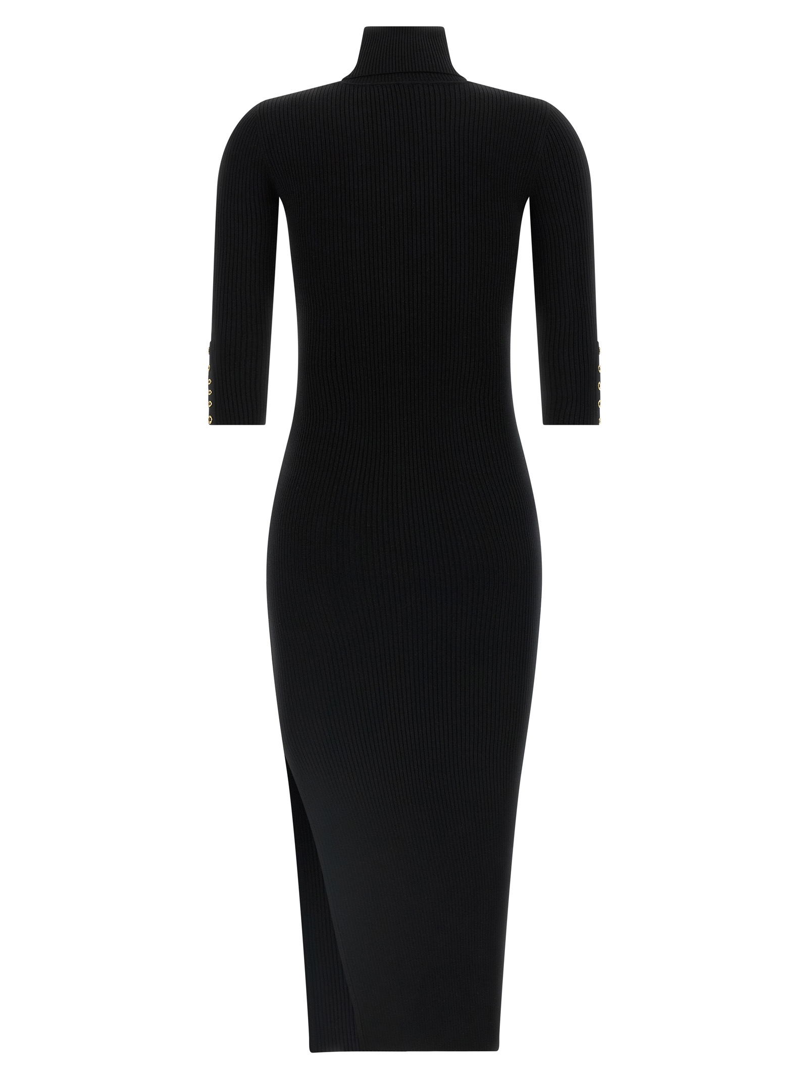 Ribbed knit midi dress, high neck, gold front logo patch, 3/4 sleeves with gold button detail.