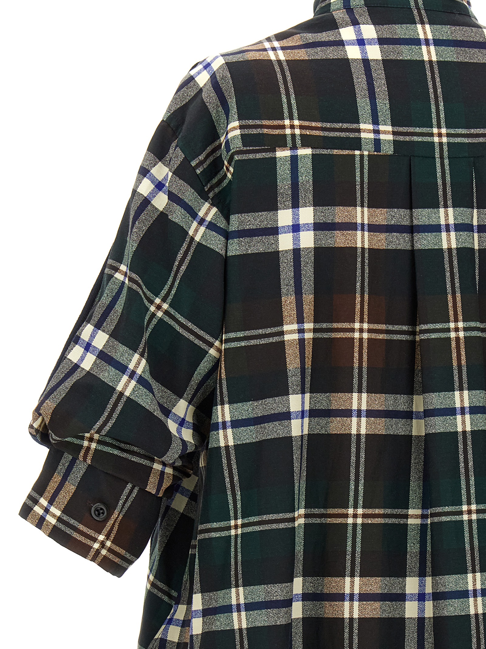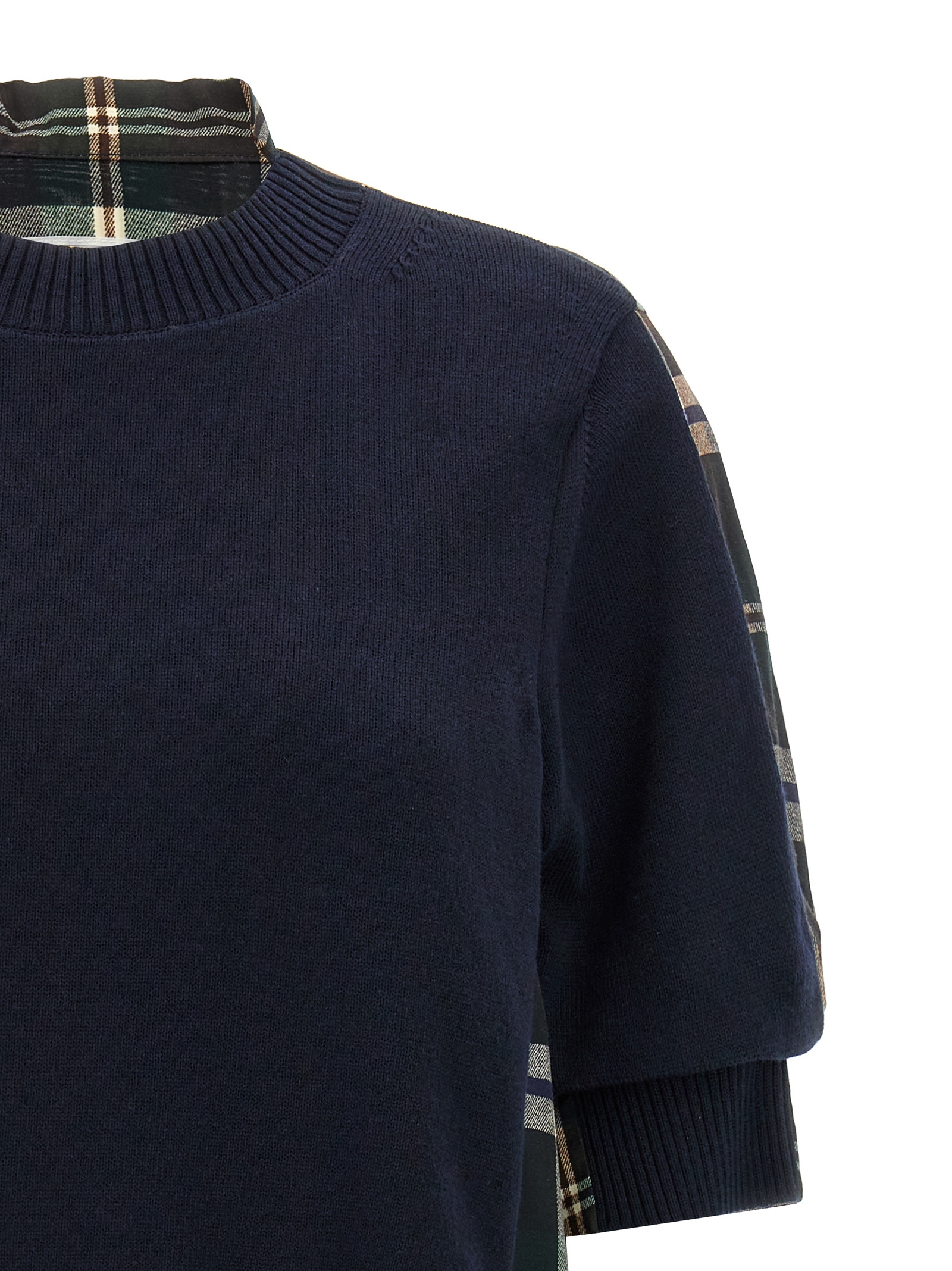 Check print cotton blend shirt with solid knit front panel, crew neck, short balloon sleeves with cuffs.
