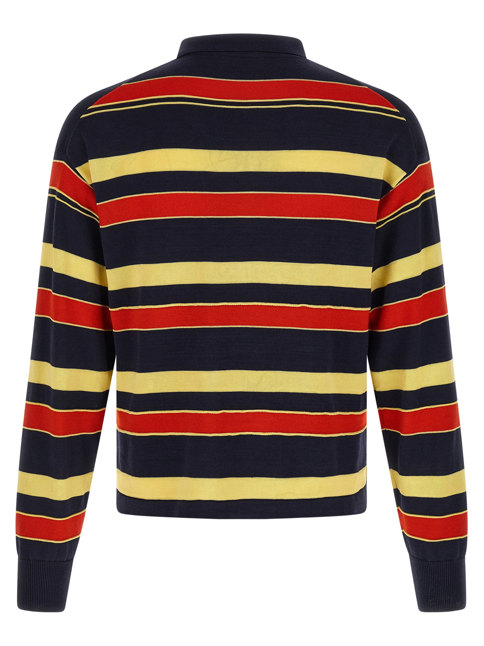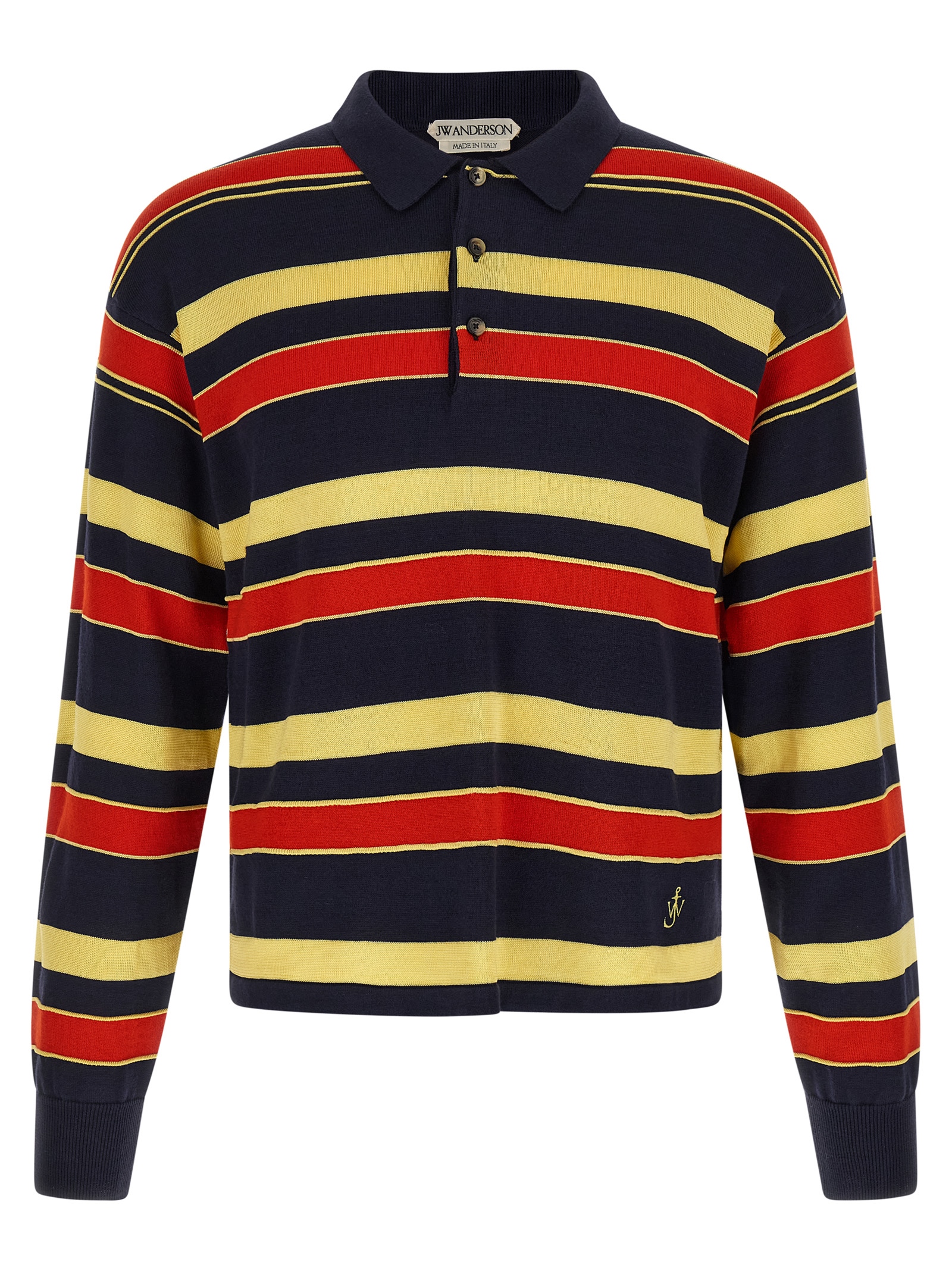 Striped cotton blend knit polo shirt with collar, front button closure, front logo embroidery, side splits, long cuffed sleeves.