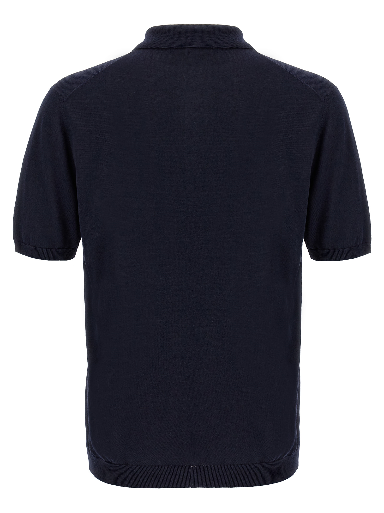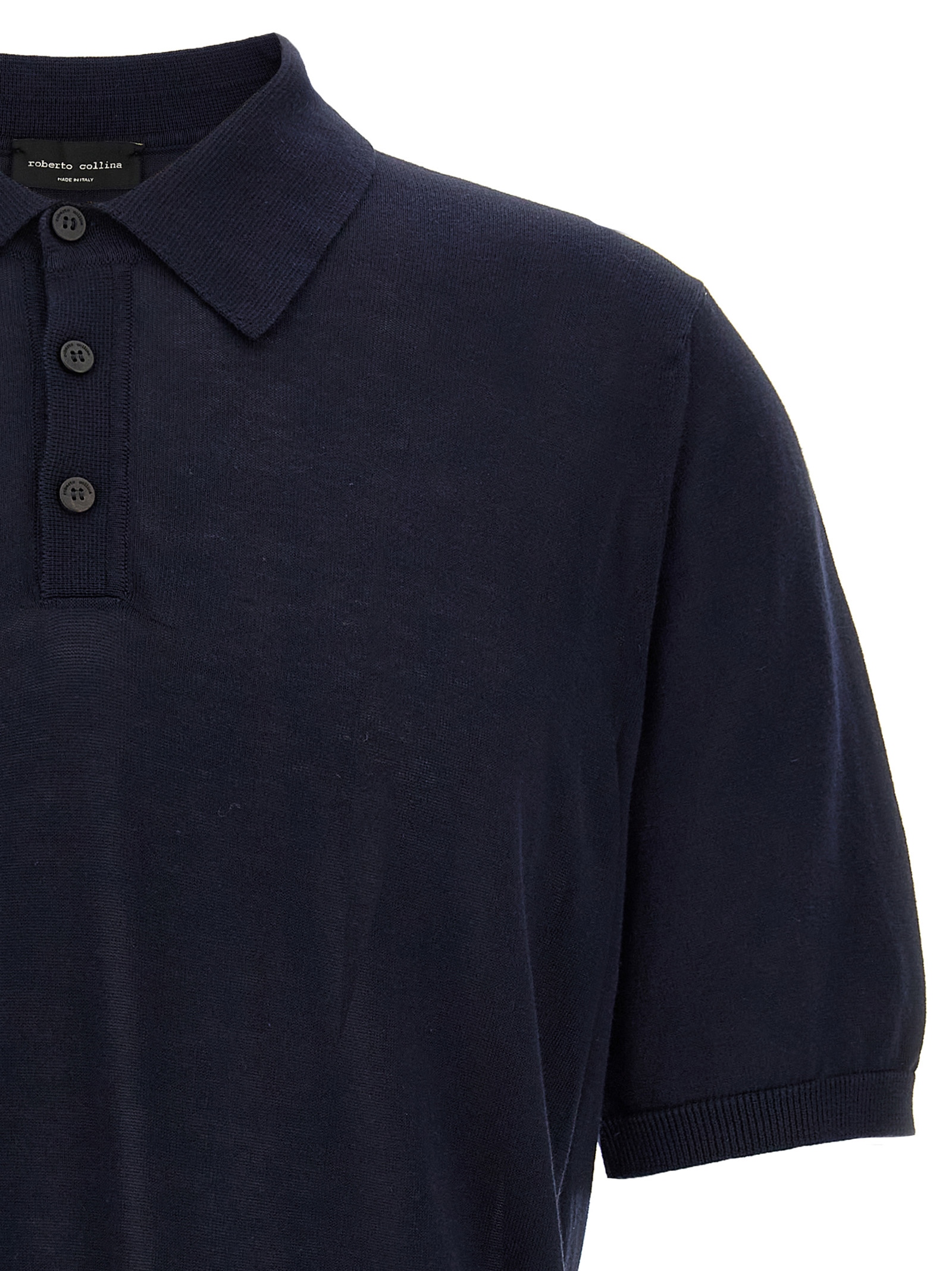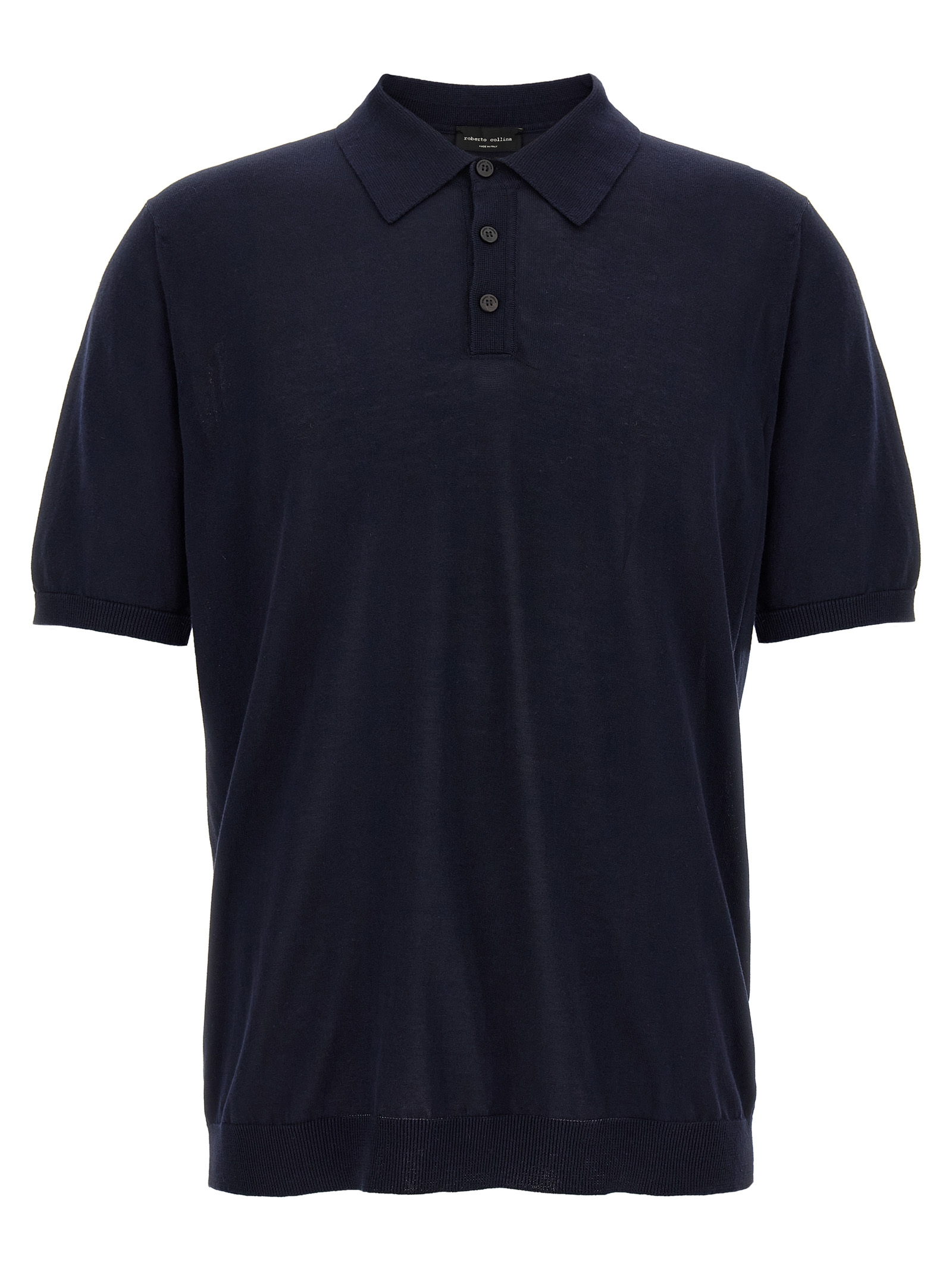 Cotton knit polo shirt, collar, three button closure, short sleeves.