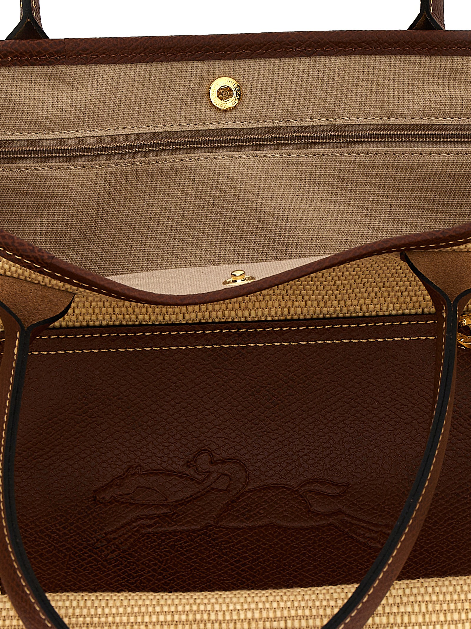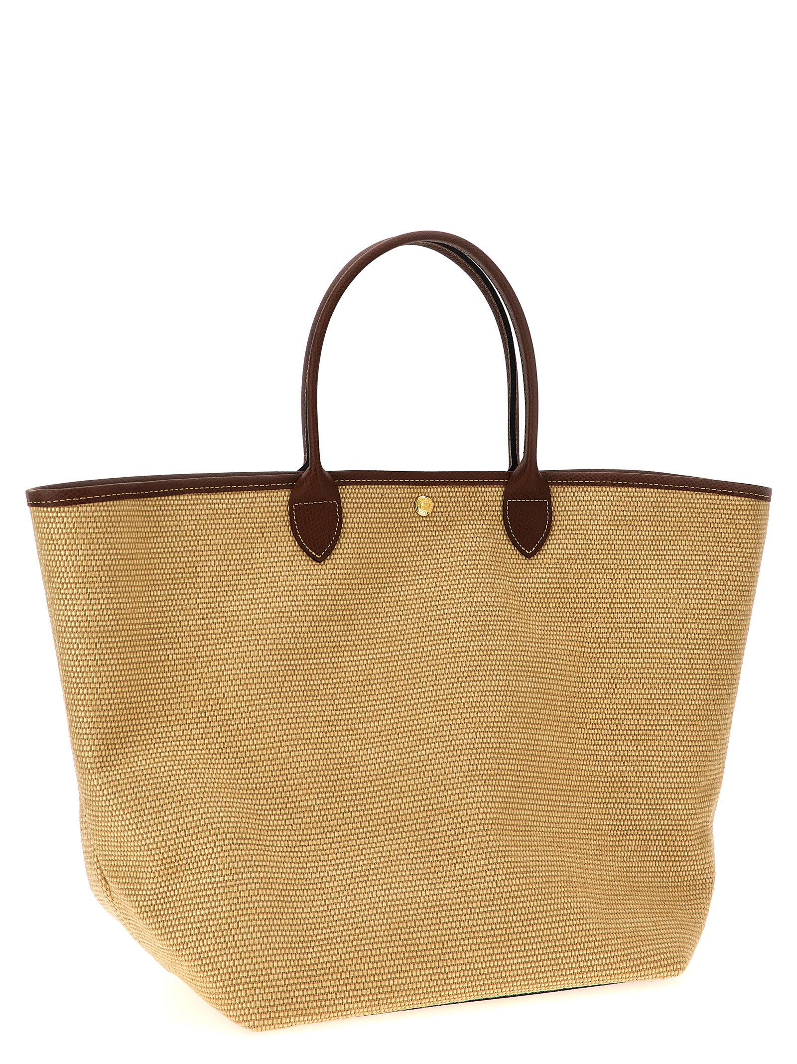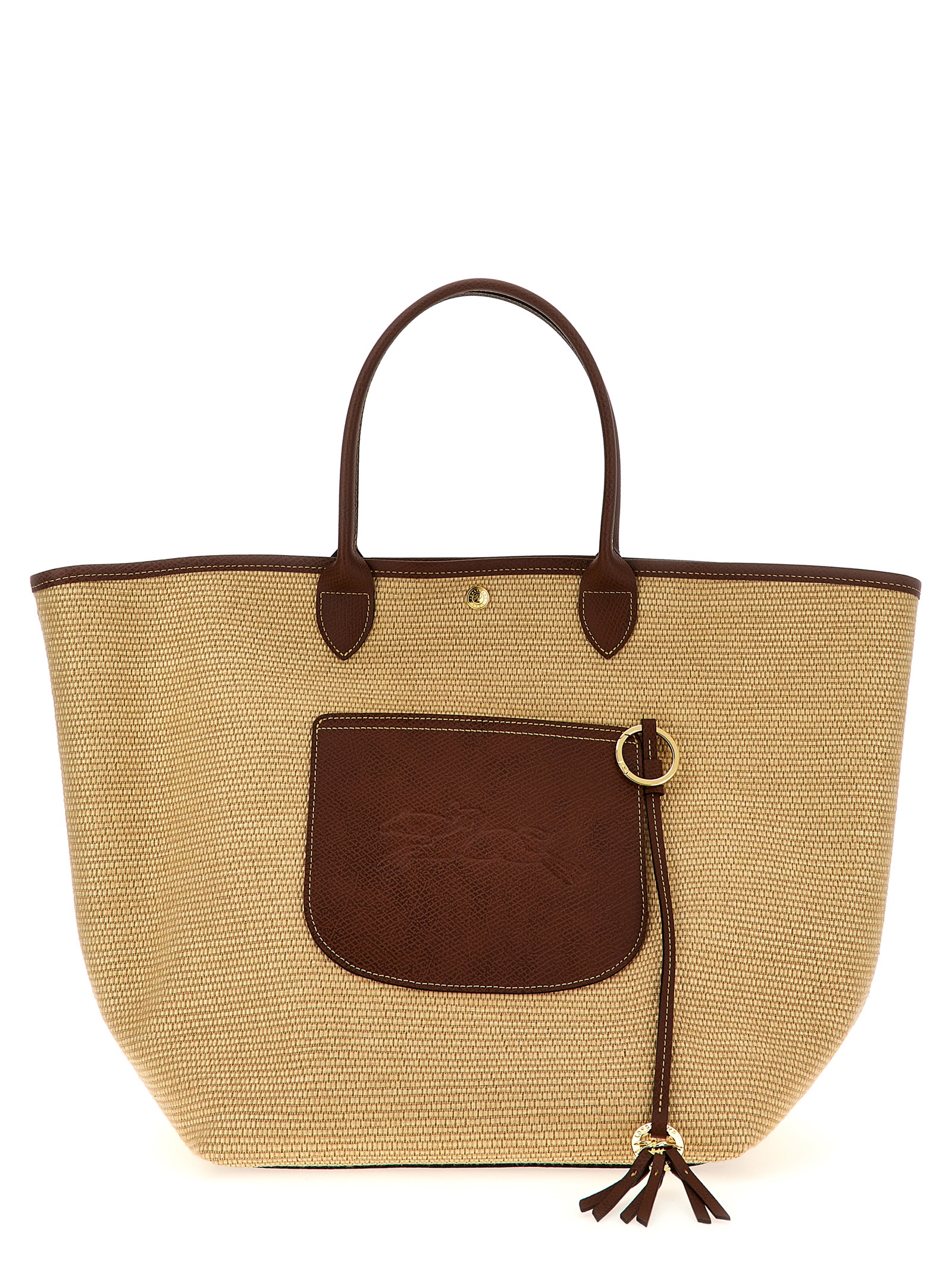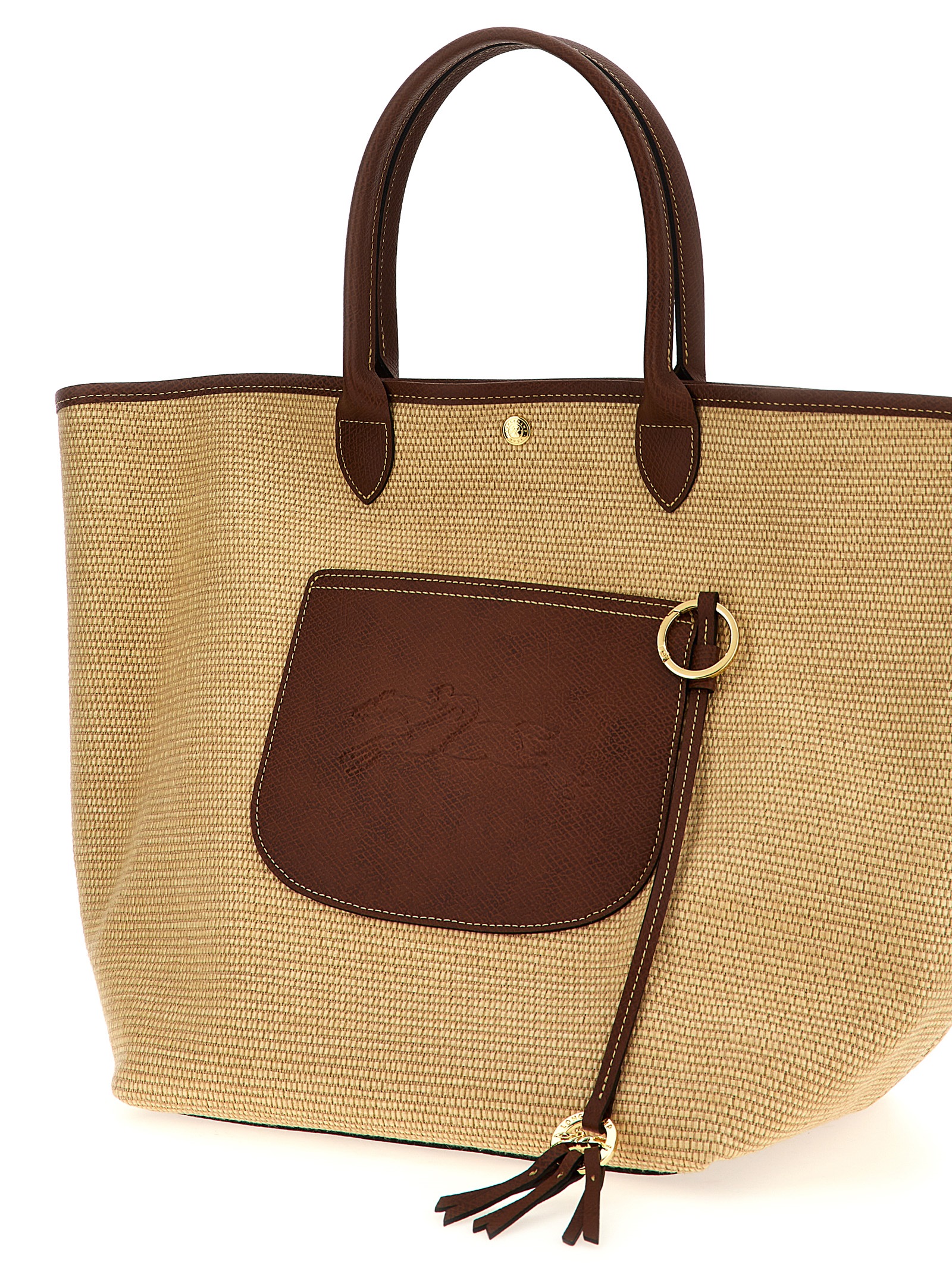 ‘L Le Pliage’ straw-effect canvas shopping bag with hammered leather details, double fixed handle, front pocket with embossed logo, snap button closure, removable key ring.