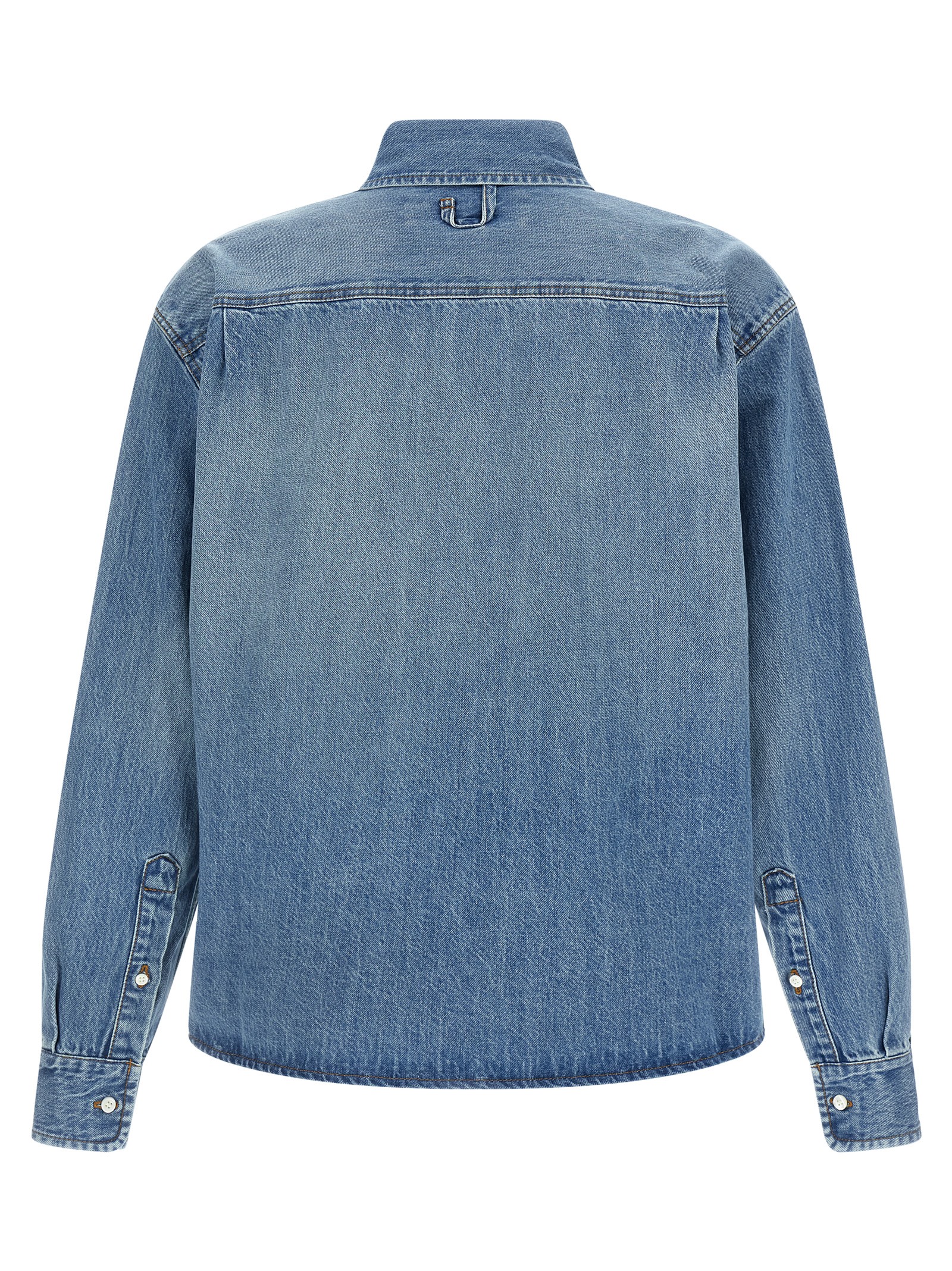 ‘La Chemise De-Nîmes Simon’ shirt in washed cotton denim with contrast stitching, logo intarsia and front button closure, long sleeves with cuffs and dropped shoulders, asymmetrical hem.