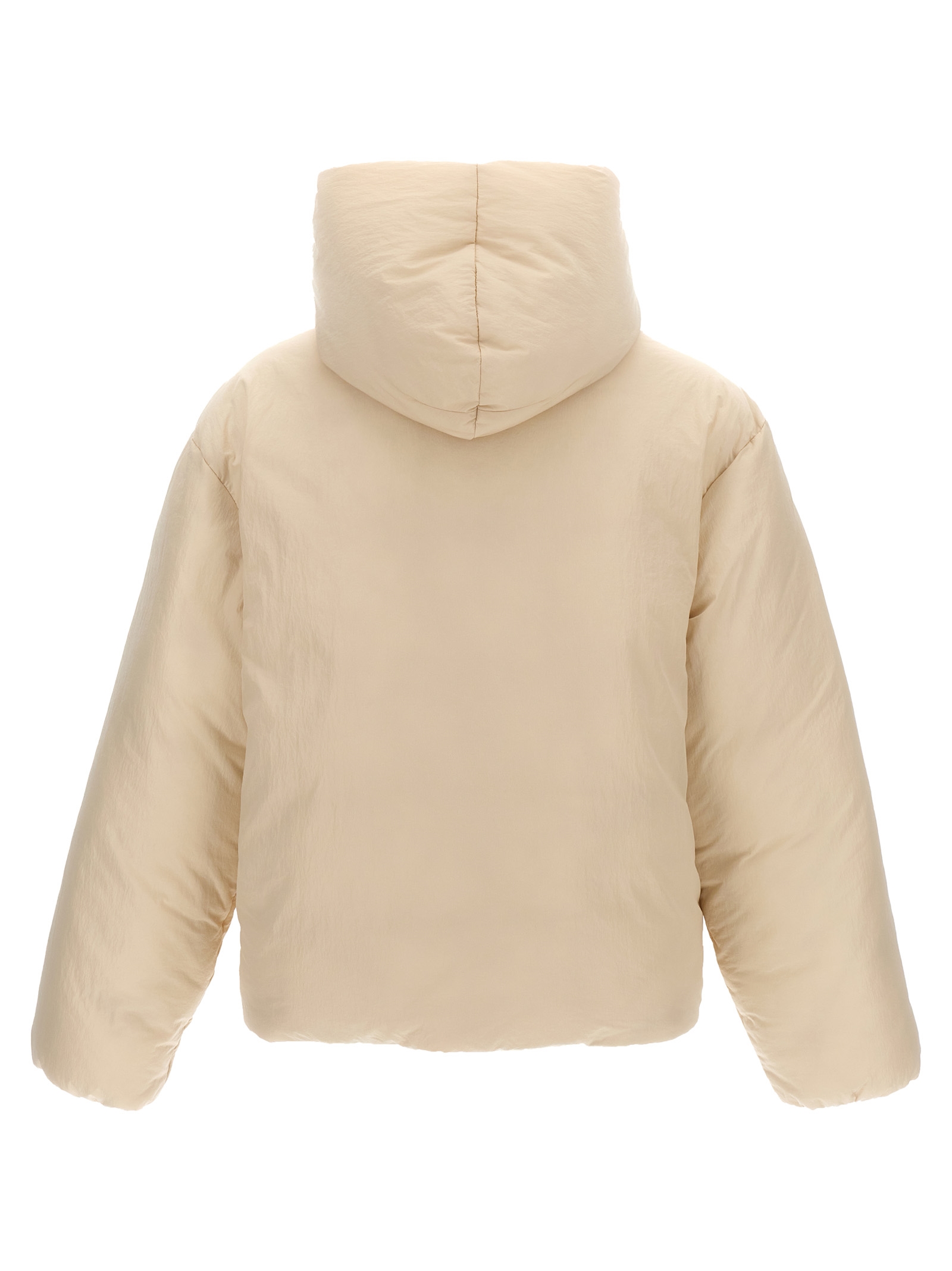 ‘La Doudoune’ padded nylon down jacket, zip and button closure, hood, long sleeves with elastic cuffs, adjustable drawstring at the hem, front ribbon logo label.